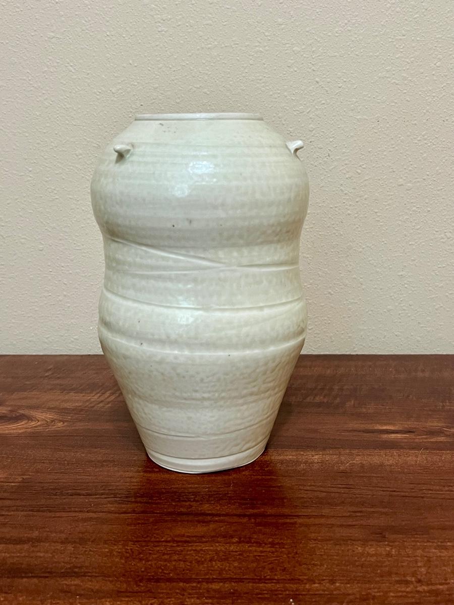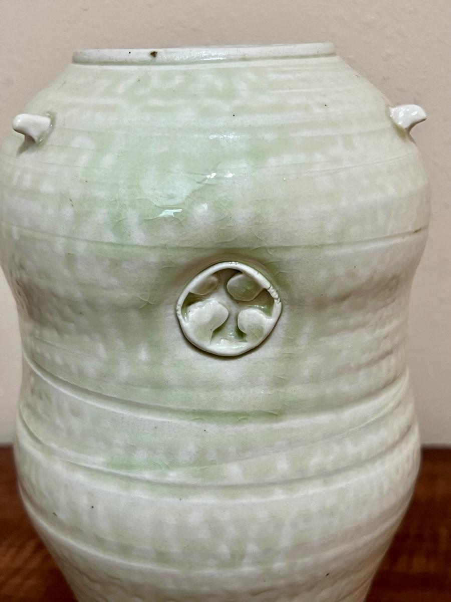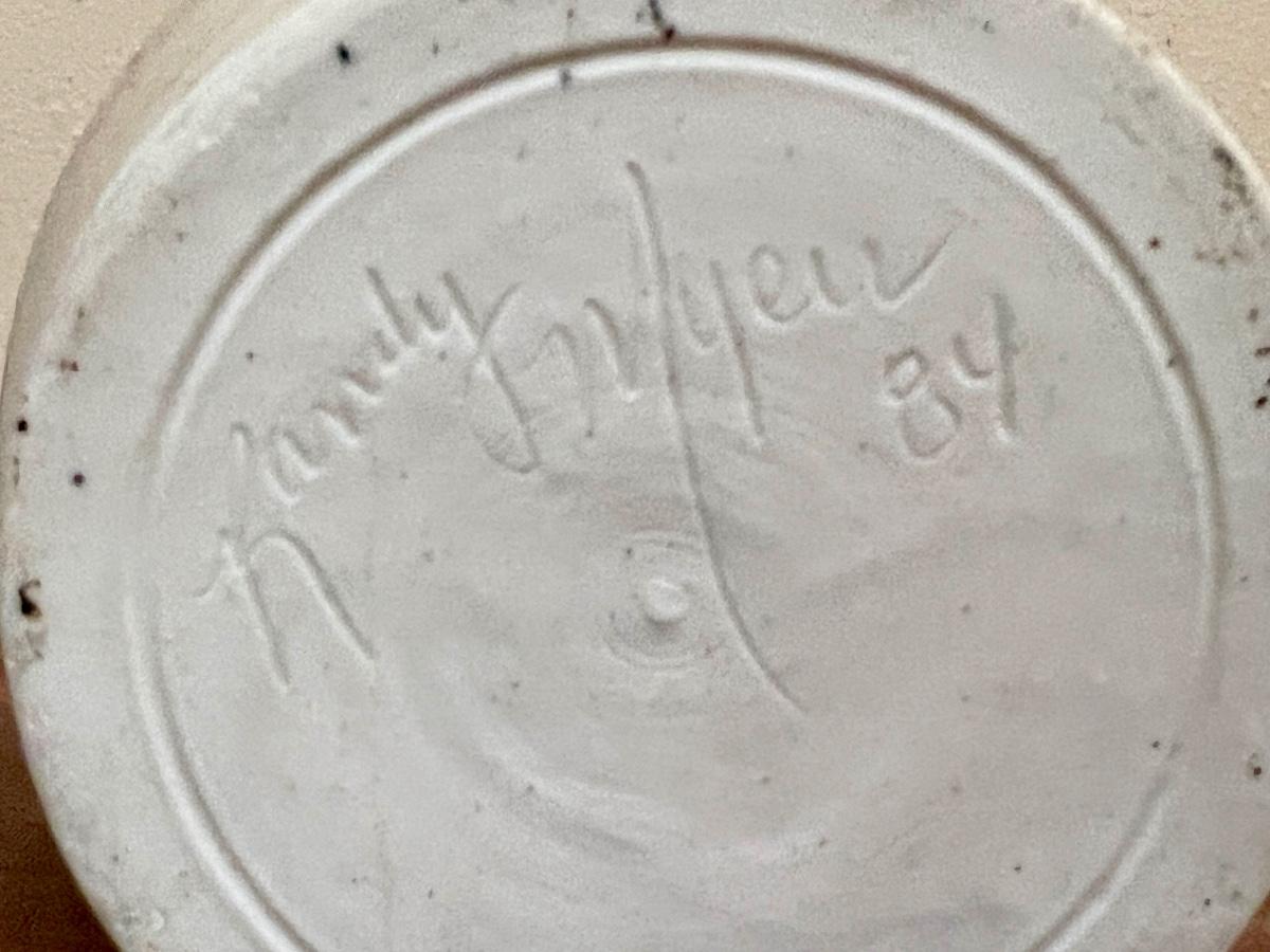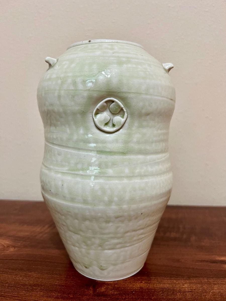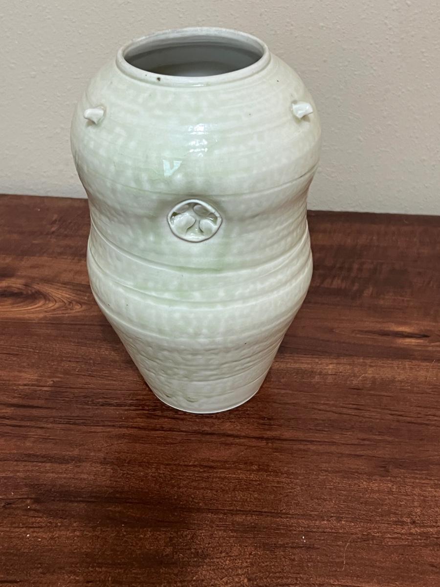 SIGNED Glazed Pottery. This has a slight greenish tint to it. Measures 9 inches tall.