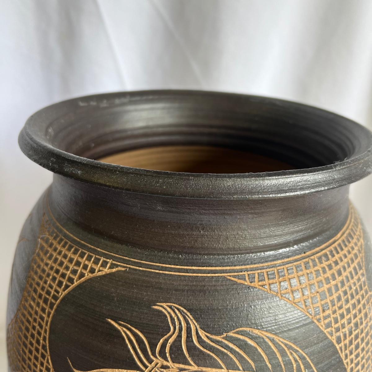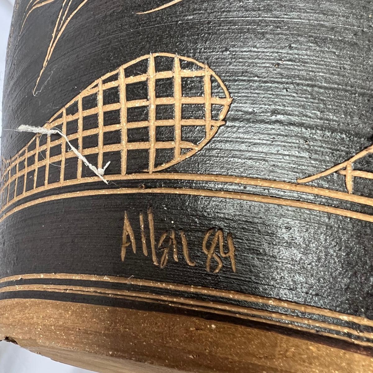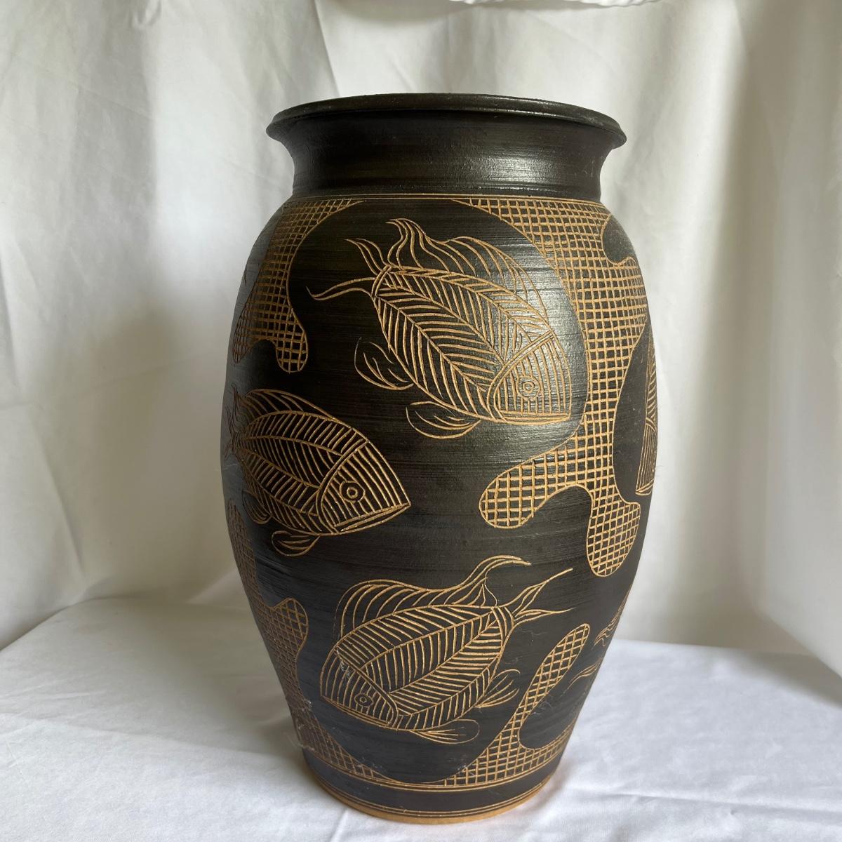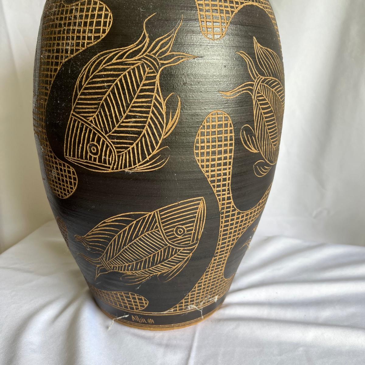 This floor vase is adorned with fishes that have been carved into the clay. Signed by the potter - Kenneth Allen.