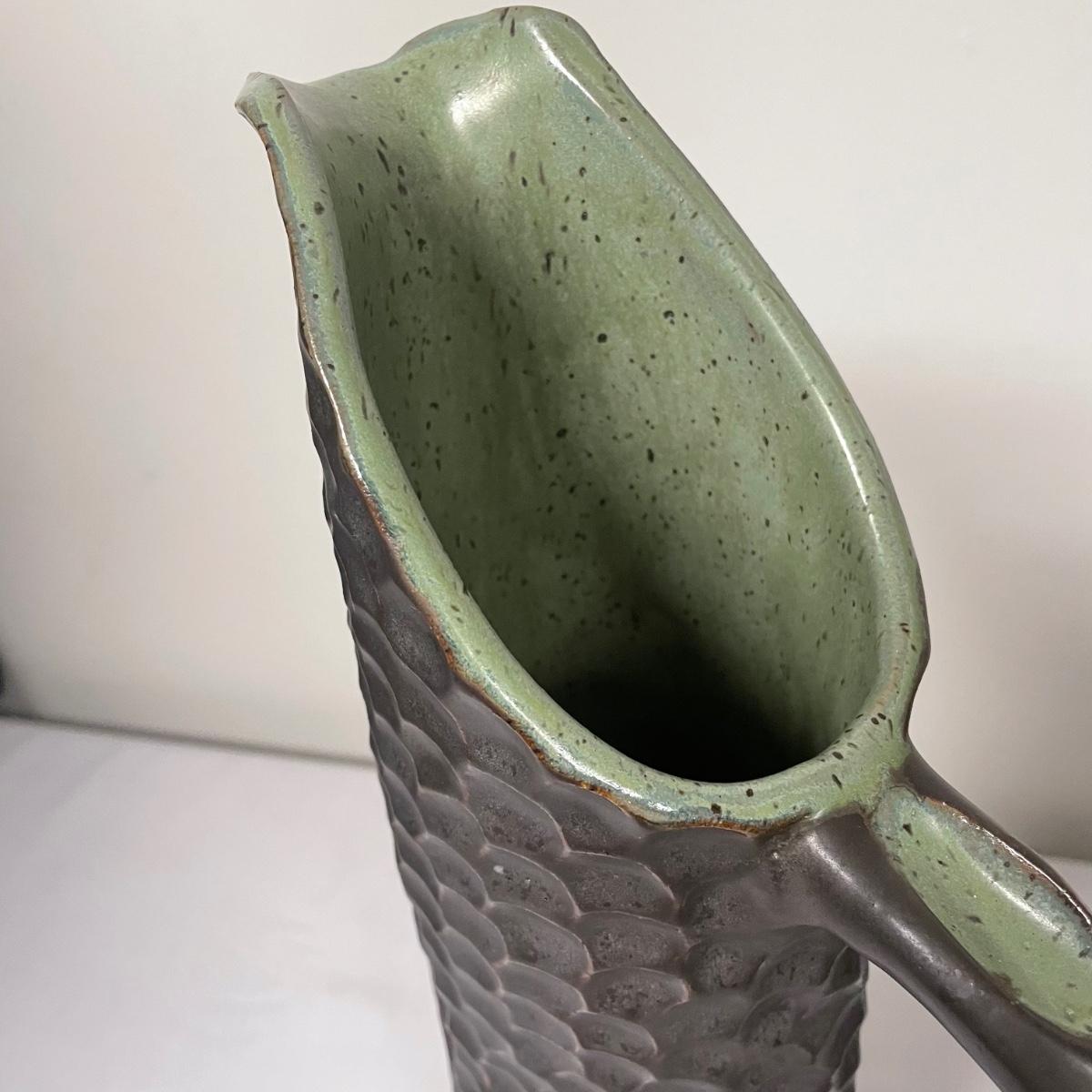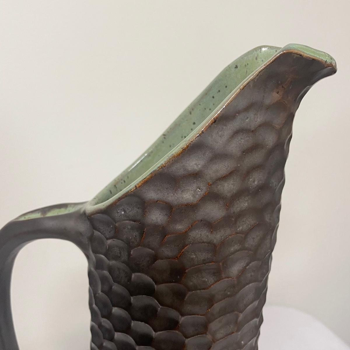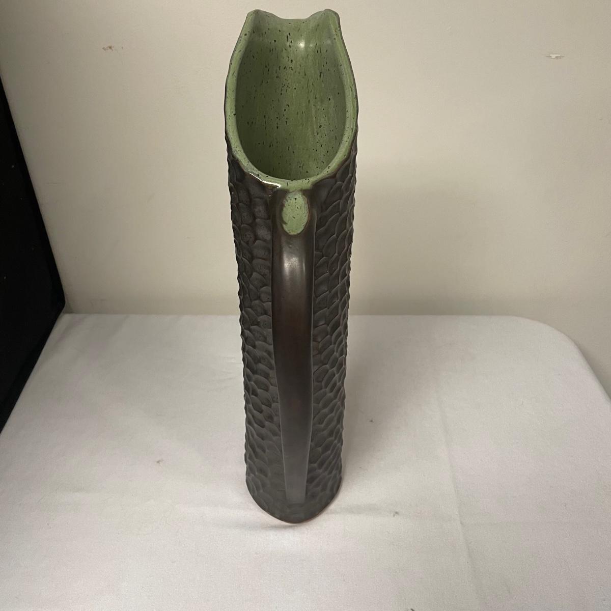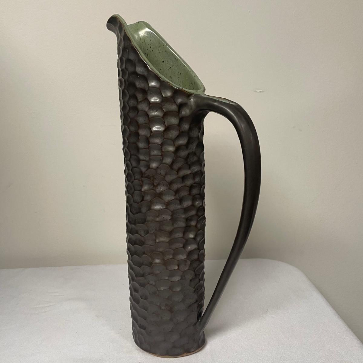 This very tall pitcher has been carved by the potter and signed VCR and decorated with a dark, slightly metallic brown glaze with a green speckled interior glaze.