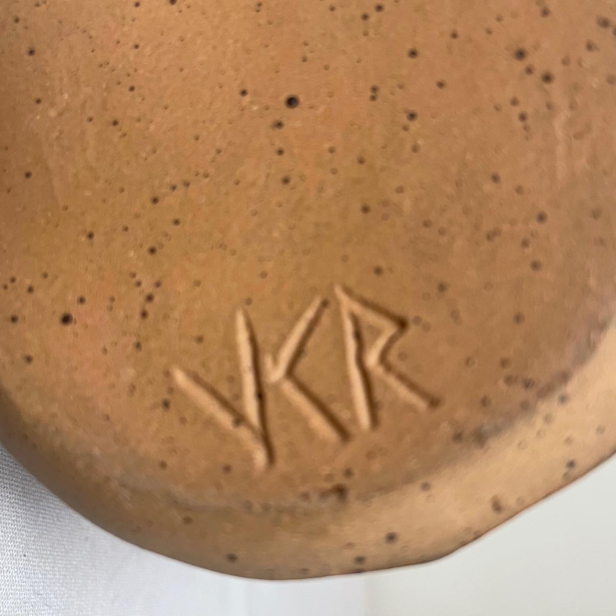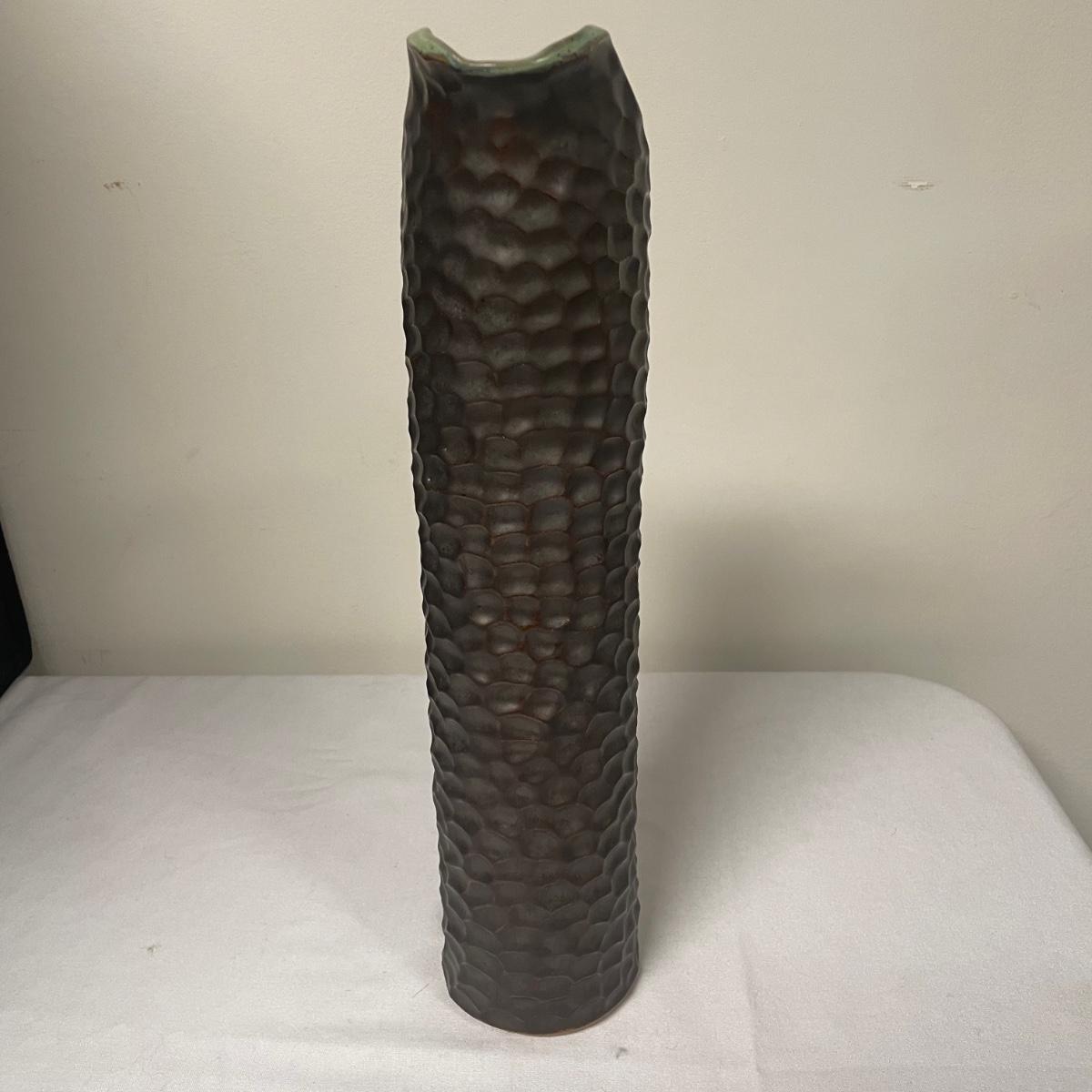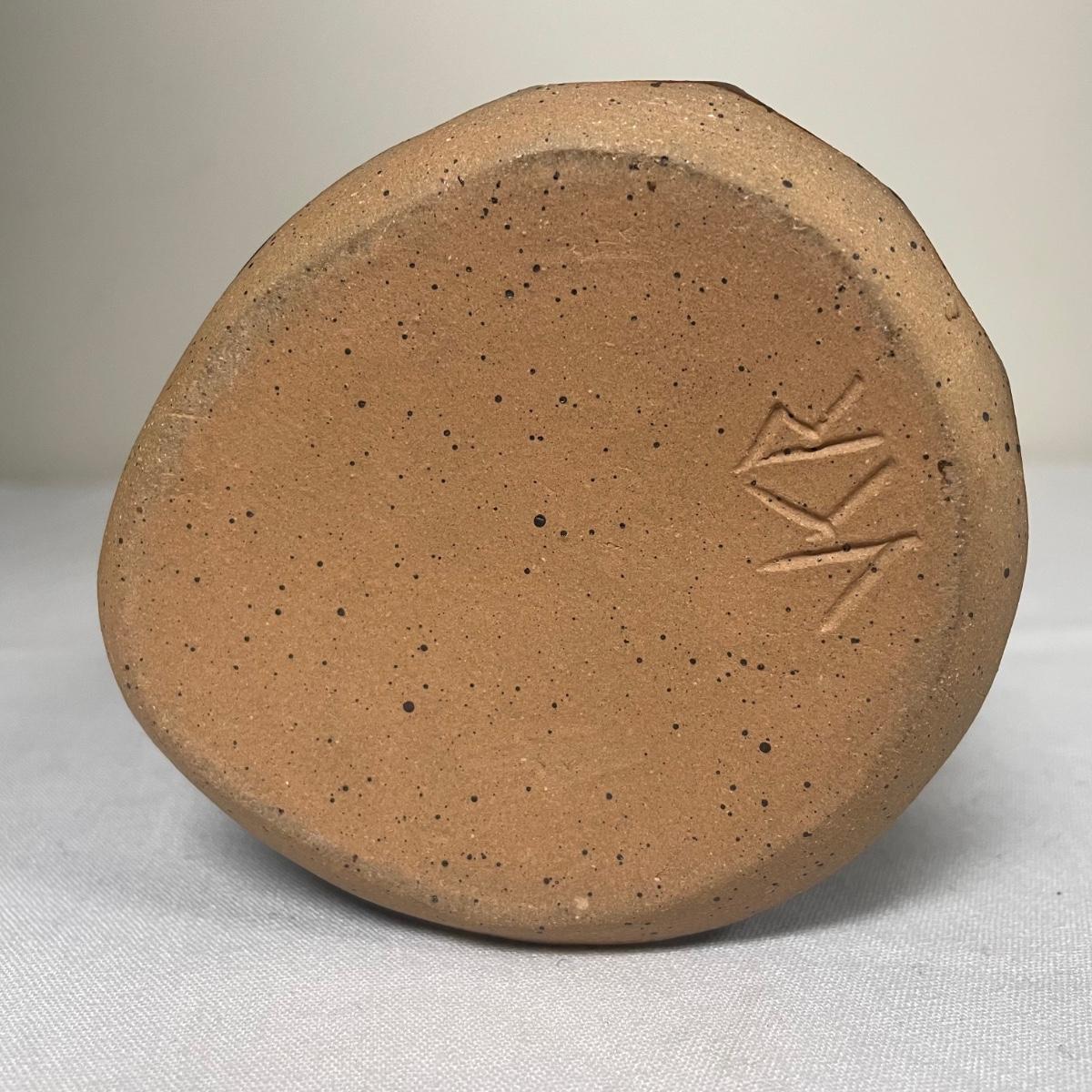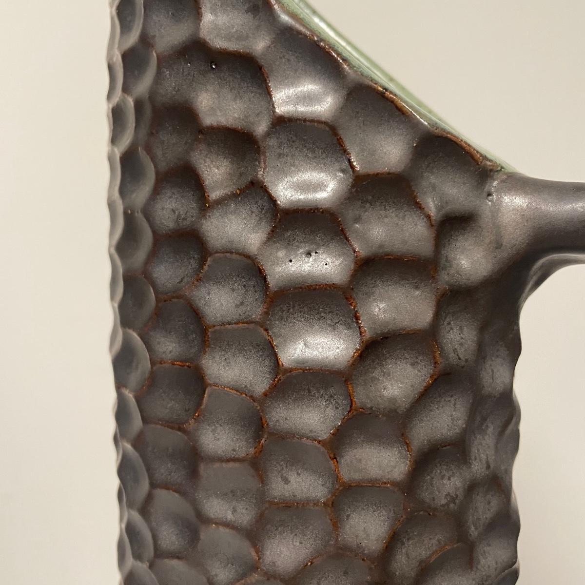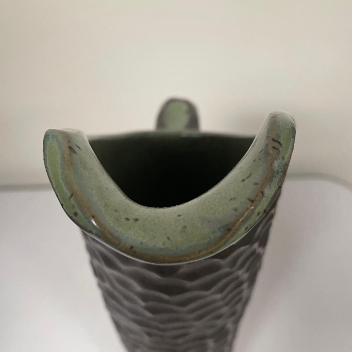 This very tall pitcher has been carved by the potter and signed VCR and decorated with a dark, slightly metallic brown glaze with a green speckled interior glaze.
