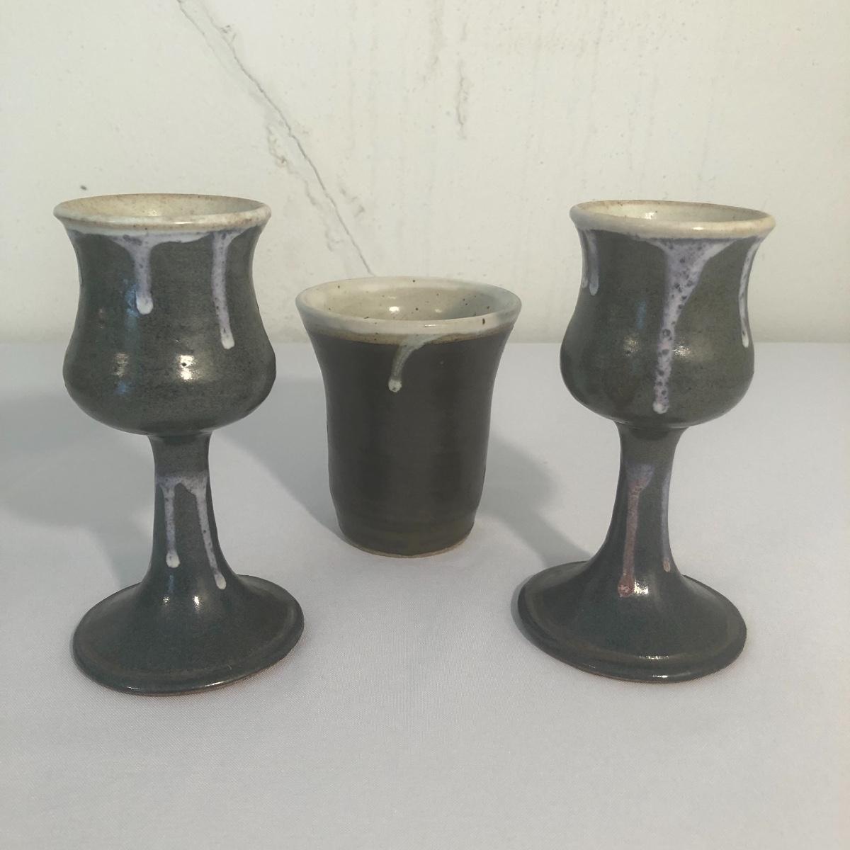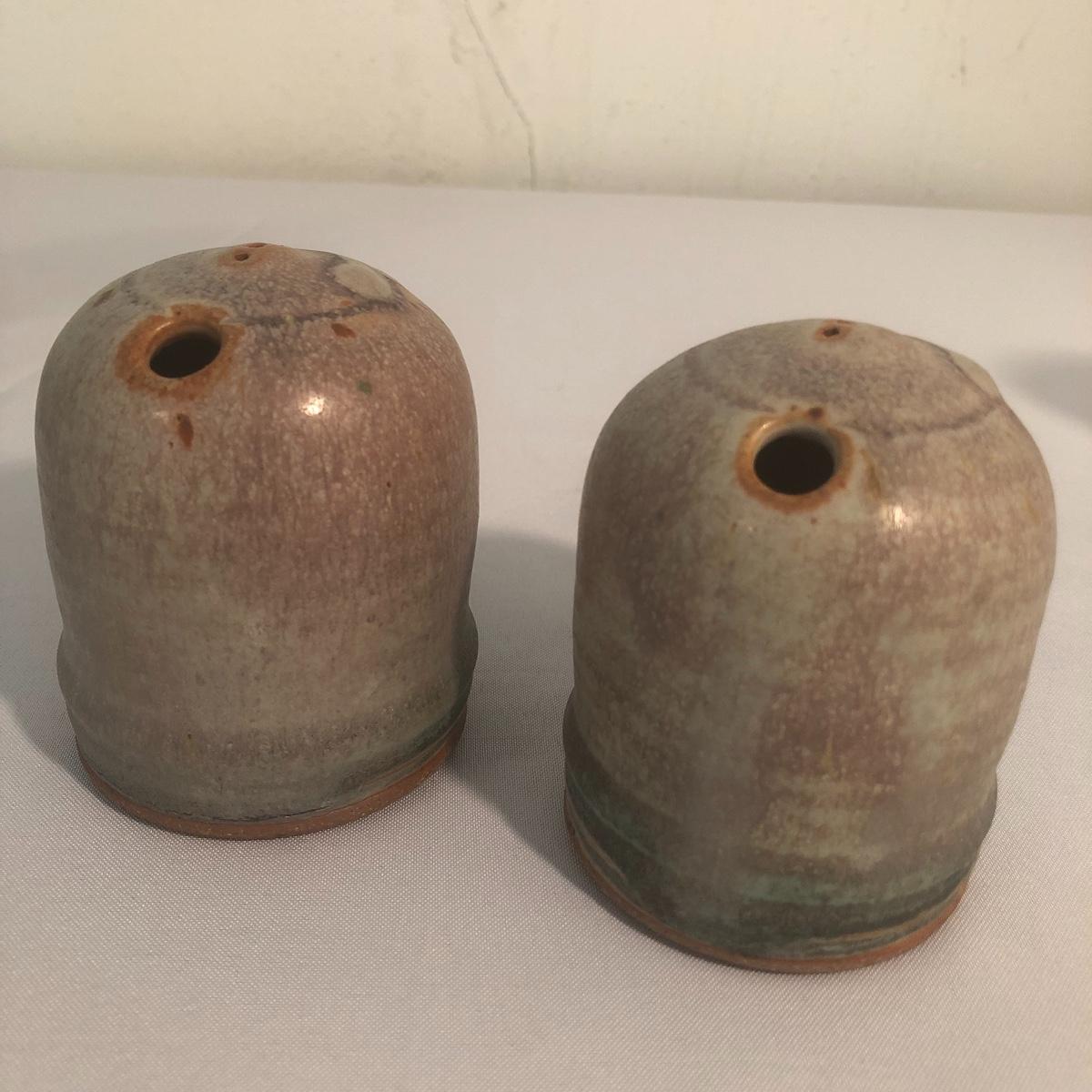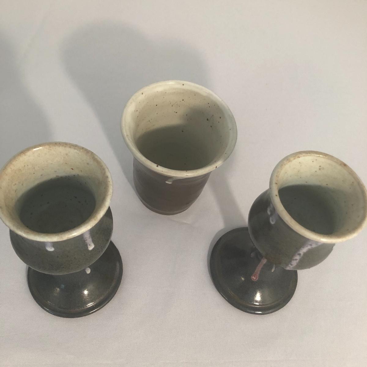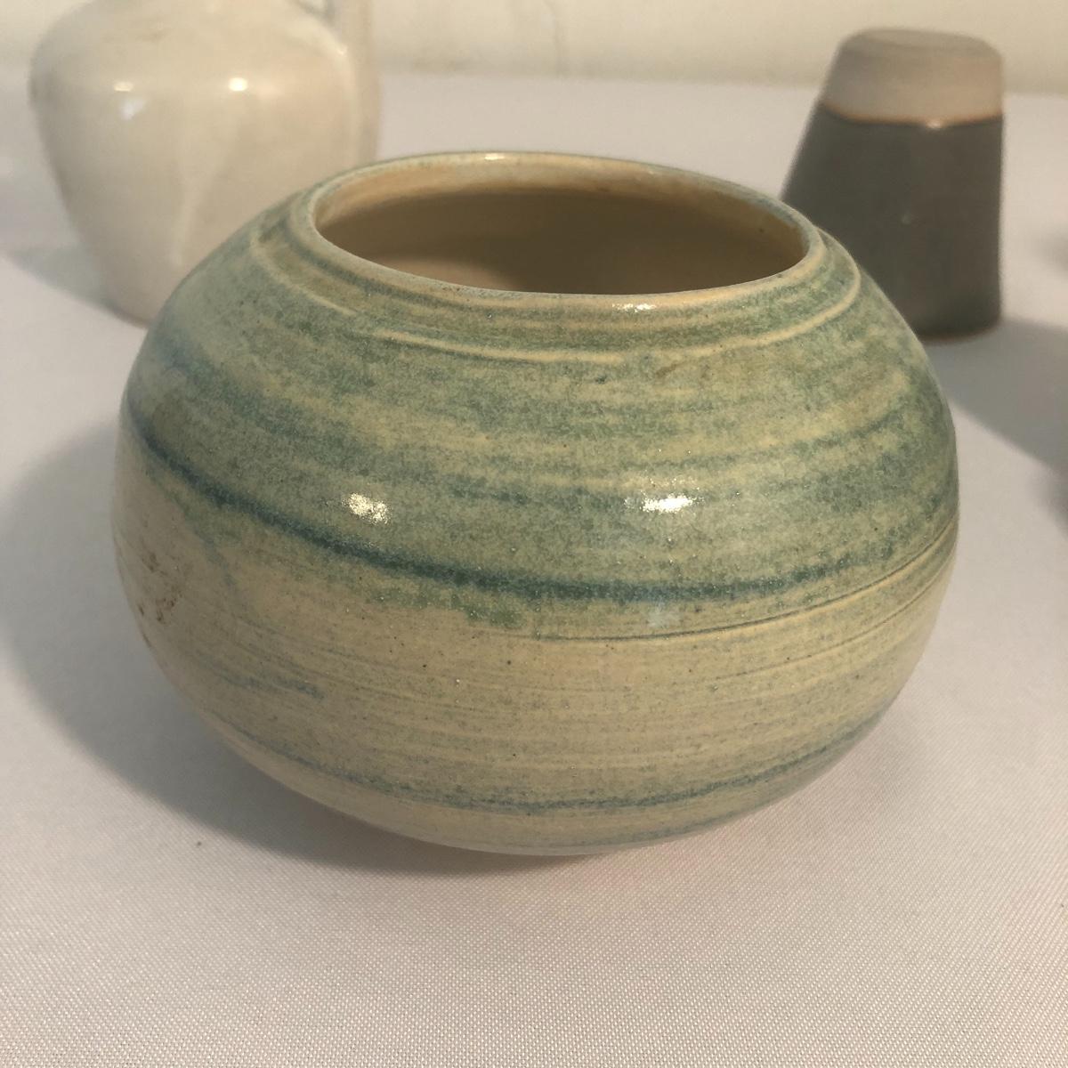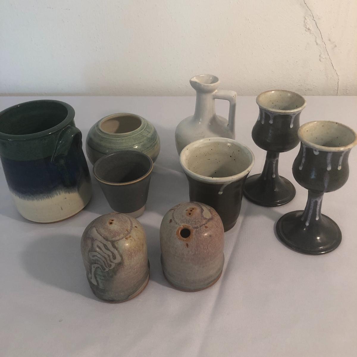 All but two of these nine pieces have the potters mark. The largest piece has some wadded paper stuck to the side that with some time and care should come off, it measures 4.5” d x 6” tall.
