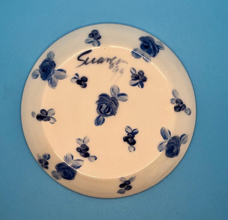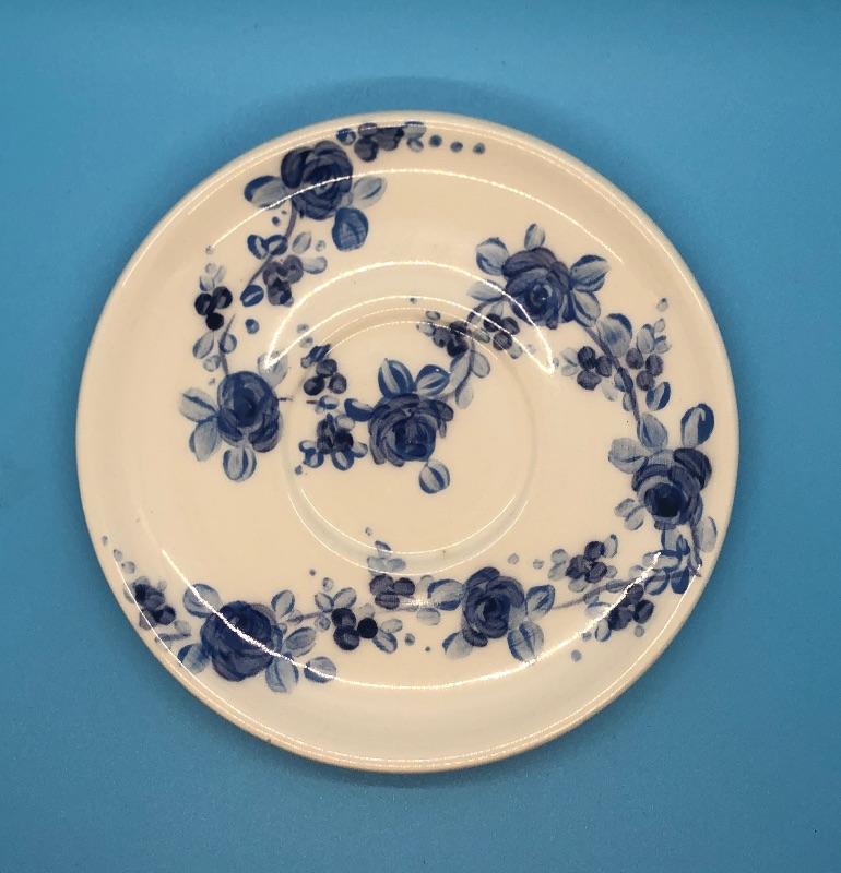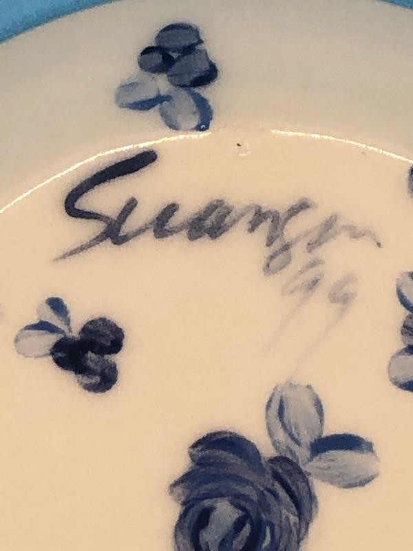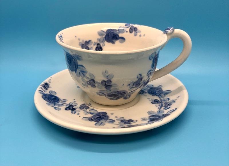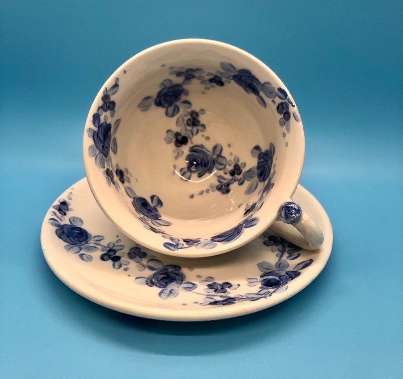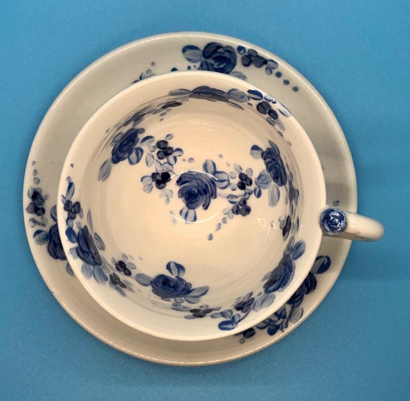 Signed hand painted ceramic teacup white with indigo blue flowers