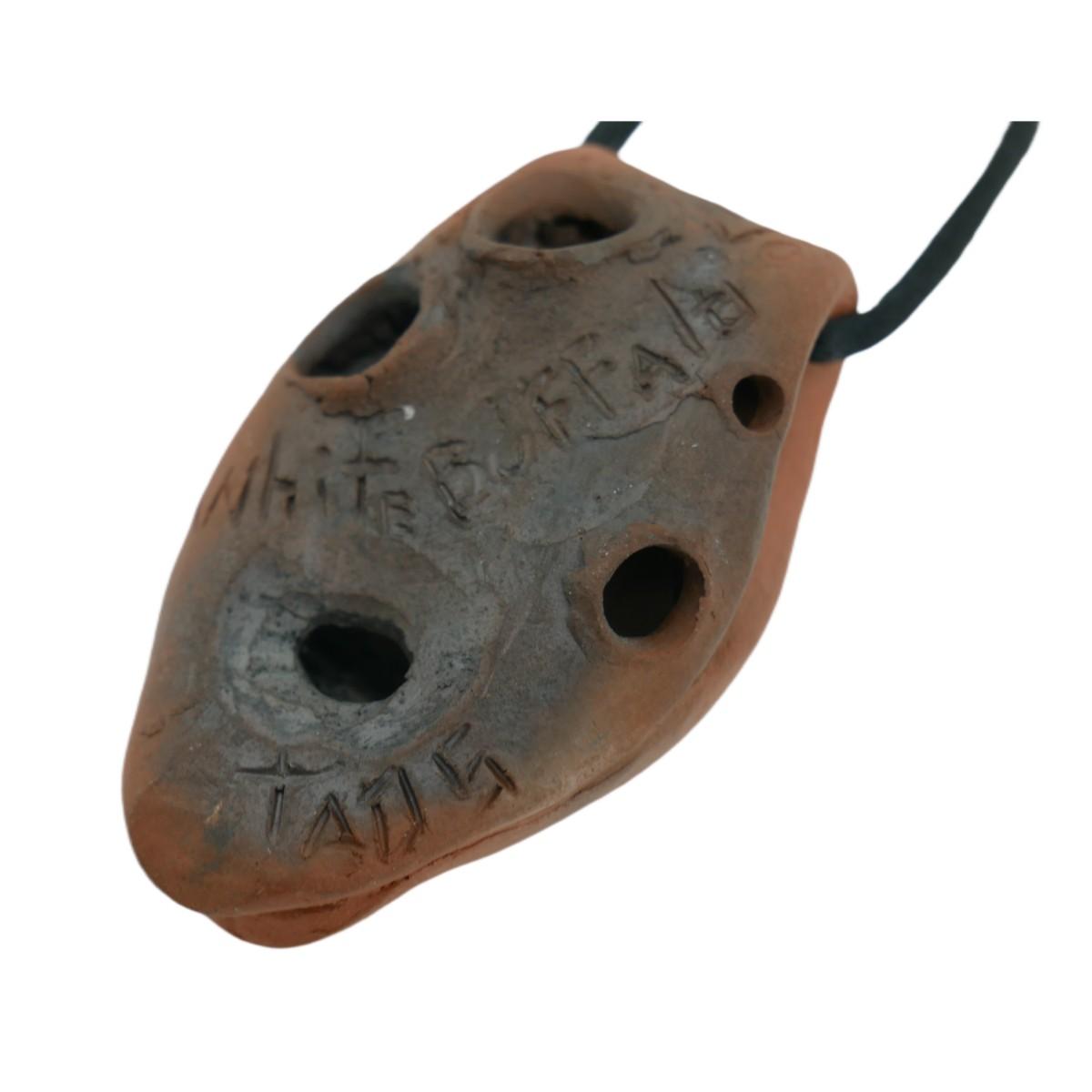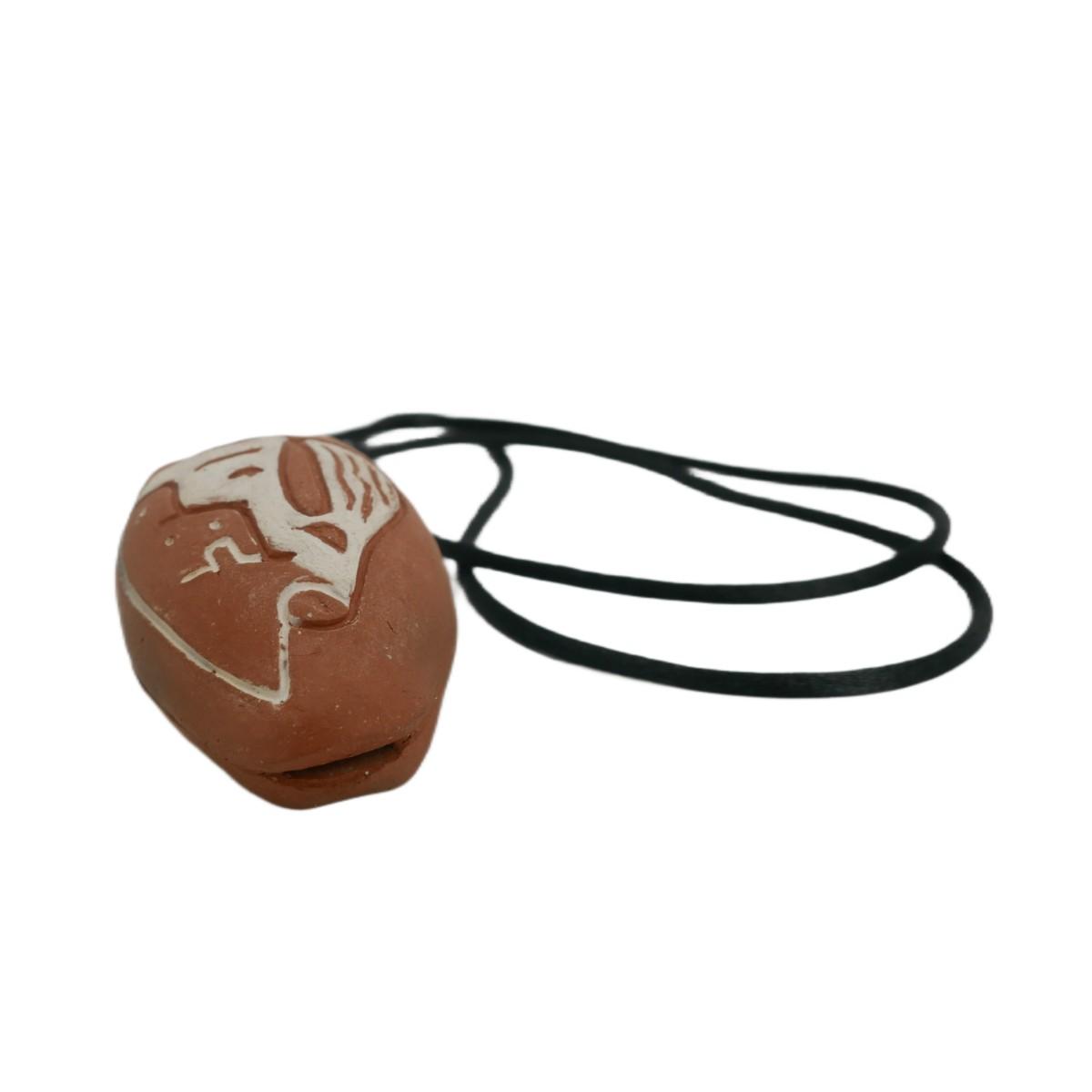 Handmade Taos Pueblo clay whistle flute stung on a cord necklace. Front depicts a buffalo and colored with white paint, back is signed "White Buffalo Taos". Attributed to the Puebo tribe of Taos, New Mexico. Piece measures 1.5" x 2.5", necklace is 26" and total weight is 25g.