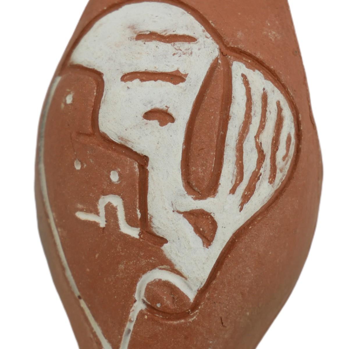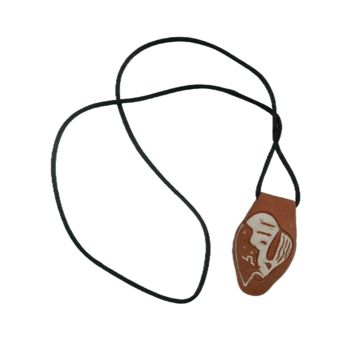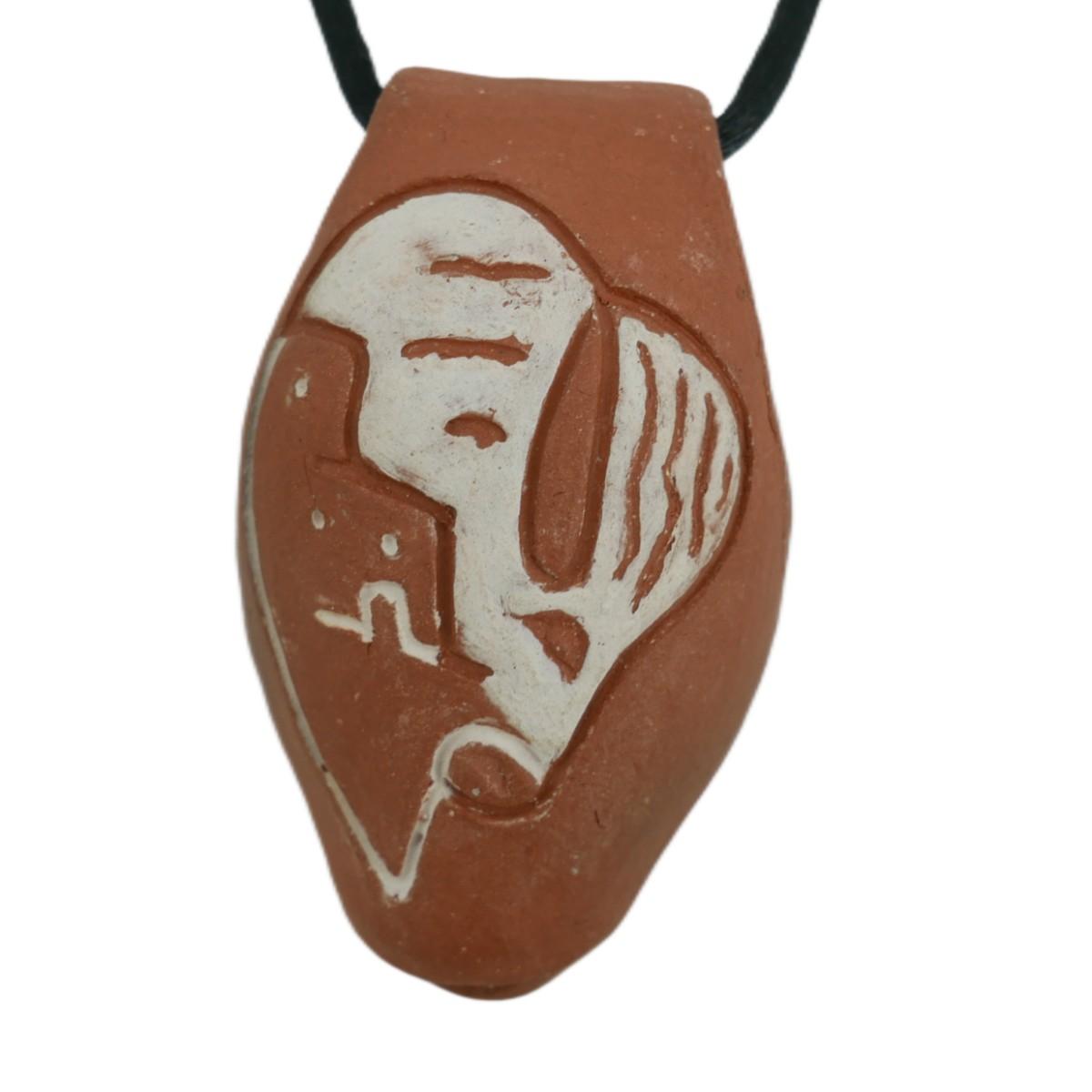 Handmade Taos Pueblo clay whistle flute stung on a cord necklace. Front depicts a buffalo and colored with white paint, back is signed "White Buffalo Taos". Attributed to the Puebo tribe of Taos, New Mexico. Piece measures 1.5" x 2.5", necklace is 26" and total weight is 25g.