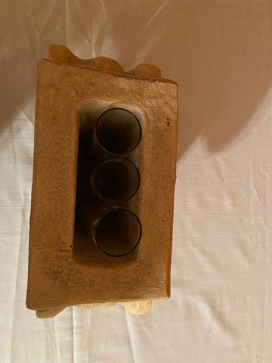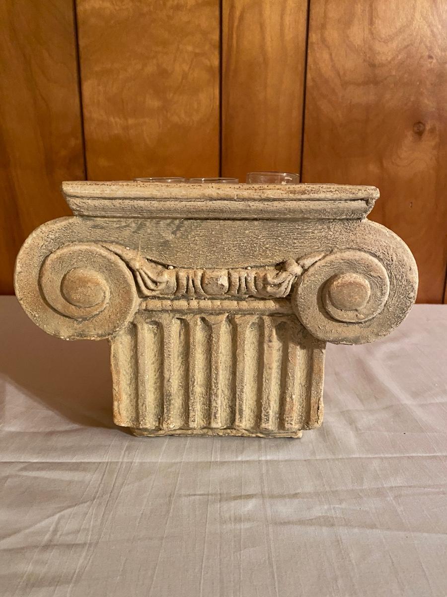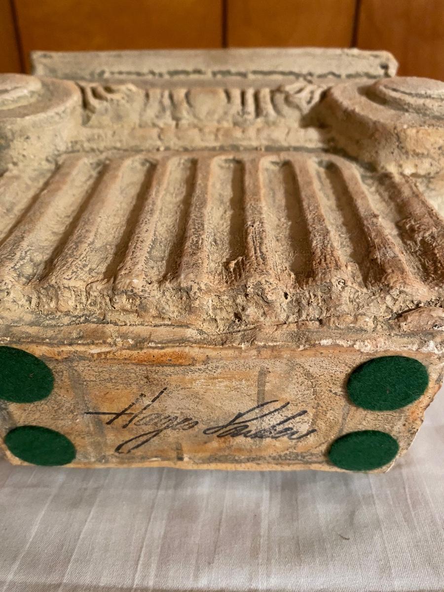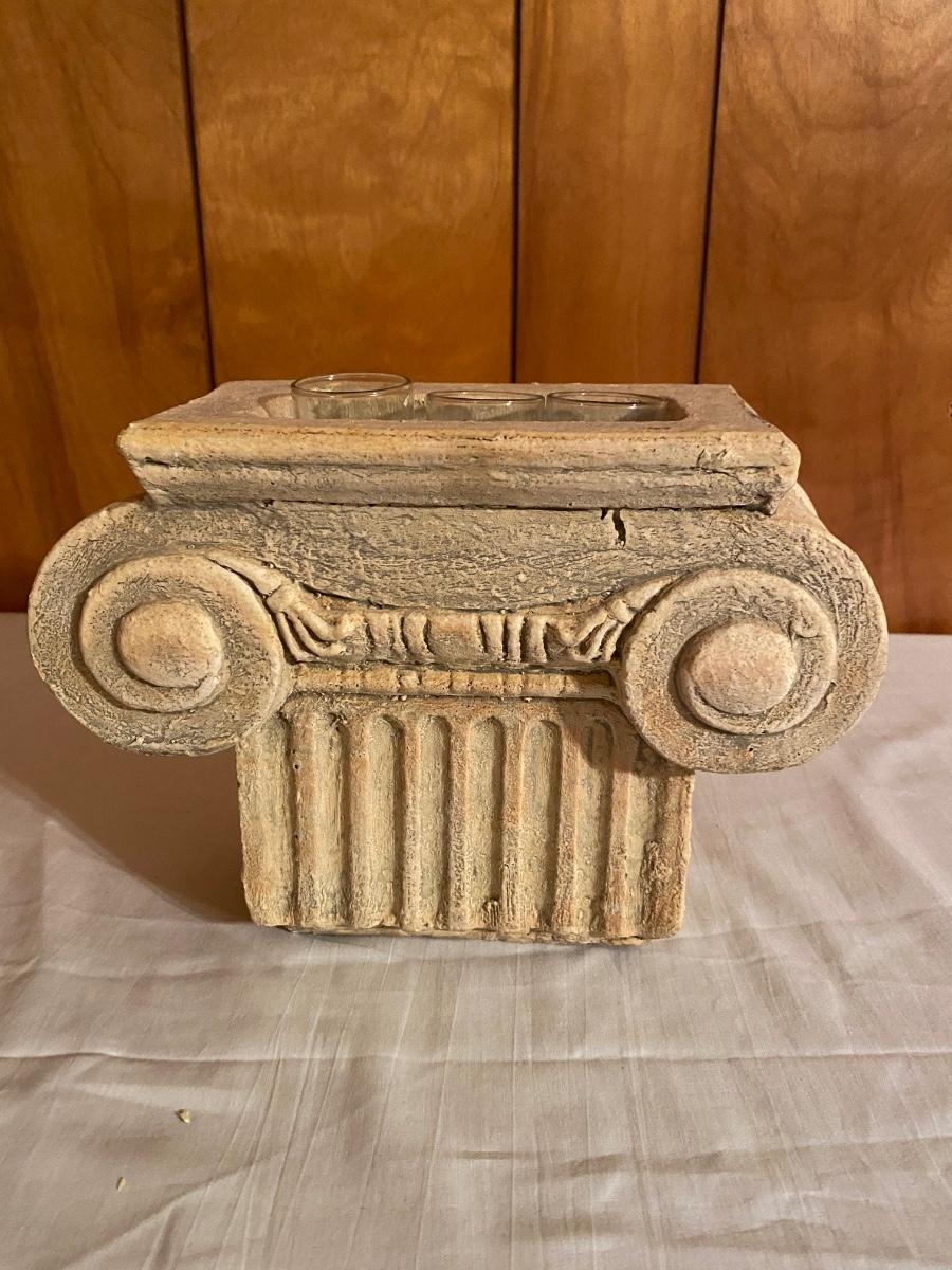 Signed Hayes Parker sculpted stone vase, Grecian style w/3 glass inserts for flowers. Approx 9”w x 6-3/4”h 3-3/4”d