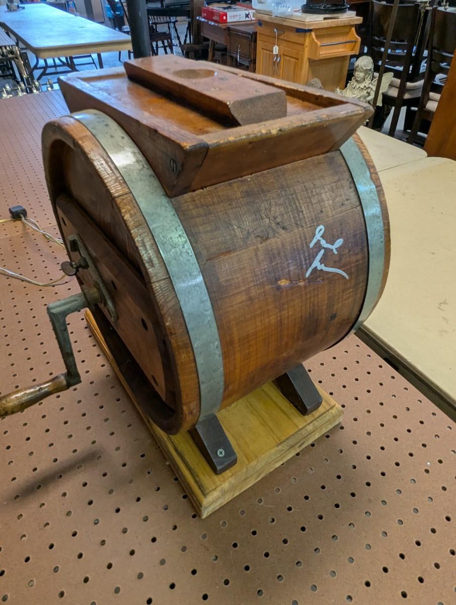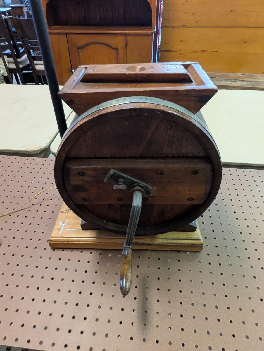This Antique Original Early Wooden Table Top Barrel Style Butter Churn is a unique piece of Americana kitchen equipment. Made of wood, this hand crank churn features a barrel style design that adds a touch of nostalgia to any kitchen. Its originality adds to its charm, making it a valuable addition to any antique or primitive collection. Perfect for those who appreciate authentic, vintage pieces with a touch of history and character.