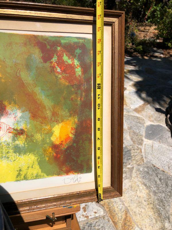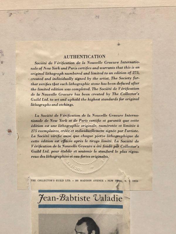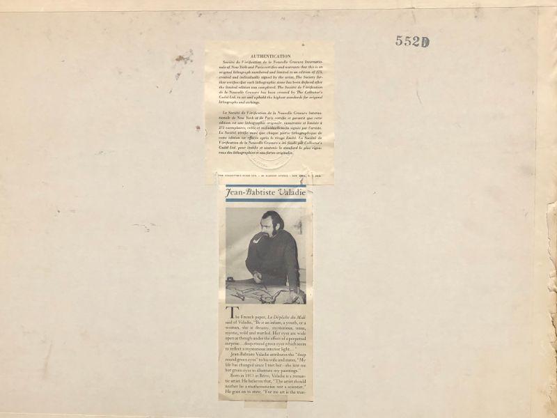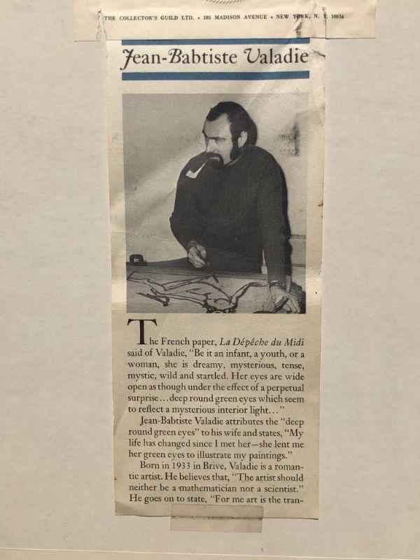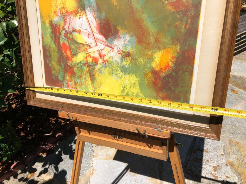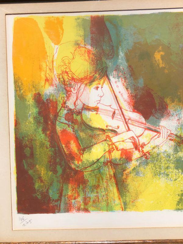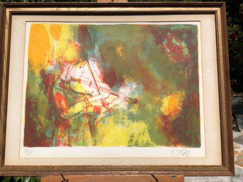 A beautiful example of Jean-Babtiste Valadie's work. Background is quintessential Valadie, with a dramatic multi-color effect. Girl playing violin. Signed and numbered lithograph. In very good condition.
