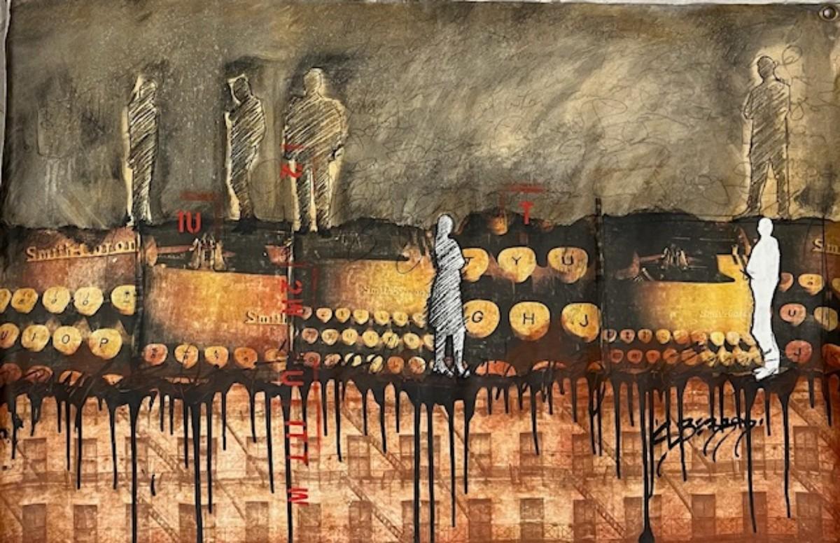 This piece is believed to be mixed media/acrylic on canvas, 40" L x 20" W. This piece is unframed, and has been rolled for storage.