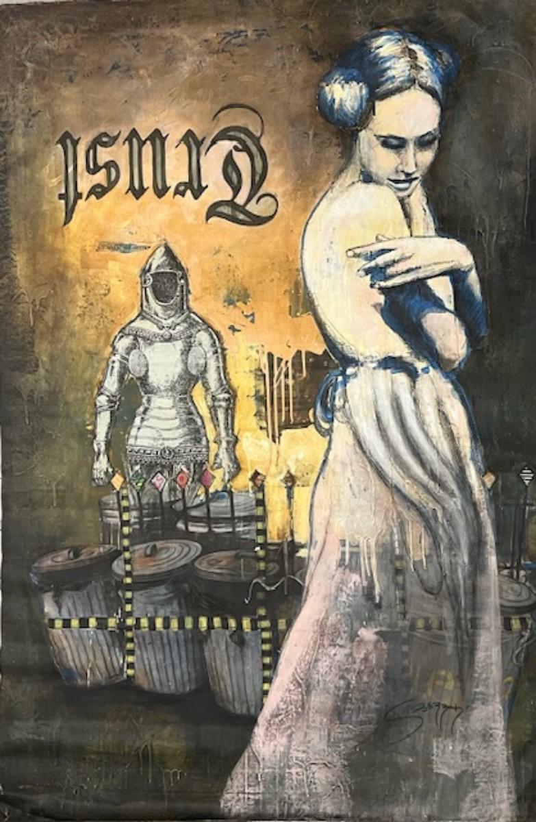 “Trust.” This piece is original. This piece is mixed media/acrylic on canvas. 53" L x 35" W. This piece is unframed, and has been rolled for storage.