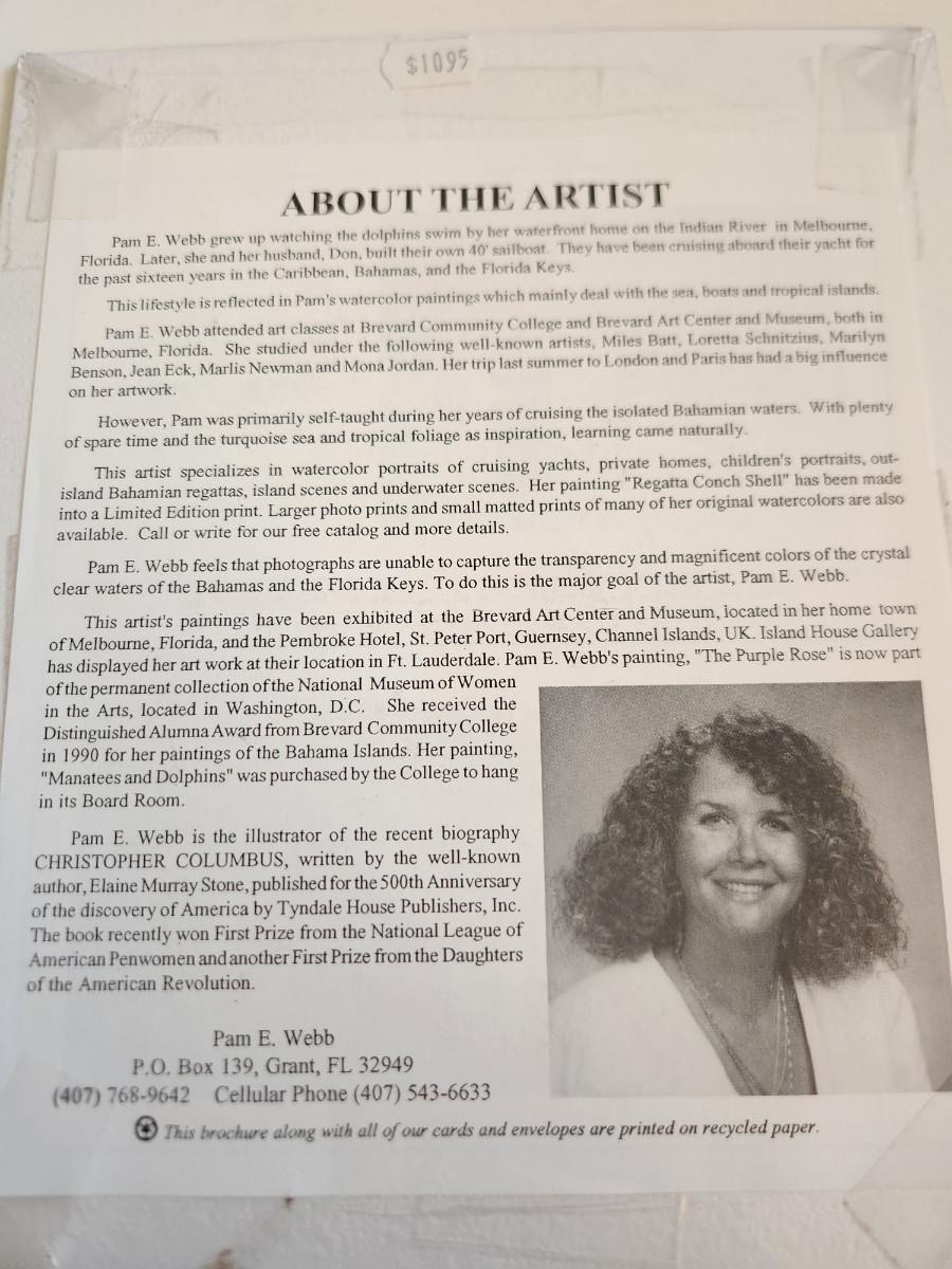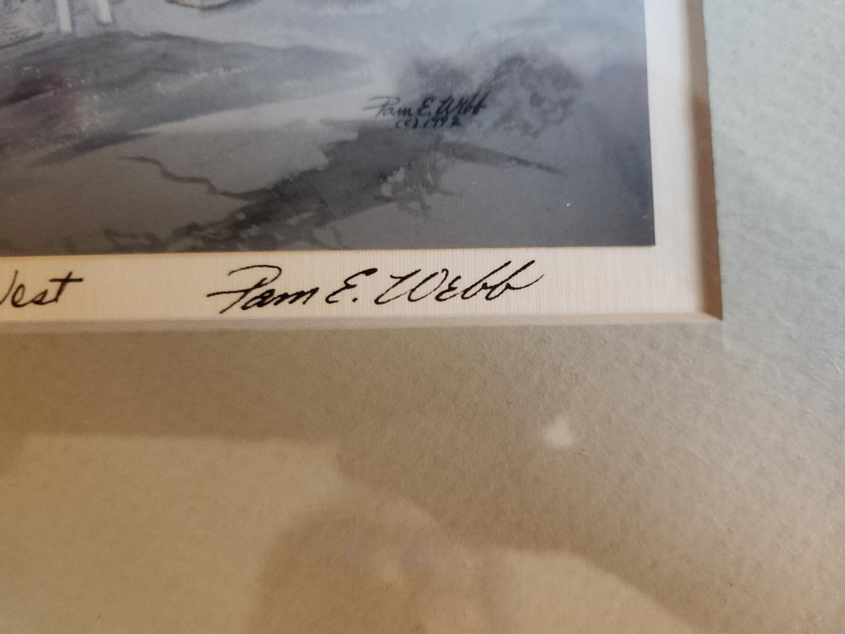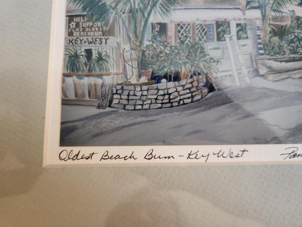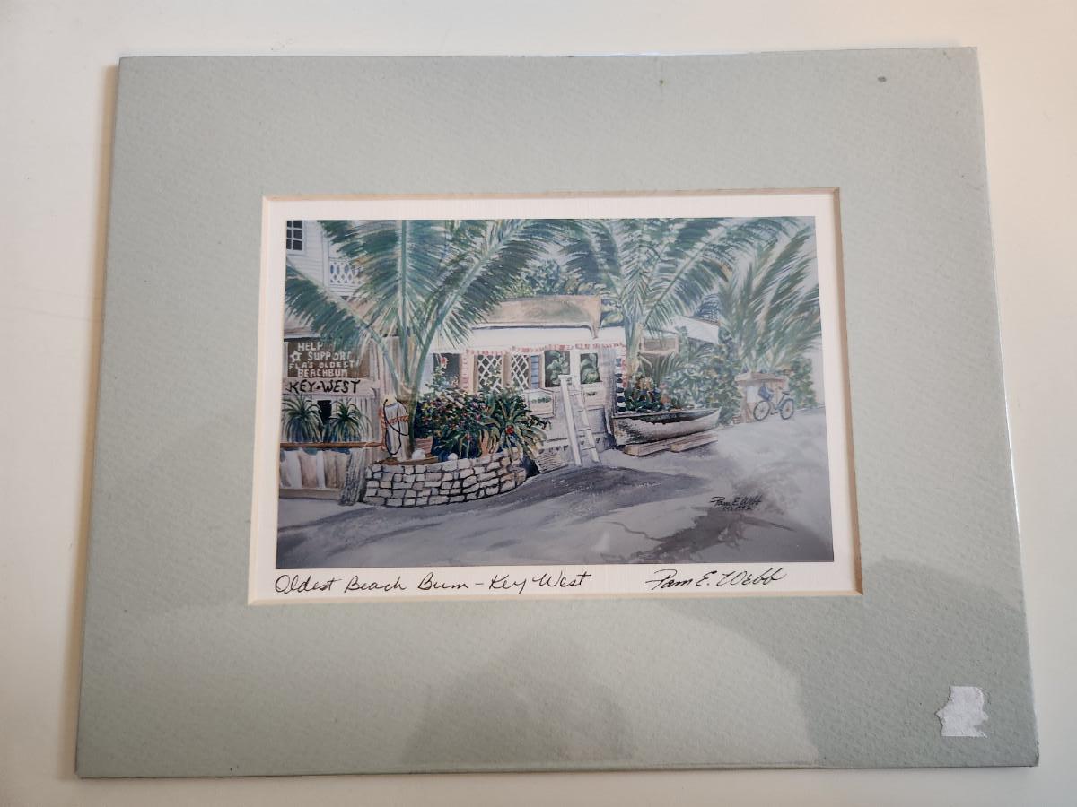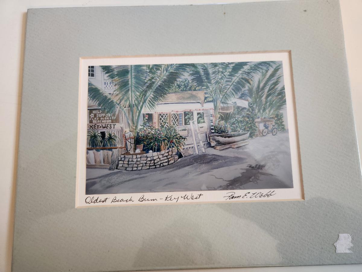 This auction lot is for a Signed Key West Print by Pam E. Webb. This print is entitled "Oldest Beach Bum - Key West. A nice print, well-matted and ready to be framed. Complete information regarding the artist is on the verso. Measures about 8X10-inches.