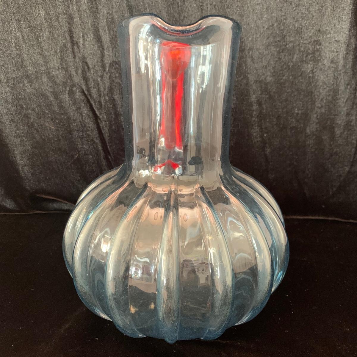Blue glass pitcher with a red handle. Measures approximately 7”D x 9”H. It is signed “Kosta Boda A. Weihlstrom”.