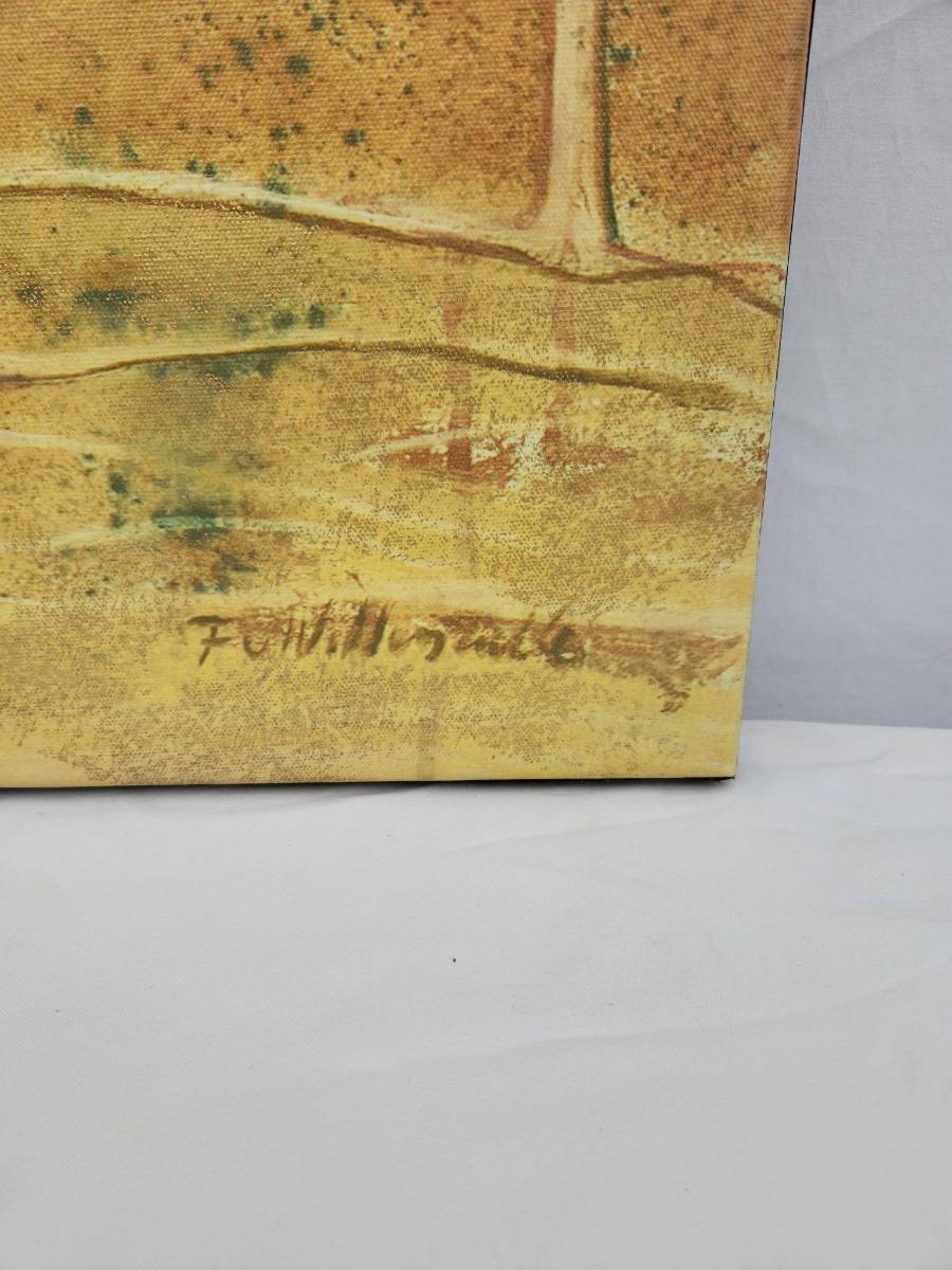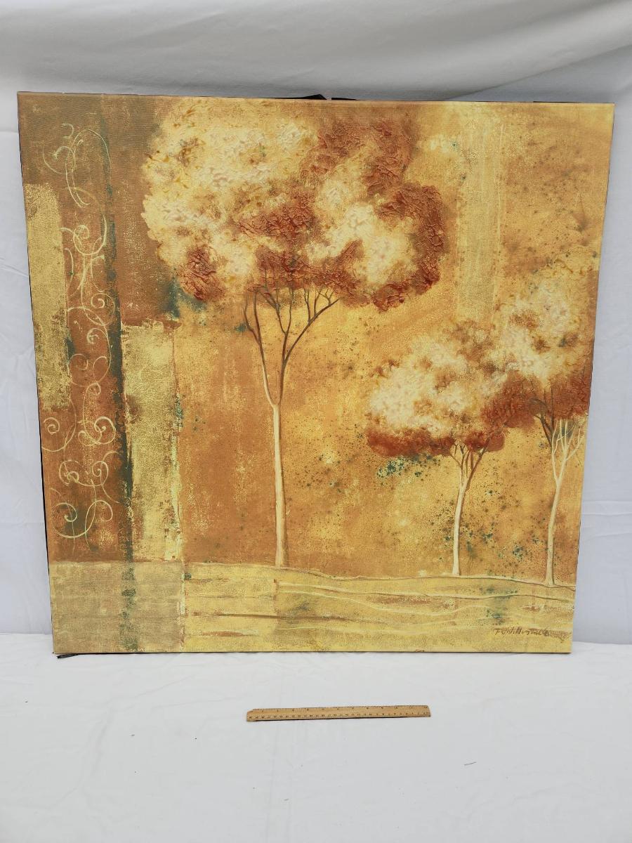 A signed square-shaped painting featuring a serene landscape with trees in warm earthy tones. The signature located at the lower right corner reads 'Fellini SMG'. The textured design incorporates abstract elements alongside the depiction of nature, creating a visually dynamic scene. Medium unknown, likely acrylic or mixed media, on canvas.