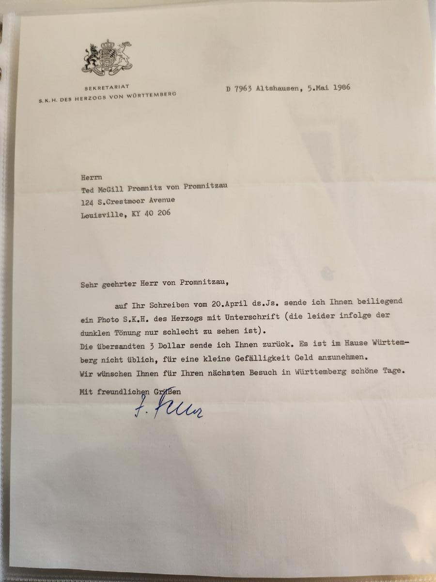 This auction lot is for two Signed Letters and an Autographed Photo from Karl Herzogs Von Wurttemberg with Envelopes. One letter is dated May 5, 1986, the other is dated January 1987. The letters are either in German or Austrian - we have not translated. Fr. McGill was quite fluent in the Germanic languages.