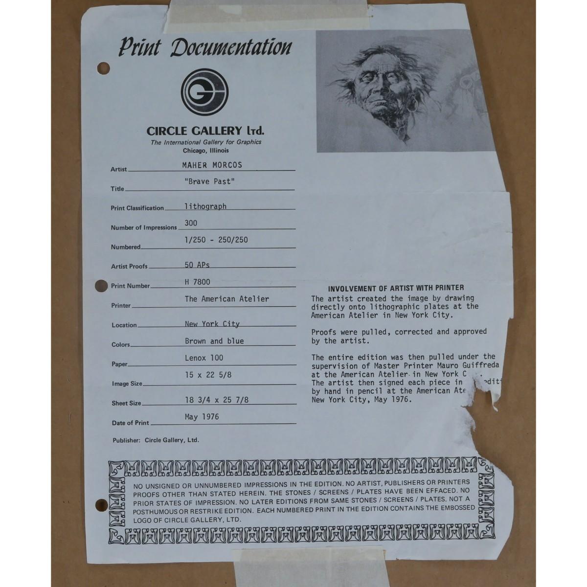 Limited edition "Brave Past" lithograph by Maher Morcos. Hand-signed by artist and numbered 9/250. Art depicts two Native American. Printed 1976. Matted and framed under glass. Art is in excellent condition, frame has some wear. Art measures 22.5" x 15", total frame measures 32.5" x 25.5" x 0.75". (A60) *This is a large piece, reach out to us for a shipping quote prior to placing a bid*