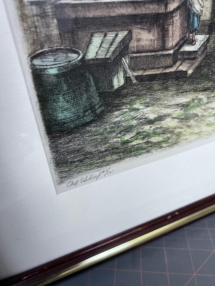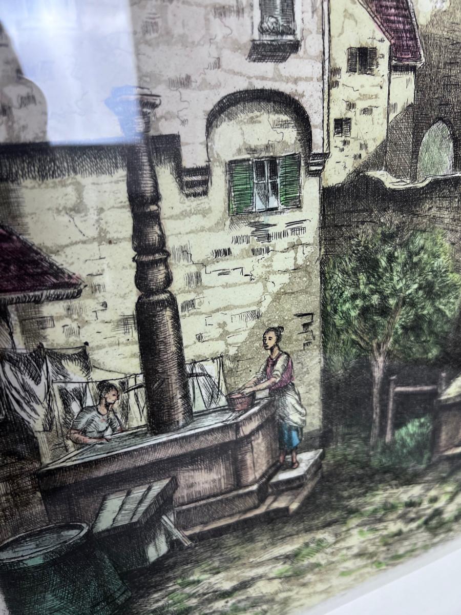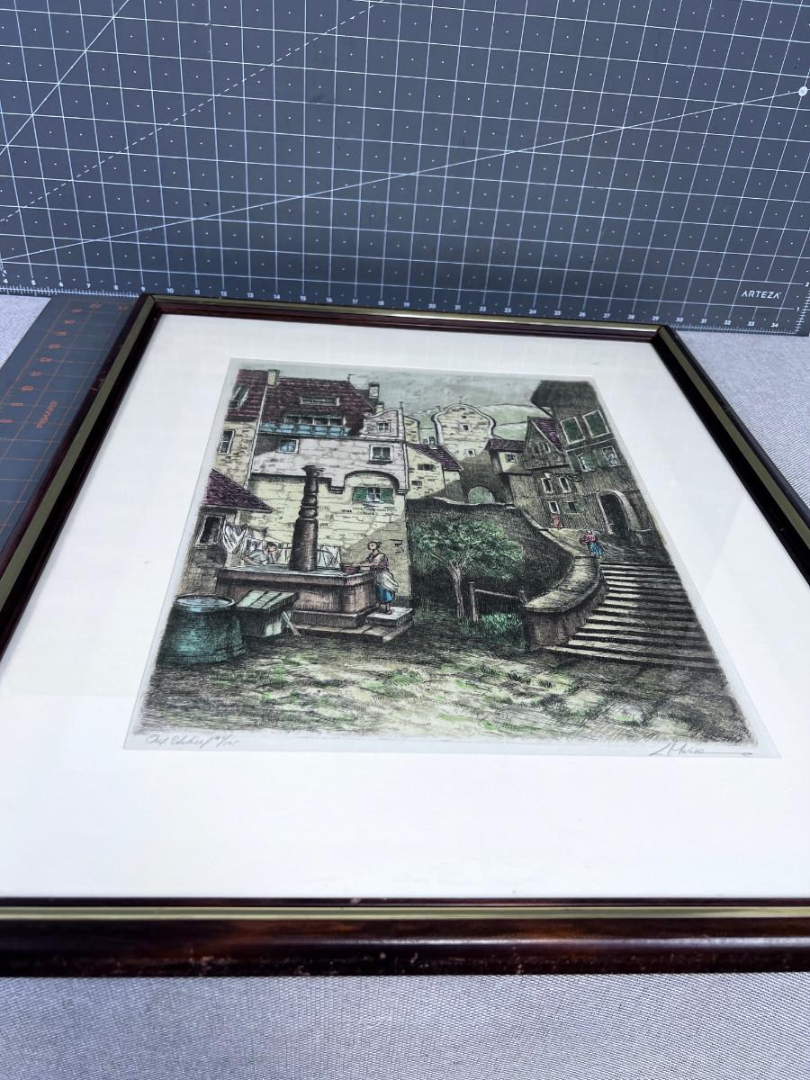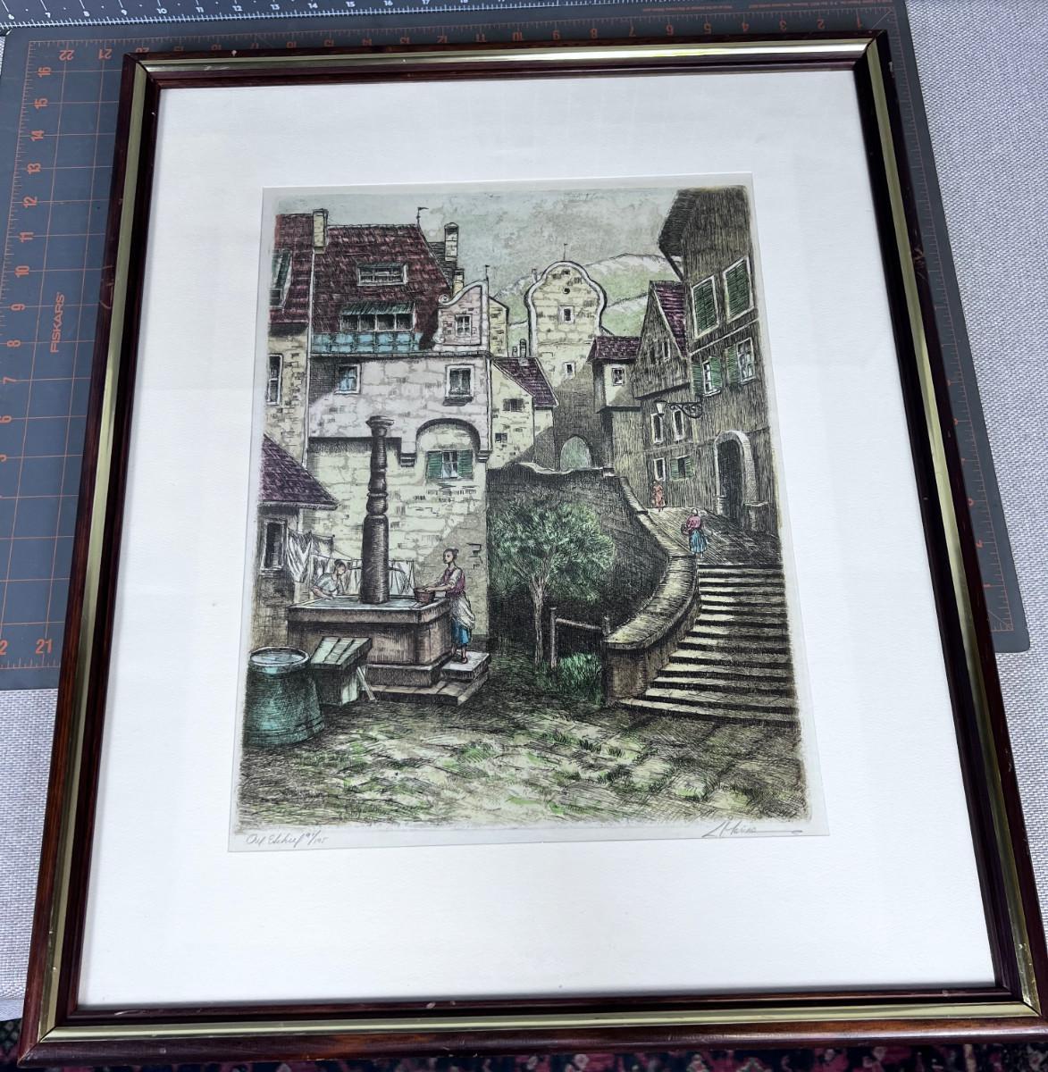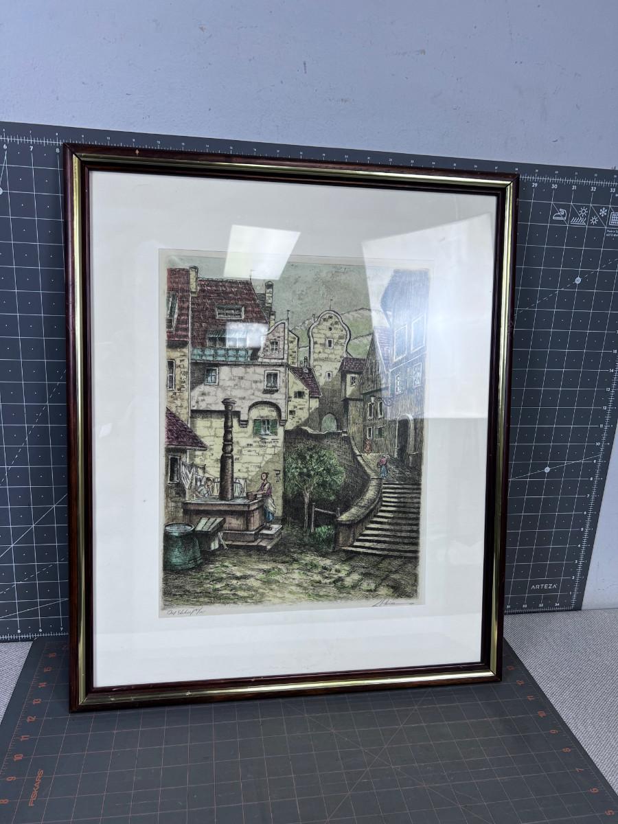 Signed Lithograph Italian or German Village Framed