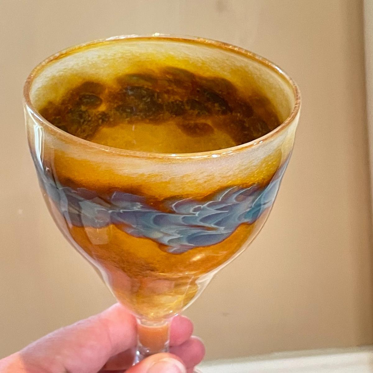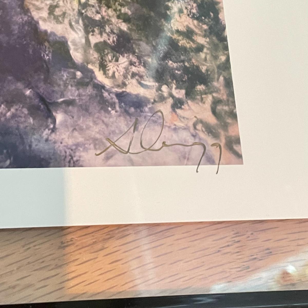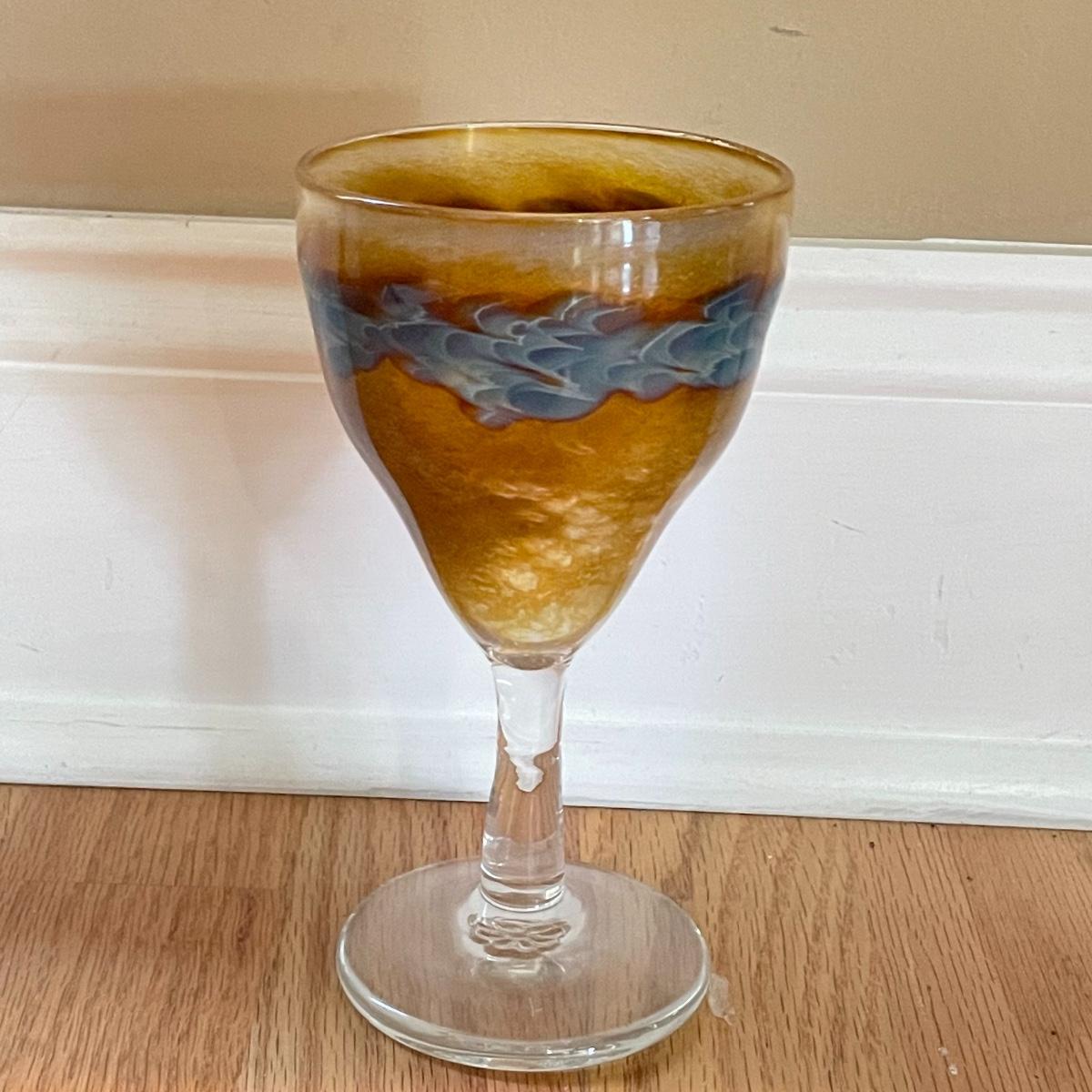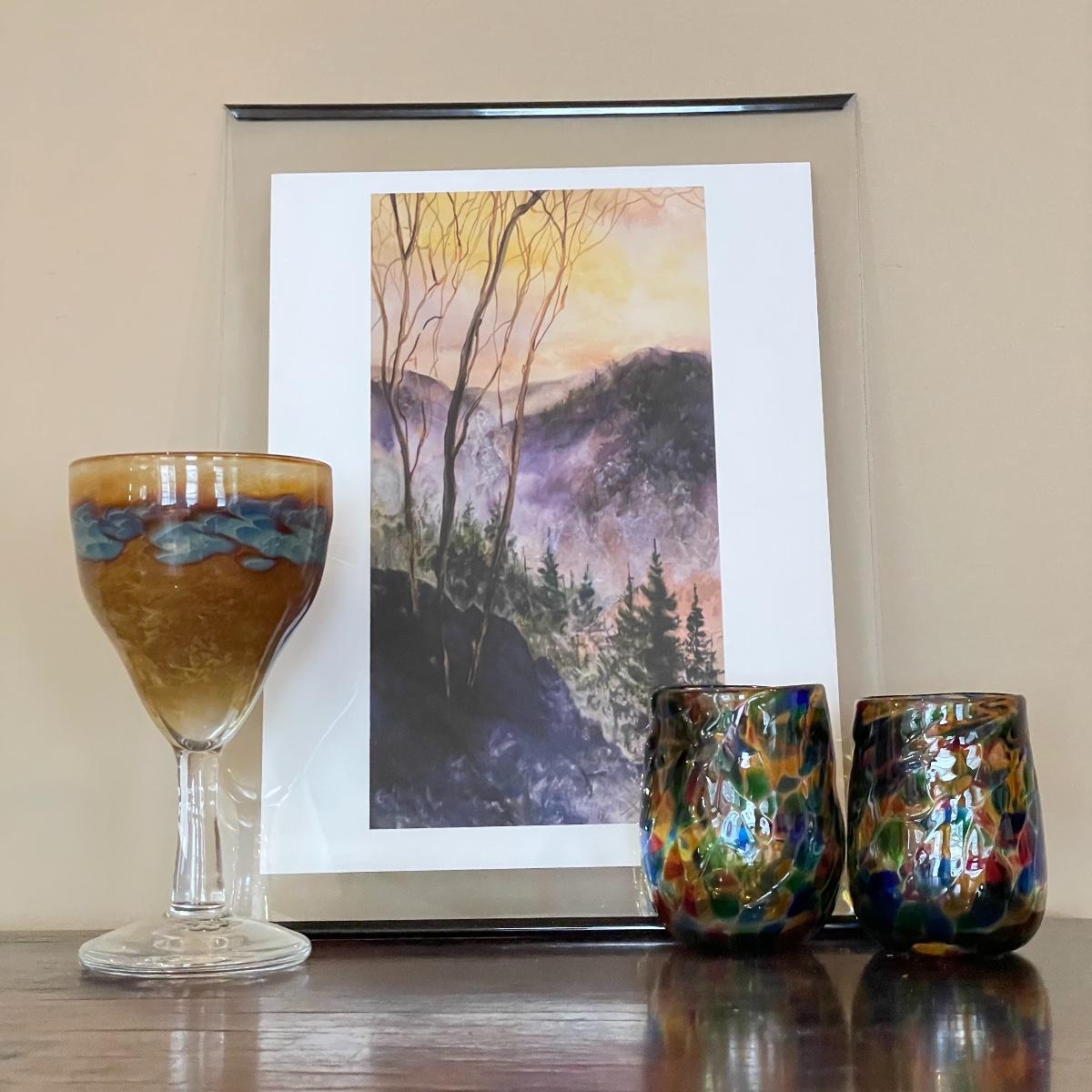 Susan Taylor Lingg signed giclee art with a glass front panel and a plexiglass back 10” x 13” frame. Lot also features a 6.5” blown glass goblet with a flower stamp on the bottom with gold and blue swirls along with two small stunning rainbow glasses/votives. Shipping available.