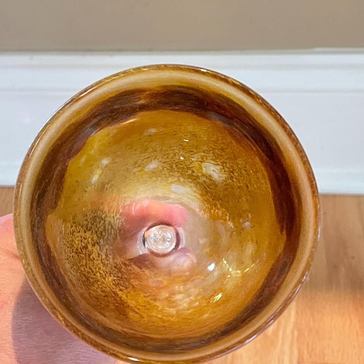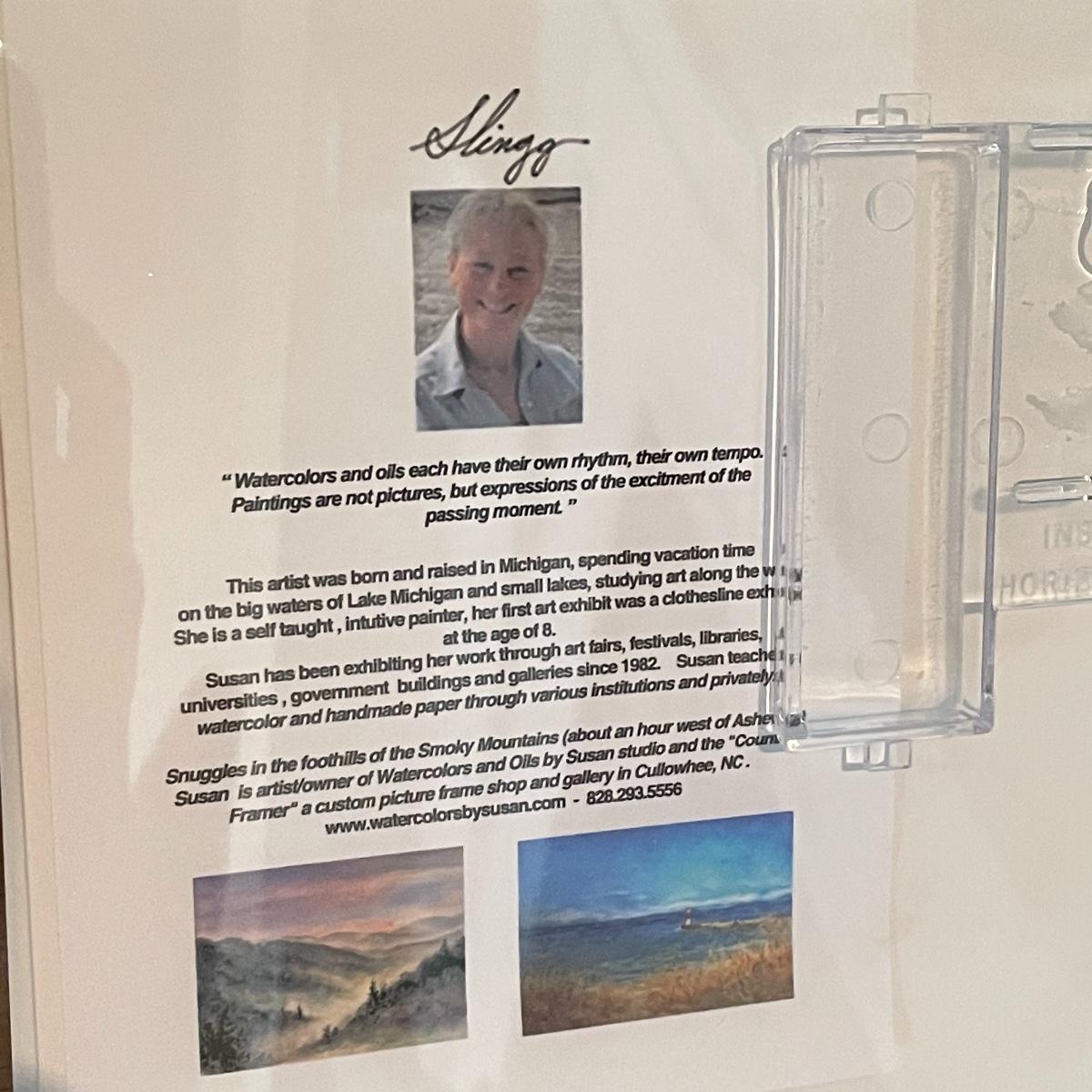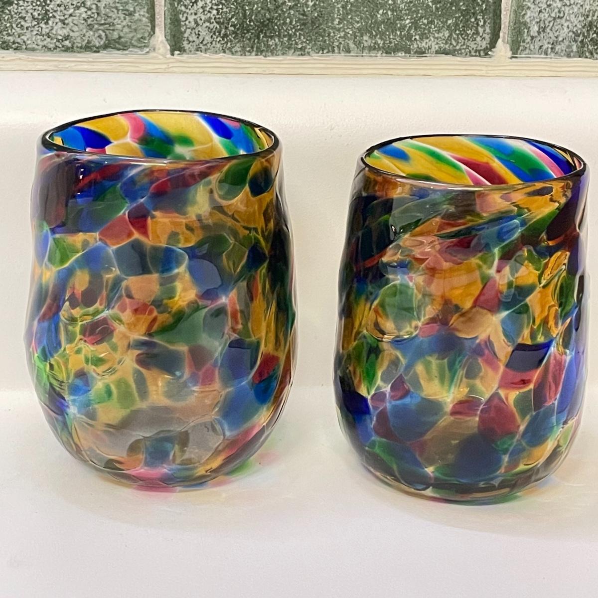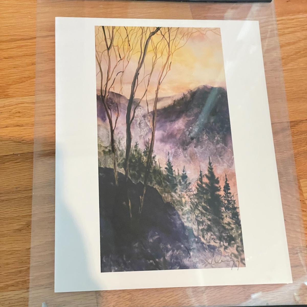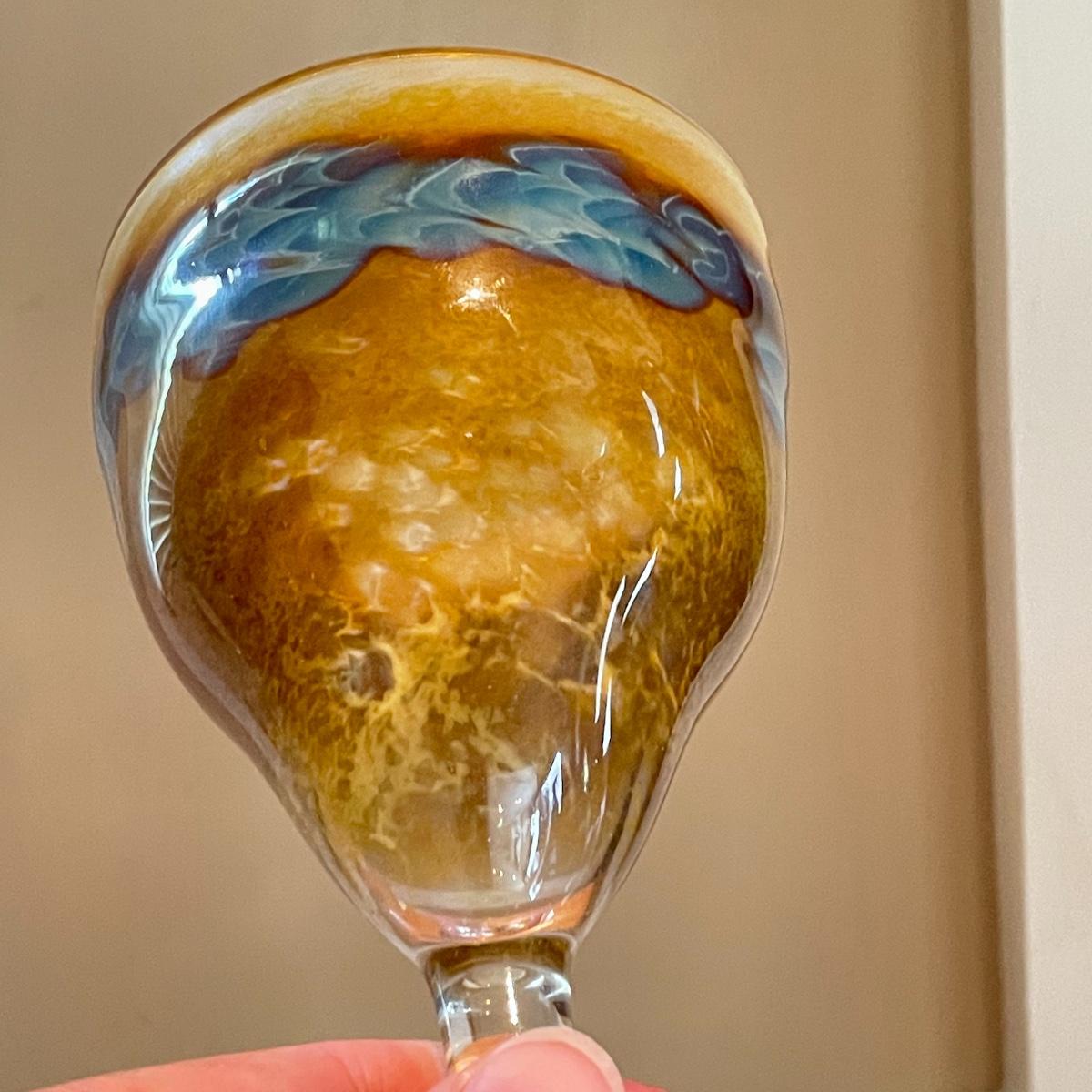 Susan Taylor Lingg signed giclee art with a glass front panel and a plexiglass back 10” x 13” frame. Lot also features a 6.5” blown glass goblet with a flower stamp on the bottom with gold and blue swirls along with two small stunning rainbow glasses/votives. Shipping available.