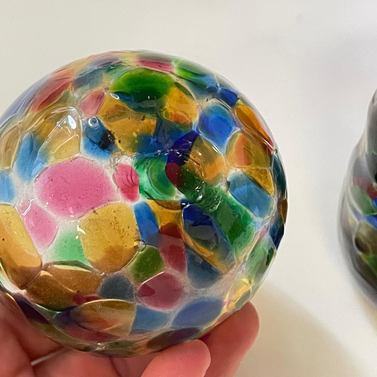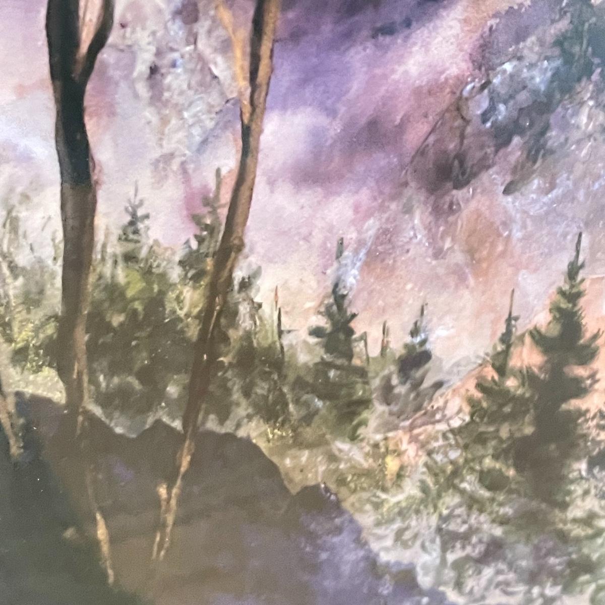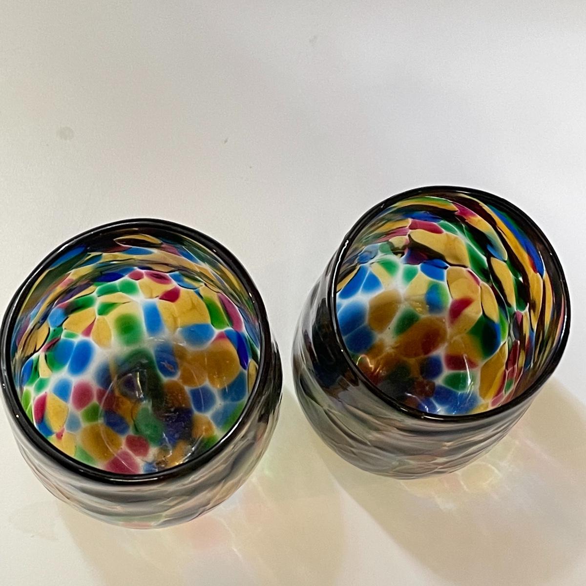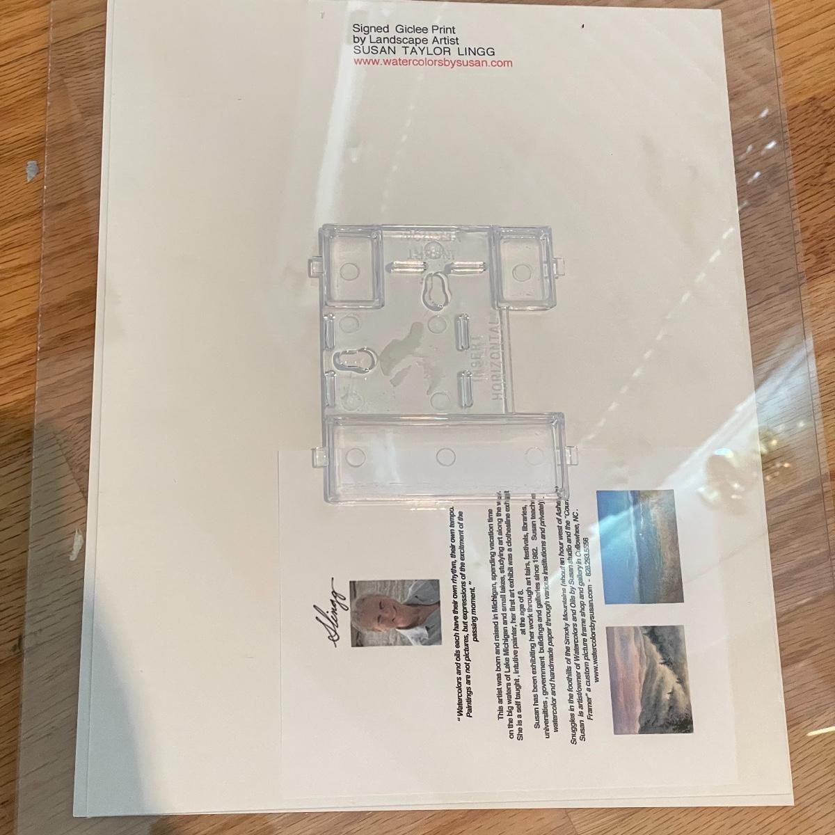 Susan Taylor Lingg signed giclee art with a glass front panel and a plexiglass back 10” x 13” frame. Lot also features a 6.5” blown glass goblet with a flower stamp on the bottom with gold and blue swirls along with two small stunning rainbow glasses/votives. Shipping available.