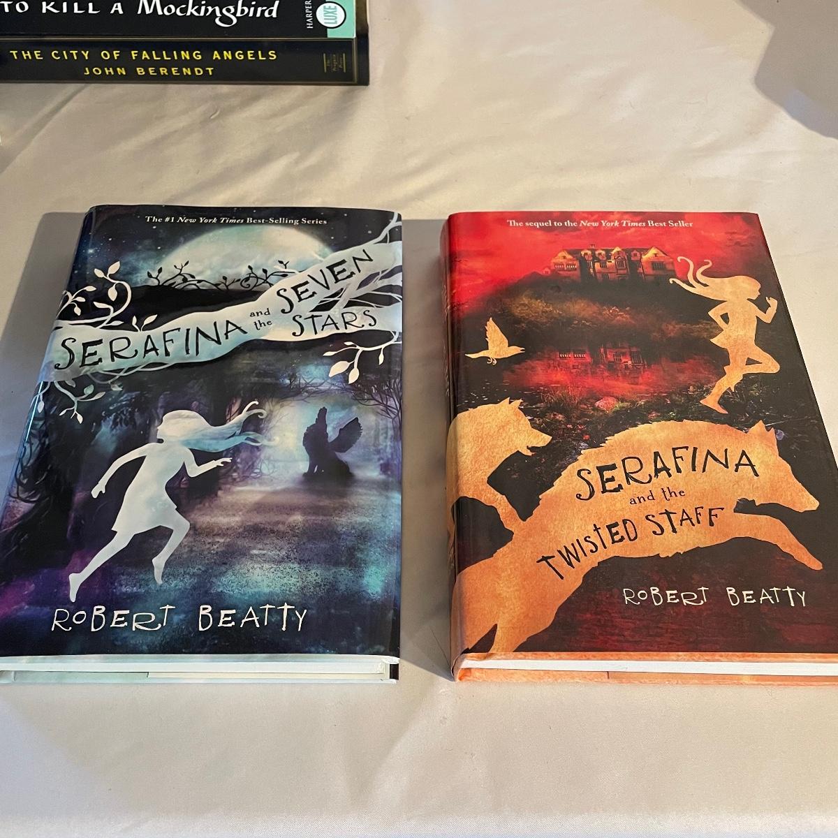 Two Serafina books by local author Robert Beatty, one of which is signed (small stain shown in an image) are accompanied by two more signed books by local author Leanna Sain. Also included are more novels, see images.
