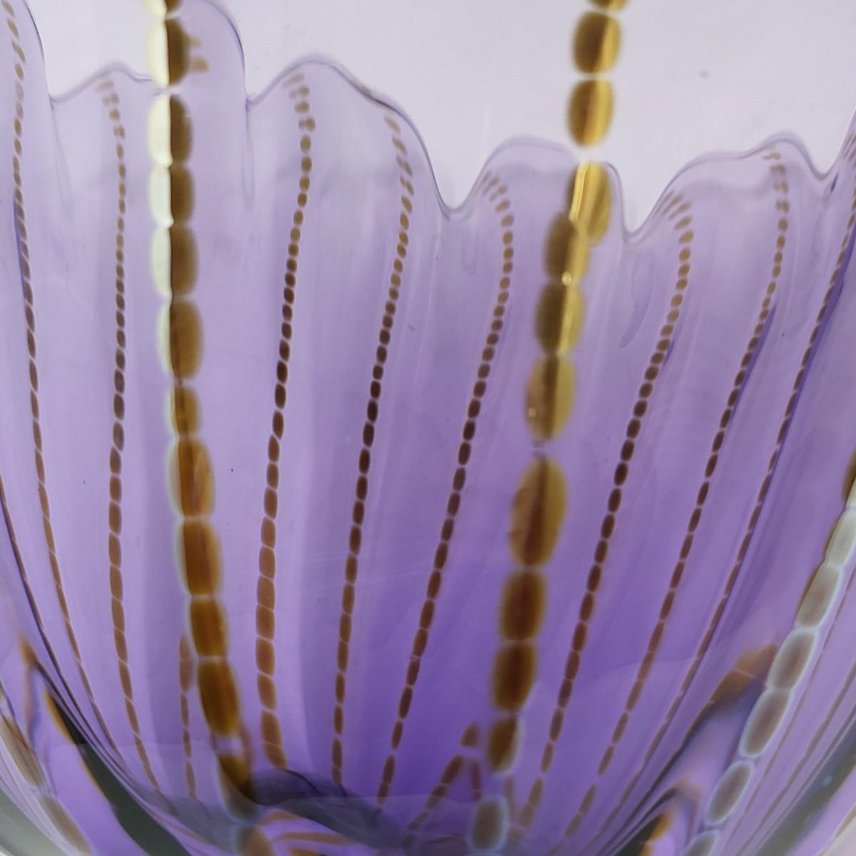Beautiful signed art glass ruffle bowl. Gold vertical dots painted around bowl. Measures 12" round x 7" tall. Bottom is signed M. Jordan '08.