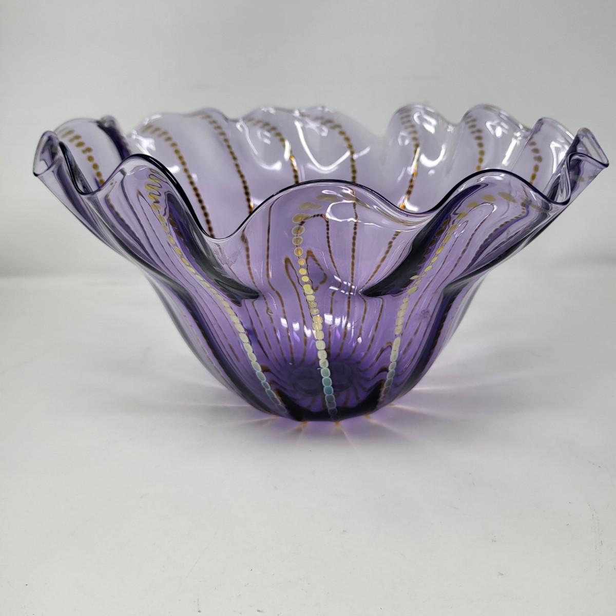 Beautiful signed art glass ruffle bowl. Gold vertical dots painted around bowl. Measures 12" round x 7" tall. Bottom is signed M. Jordan '08.
