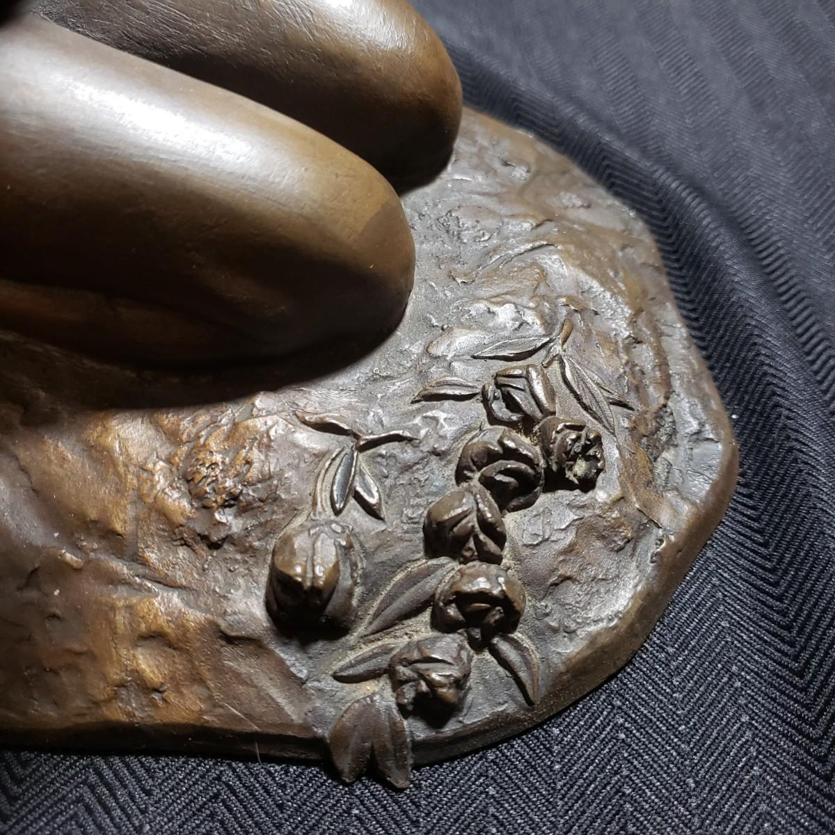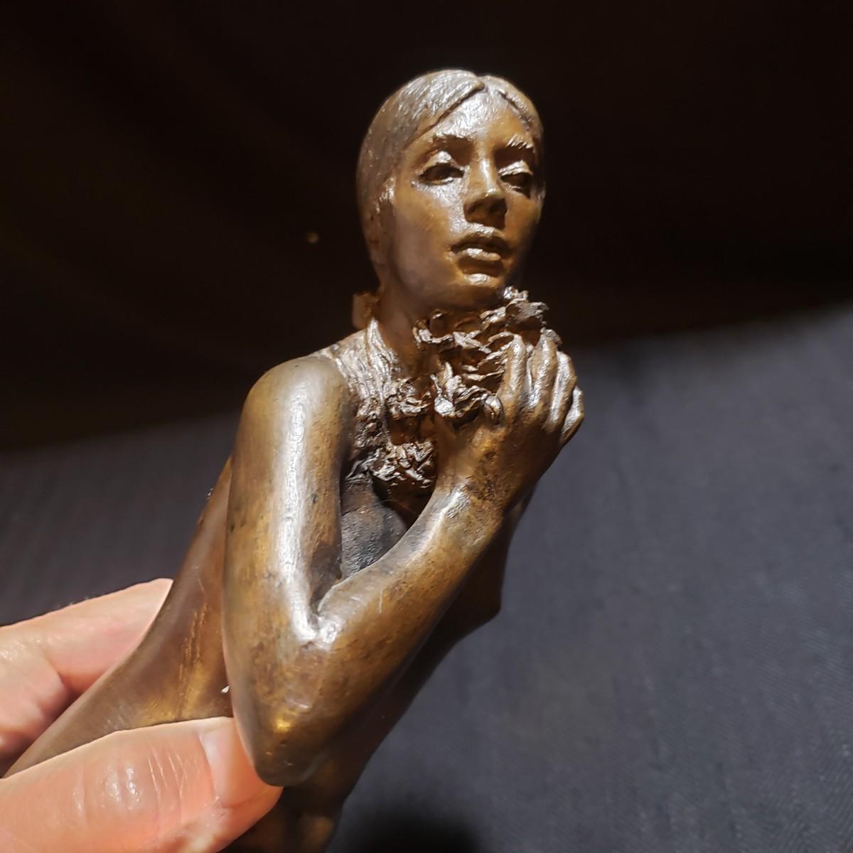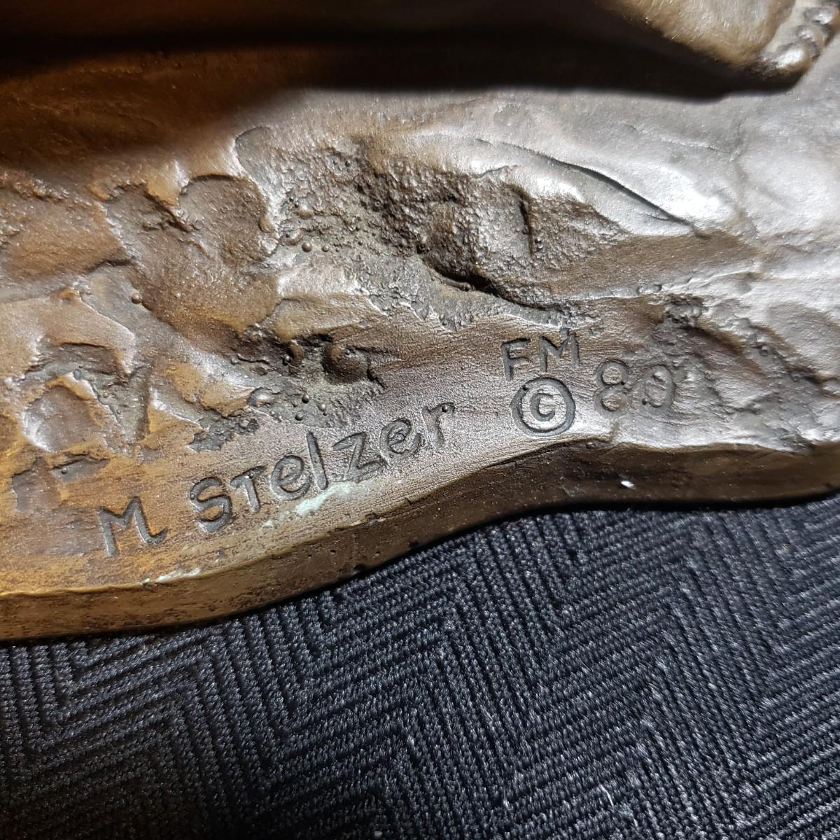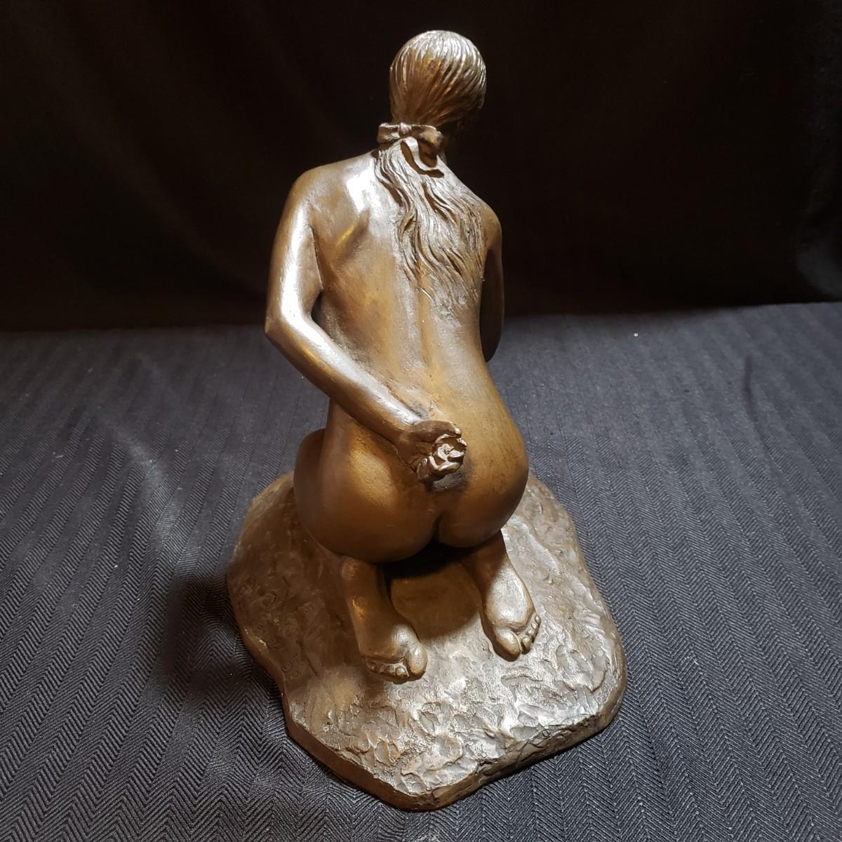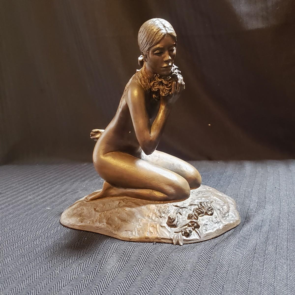 This bronze sculpture appears to be signed by M. Stelzer and titled "Kneeling Nude With Flowers". This lovely piece measures 9" x 6" x 9"H. It is heavy to the touch.