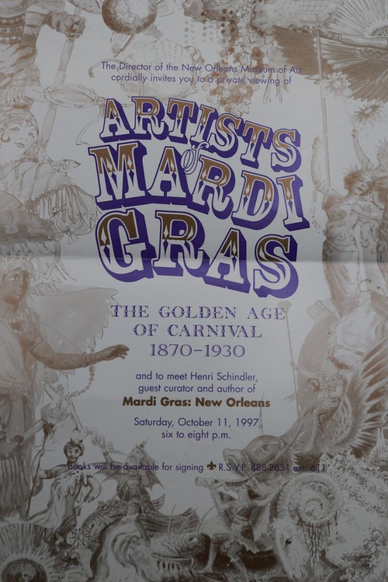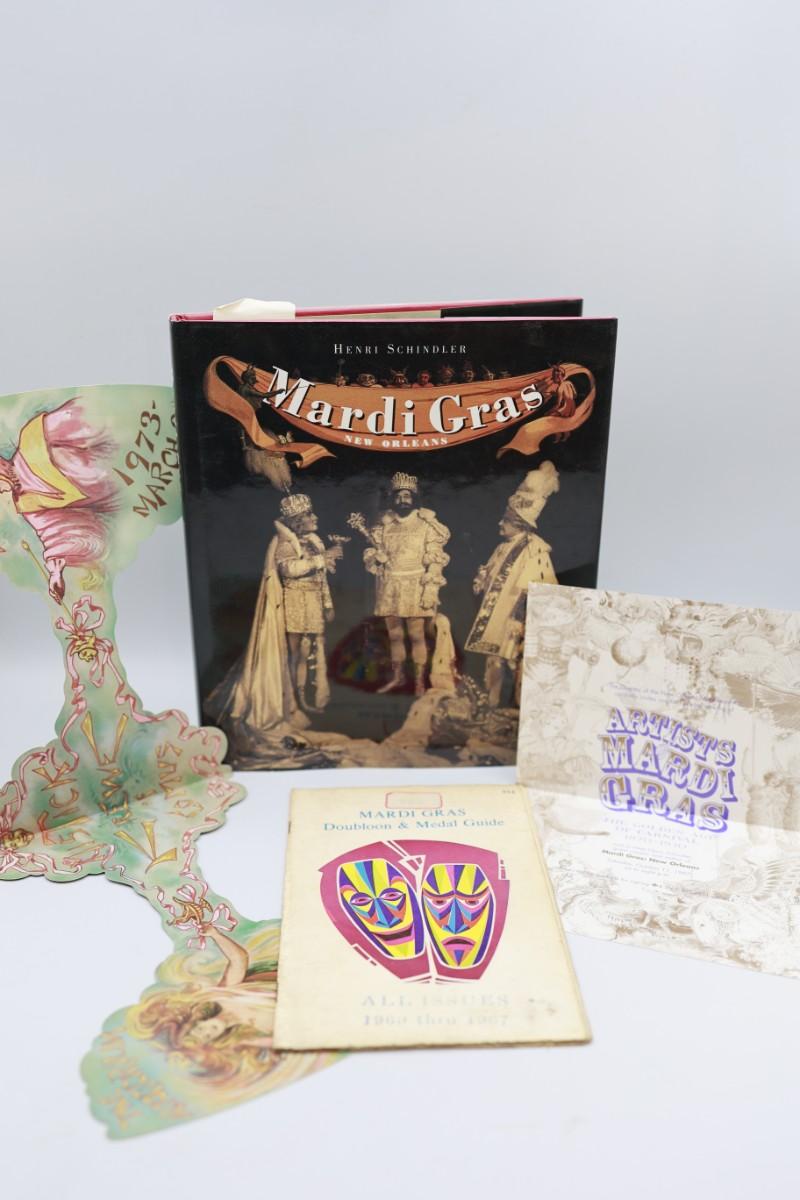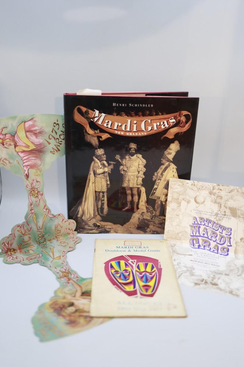 Signed Mardi Gras book by Henri Schindler, the invitation to meet Henri Schindler, and doubloon and medal guidebook.
