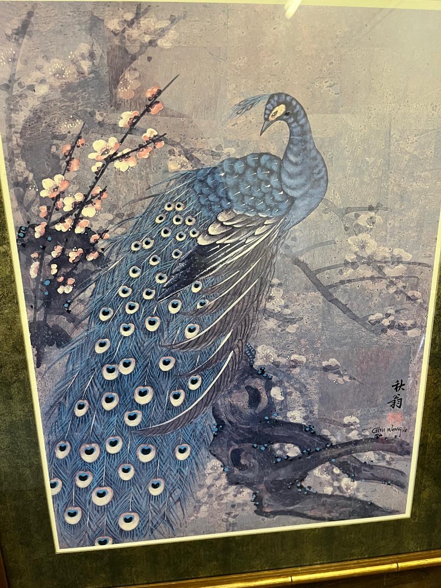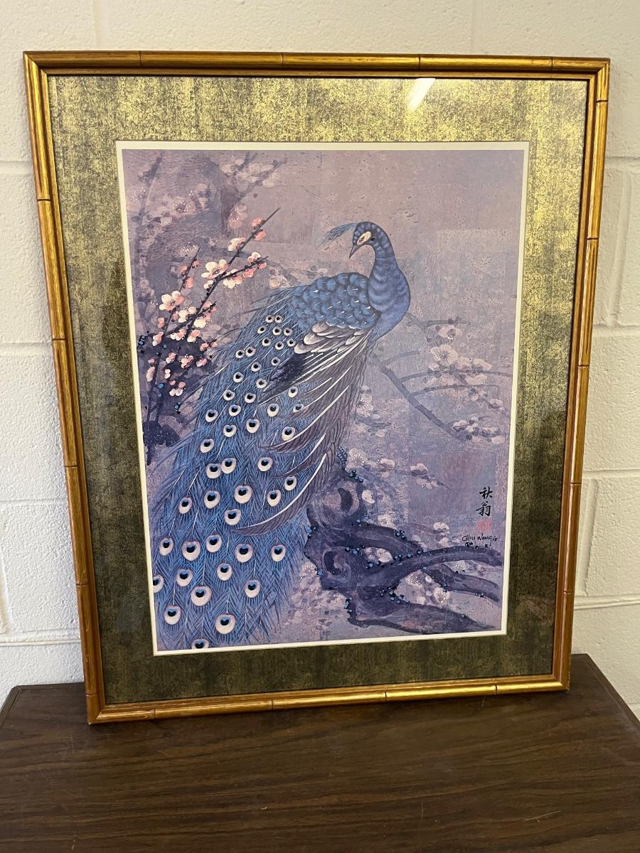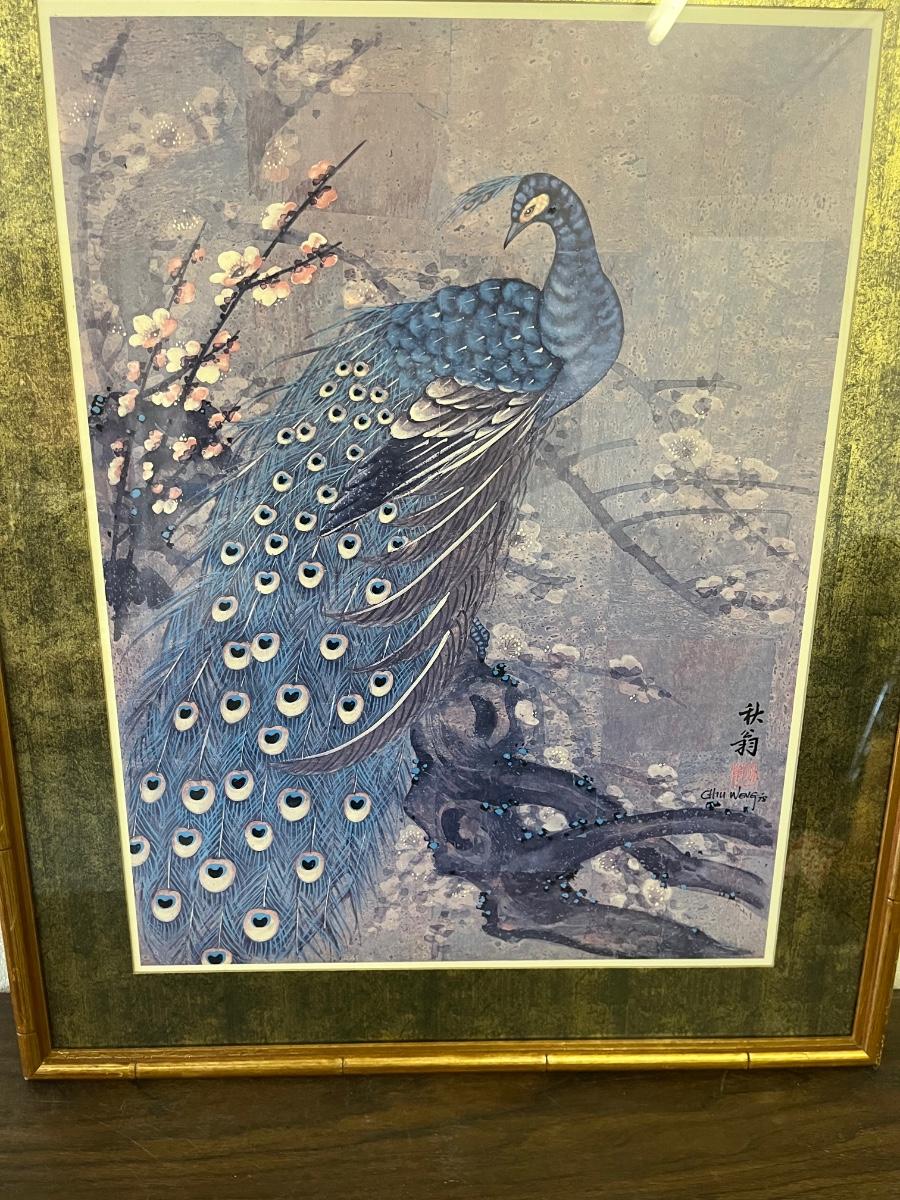 Lot includes a signed and dated Chiu Weng Peacock print that is also matted and wooden framed. Frame measures 25” x 31”.