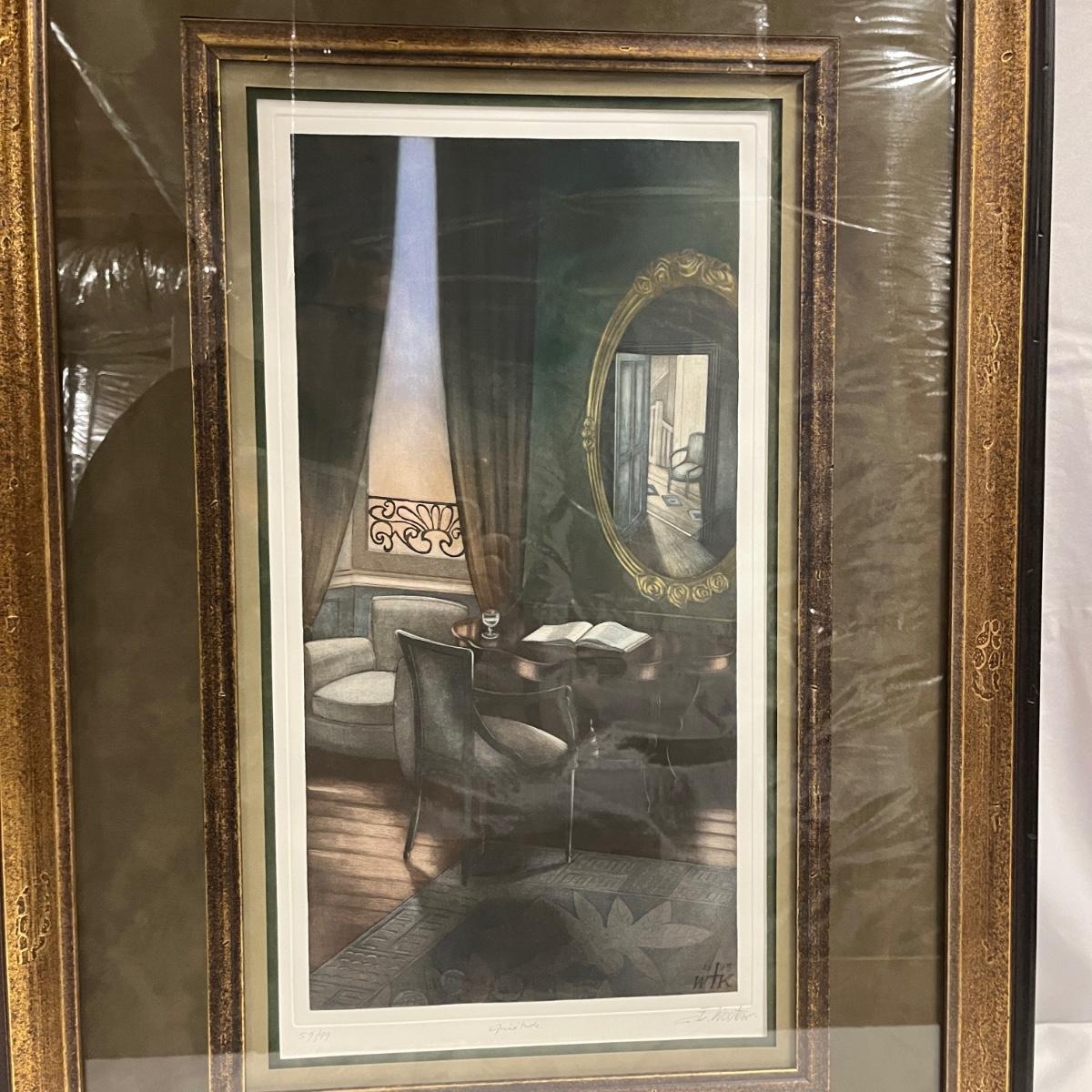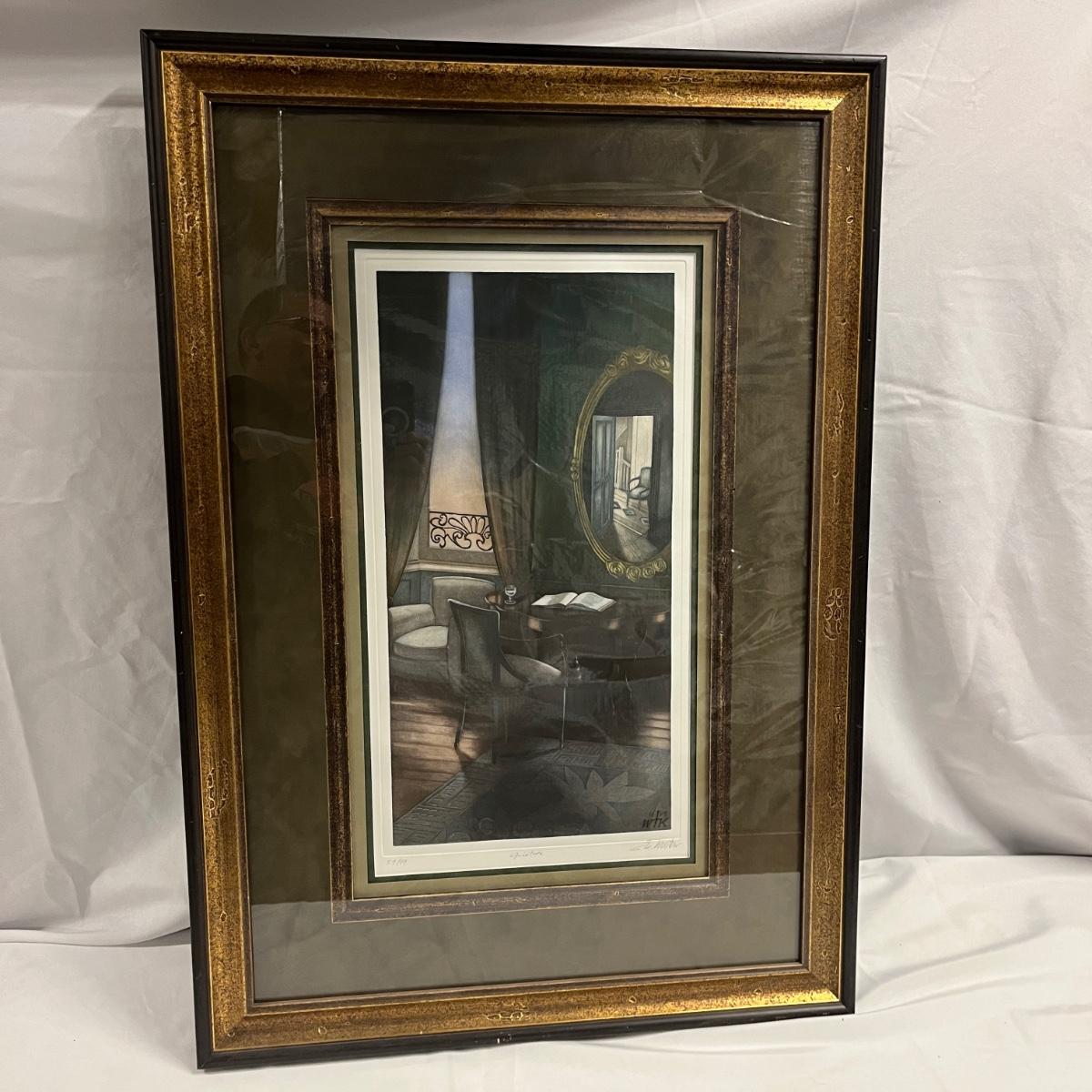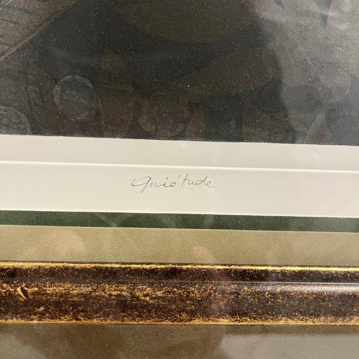 This print titled “Quietude” is mounted in a wooden frame. Art is under glass, matted and pencil signed by Christian Wouters and numbered. Frame measures 25.5” x 1.5” x 36.5”H.