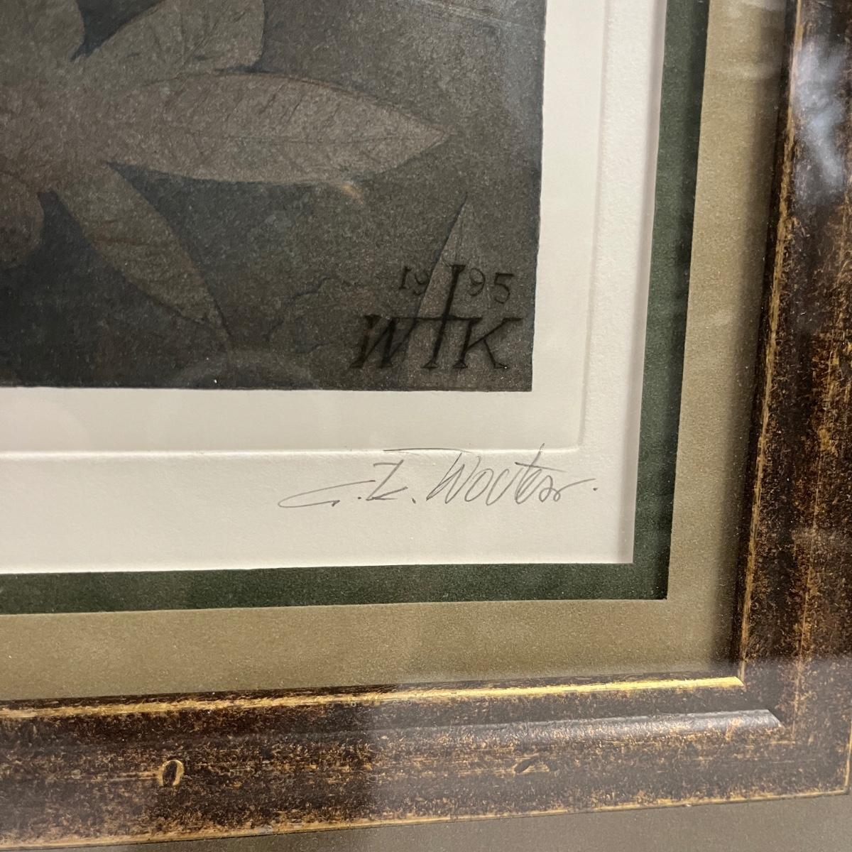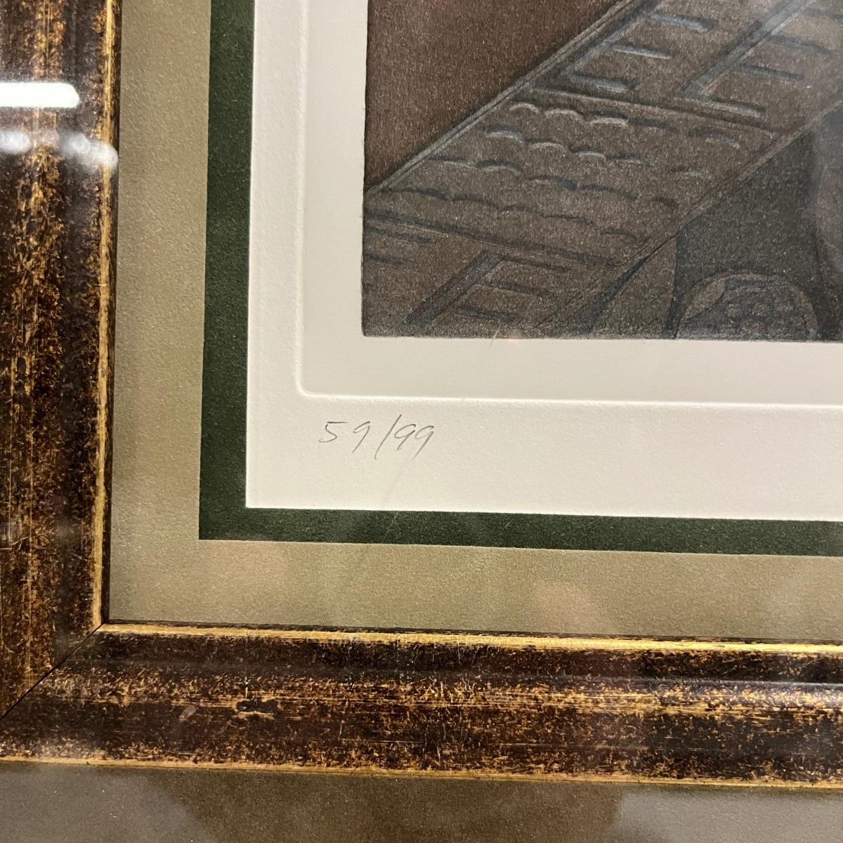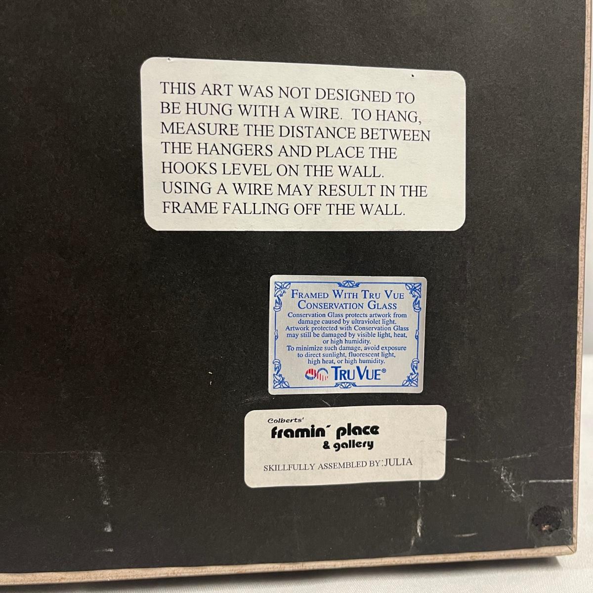 This print titled “Quietude” is mounted in a wooden frame. Art is under glass, matted and pencil signed by Christian Wouters and numbered. Frame measures 25.5” x 1.5” x 36.5”H.