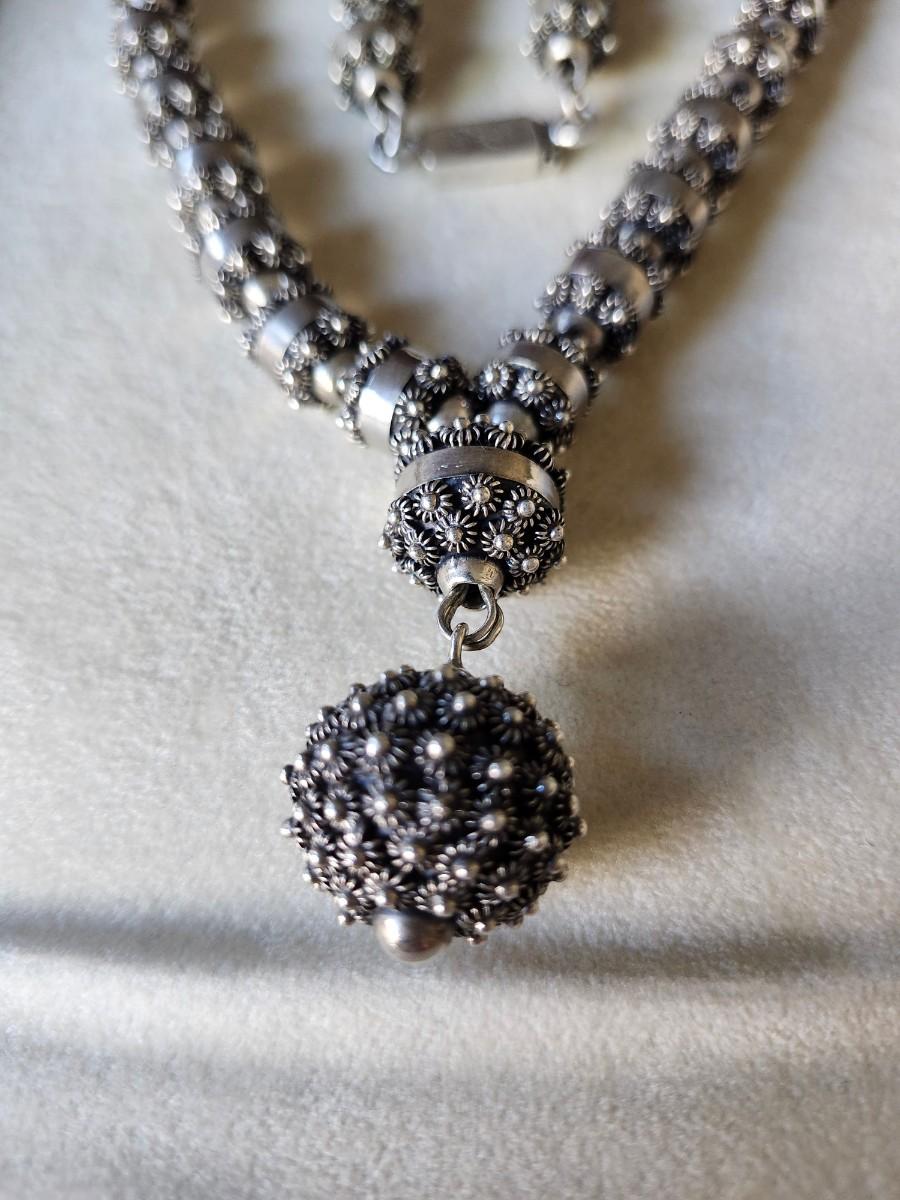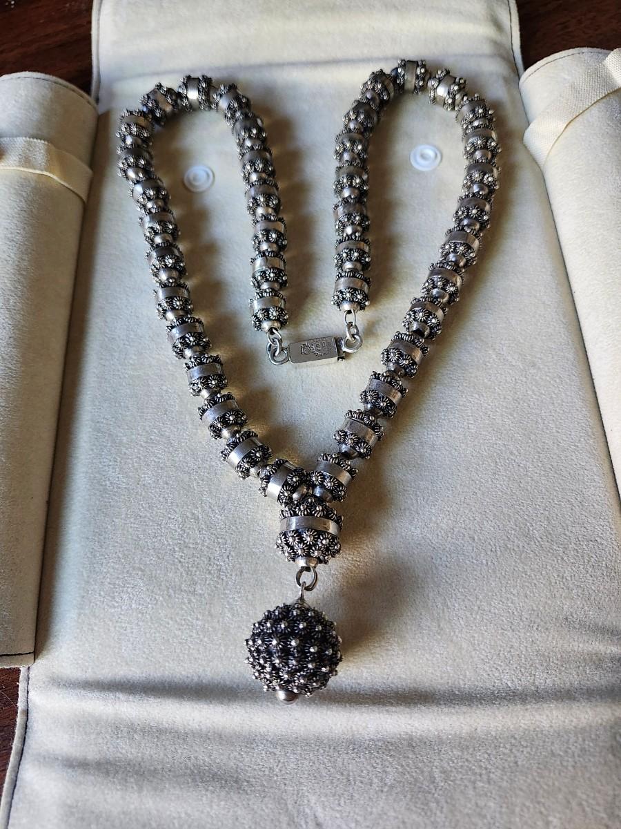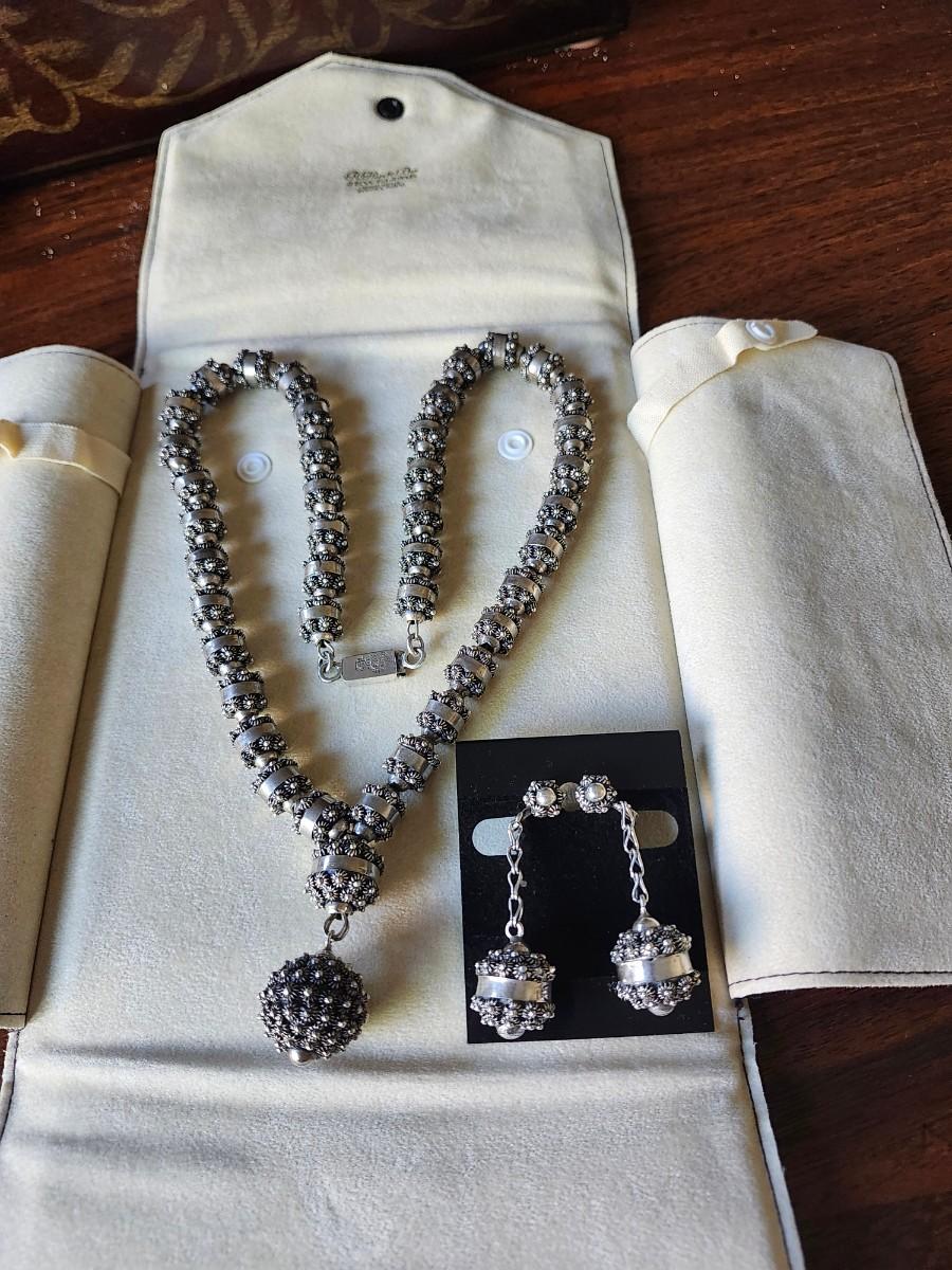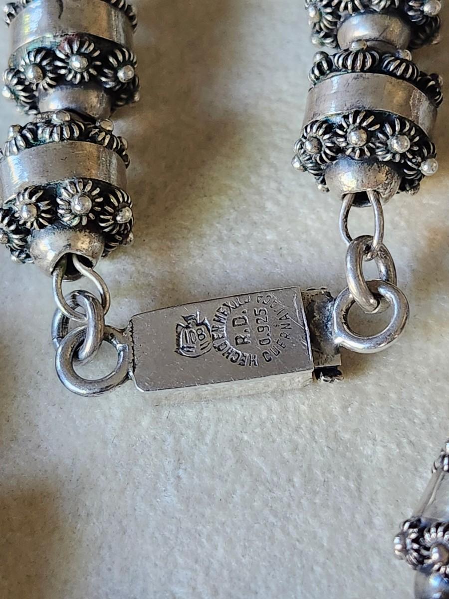 Signed R D, Cuernnavaca necklace set with earrings. The cannetille metalwork has intricate coiled wire curled and twisted to form complex patterns. 12 inch drop to top of pendant. Rare, hard to find. Retail is at $695.00