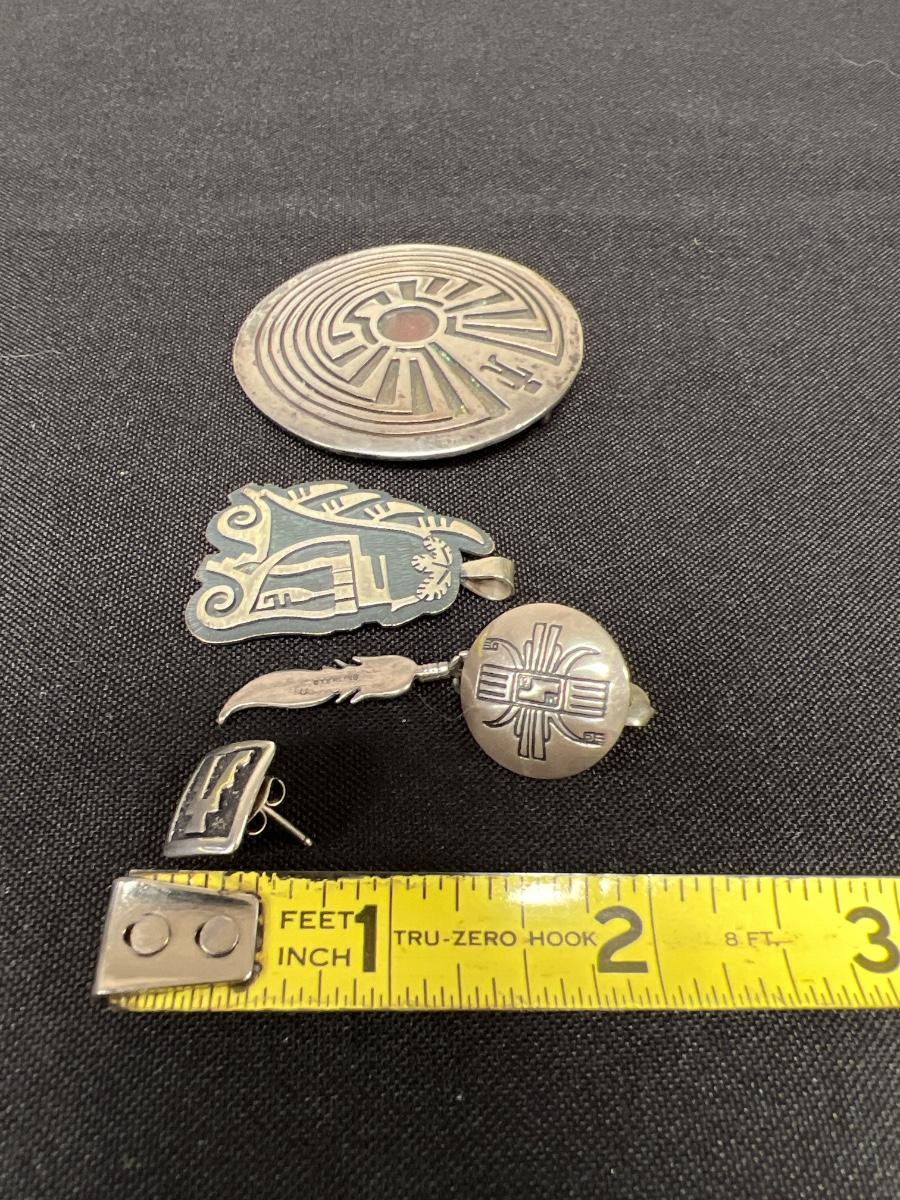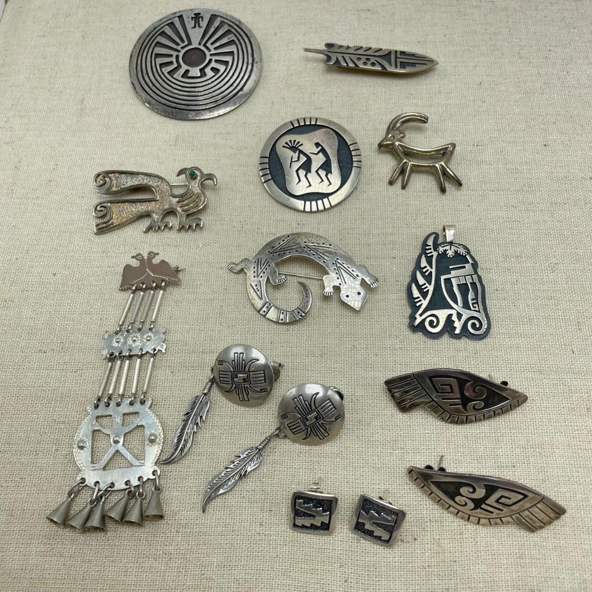 Stunning collection of mostly Native American sterling jewelry. Pieces include a signed Felix Joe antelope cast brooch, signed feather earrings, and lizard. Items which appear to have Hopi Overlay include a pendant/brooch combo by Ramon Dalangyawma, two pairs of earrings including a Cheryl Wadsworth feather pair, plus two signed pendants. Lot also includes two unmarked bird brooches. See images. All sales are final. No returns or refunds. Please bid accordingly.