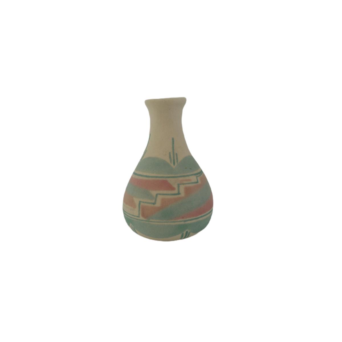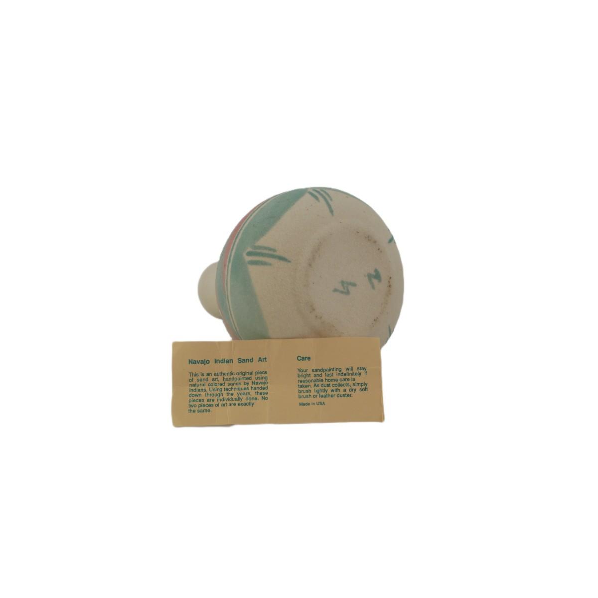 Stunning handmade Navajo Native American sand art vase, signed on the bottom. Rim has crack (see photos), otherwise in good condition. Measures L 5" x H 8", weighs 1 lb 3 oz. (C98)