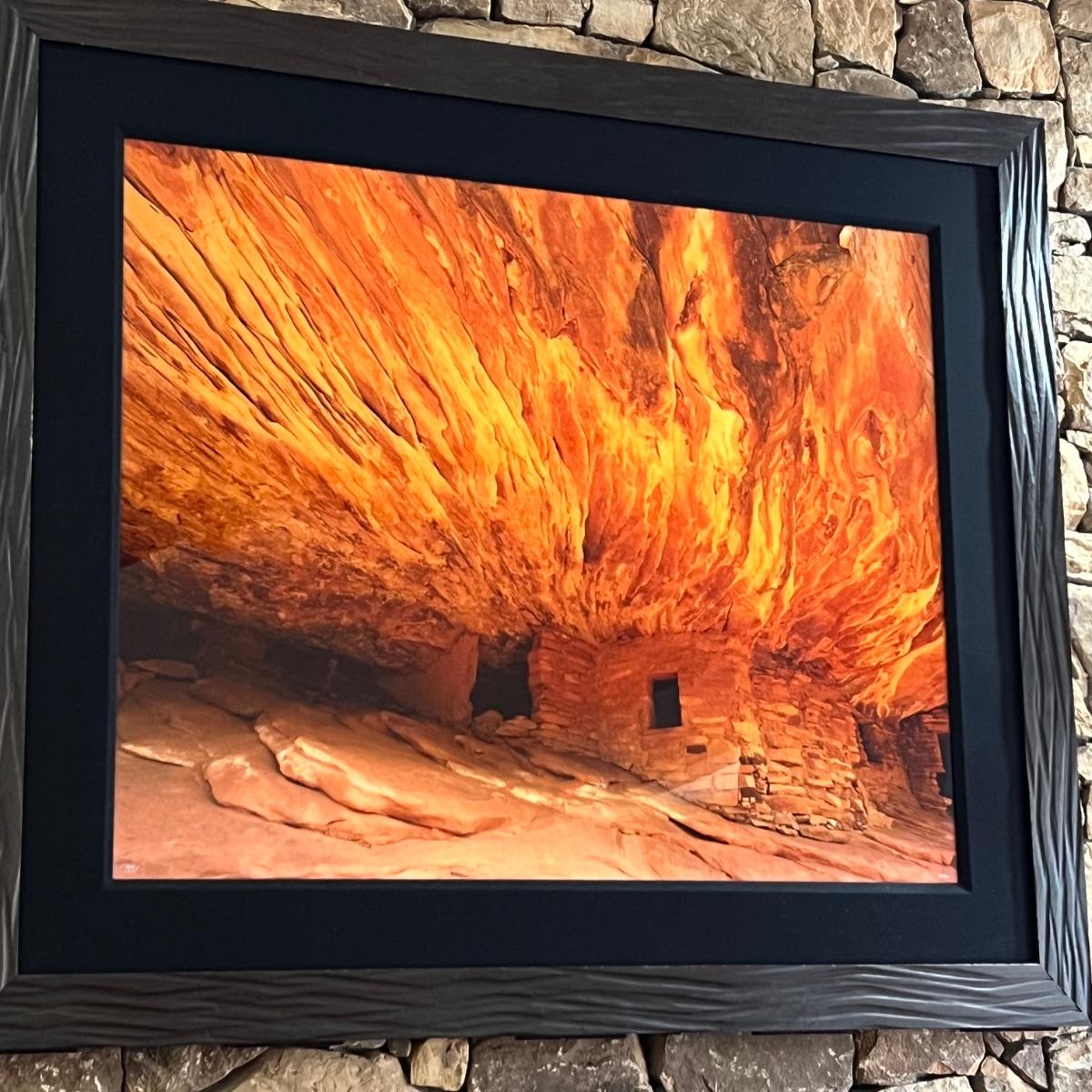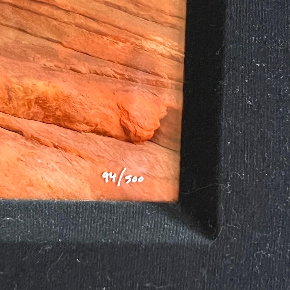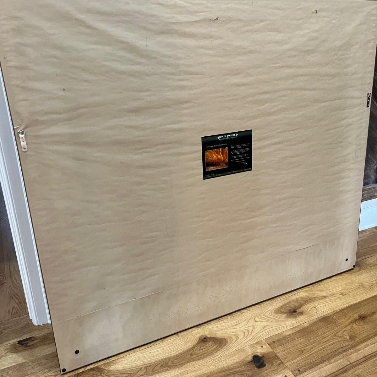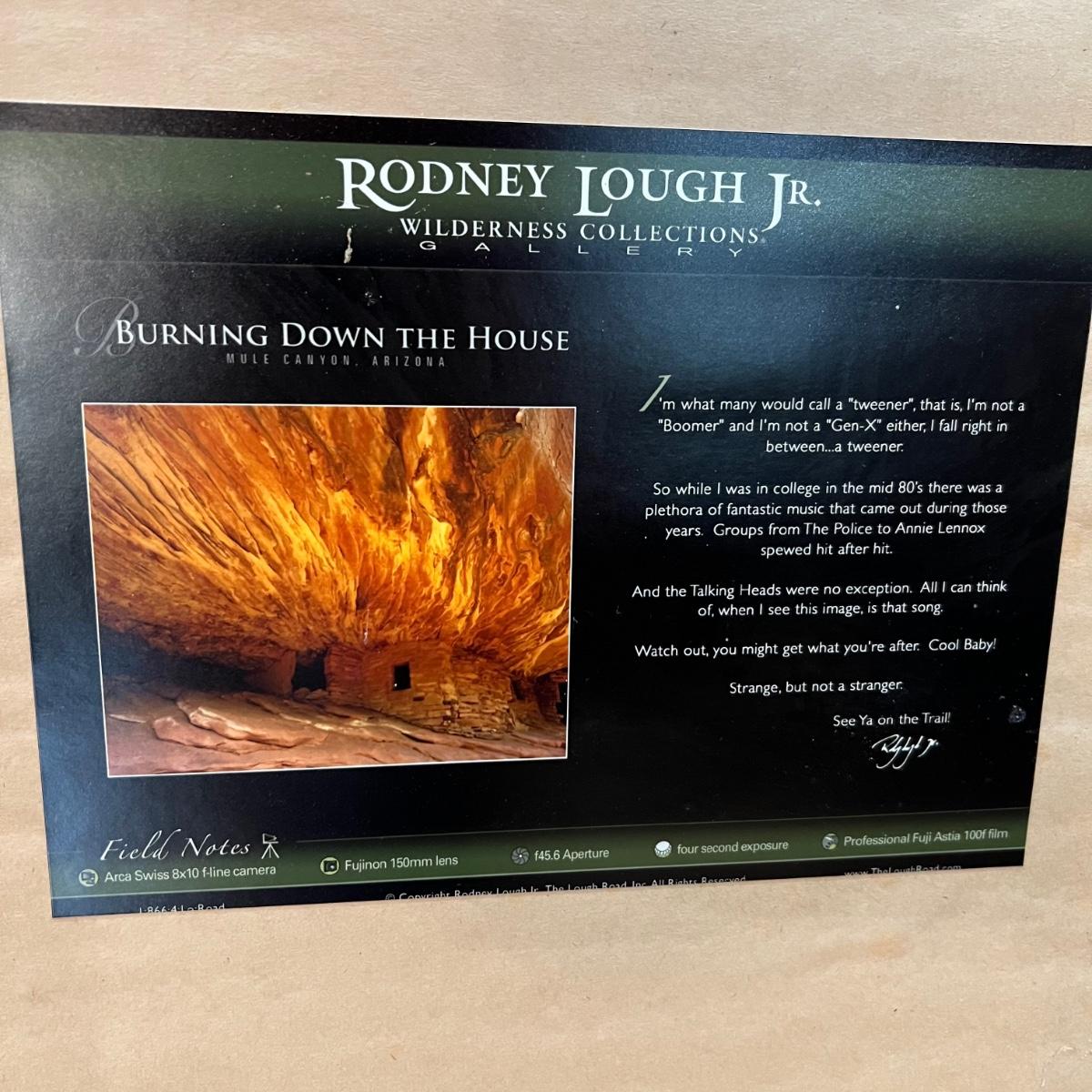 This large photograph is signed Rodney Lough Jr and numbered 94/500. The title of this piece is “˜Burning Down The House’. Housed under glass with a black material matte and a wood like dark brown frame that measures 65” x 56”H.