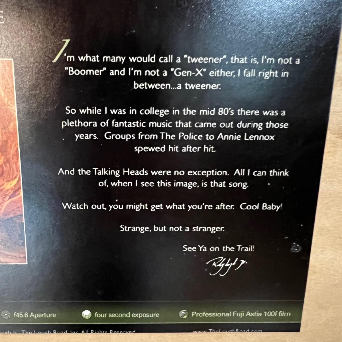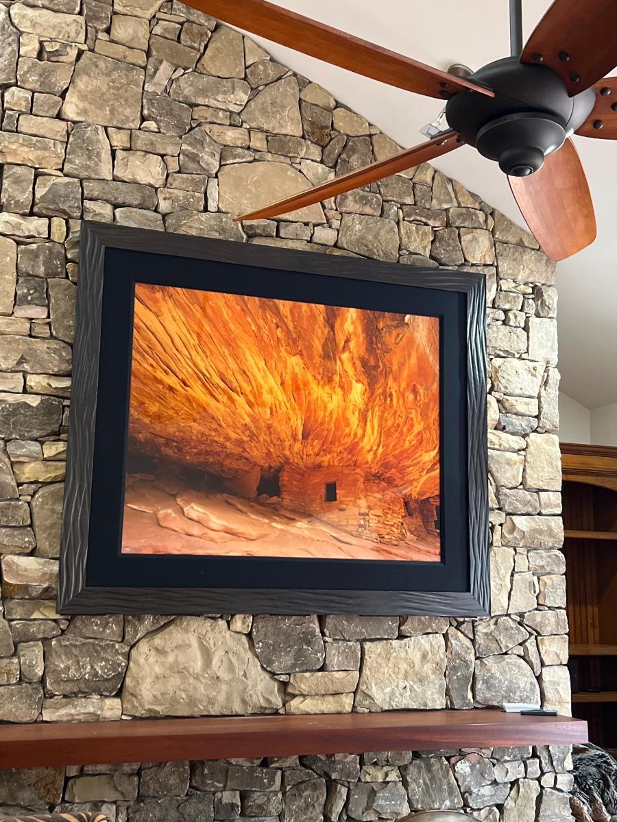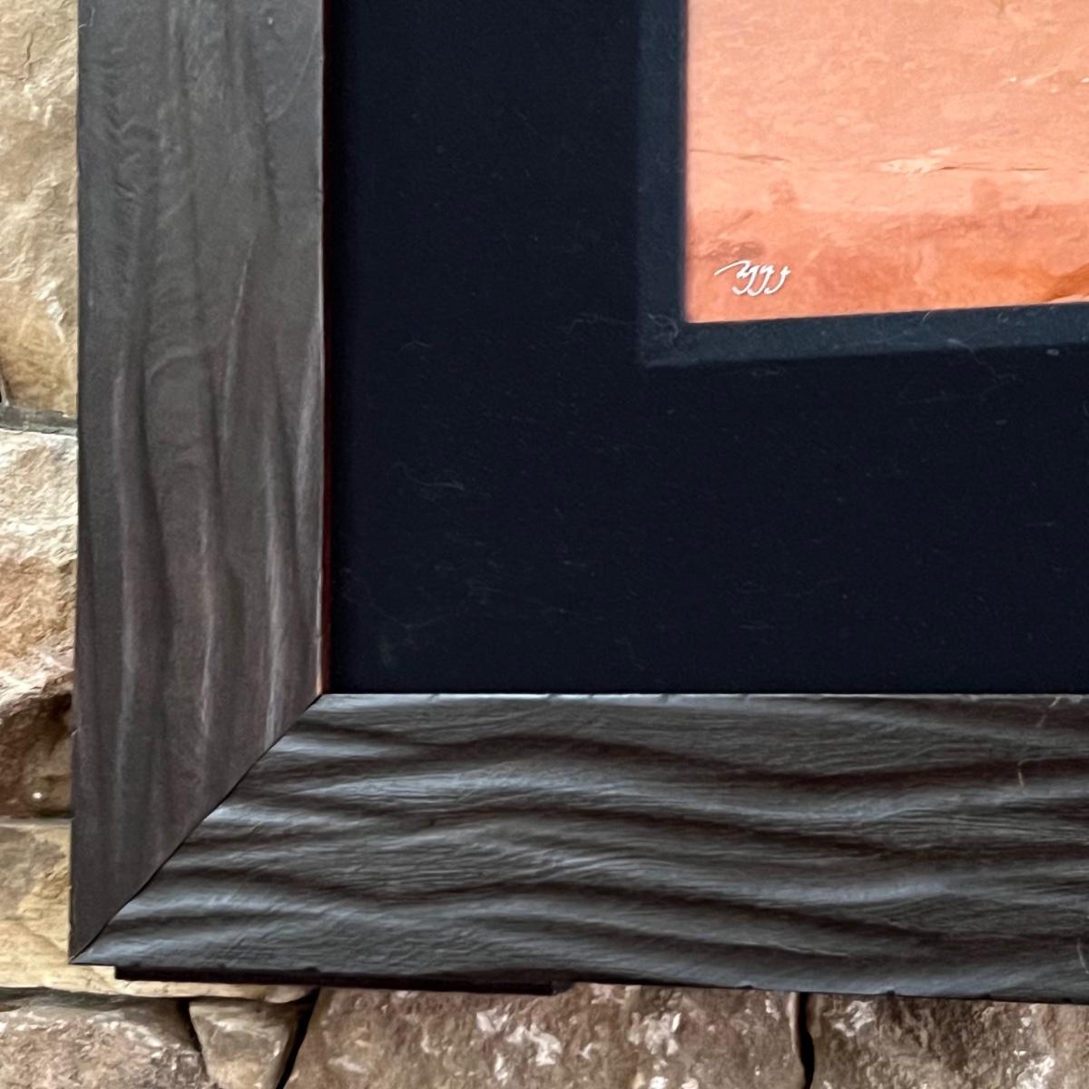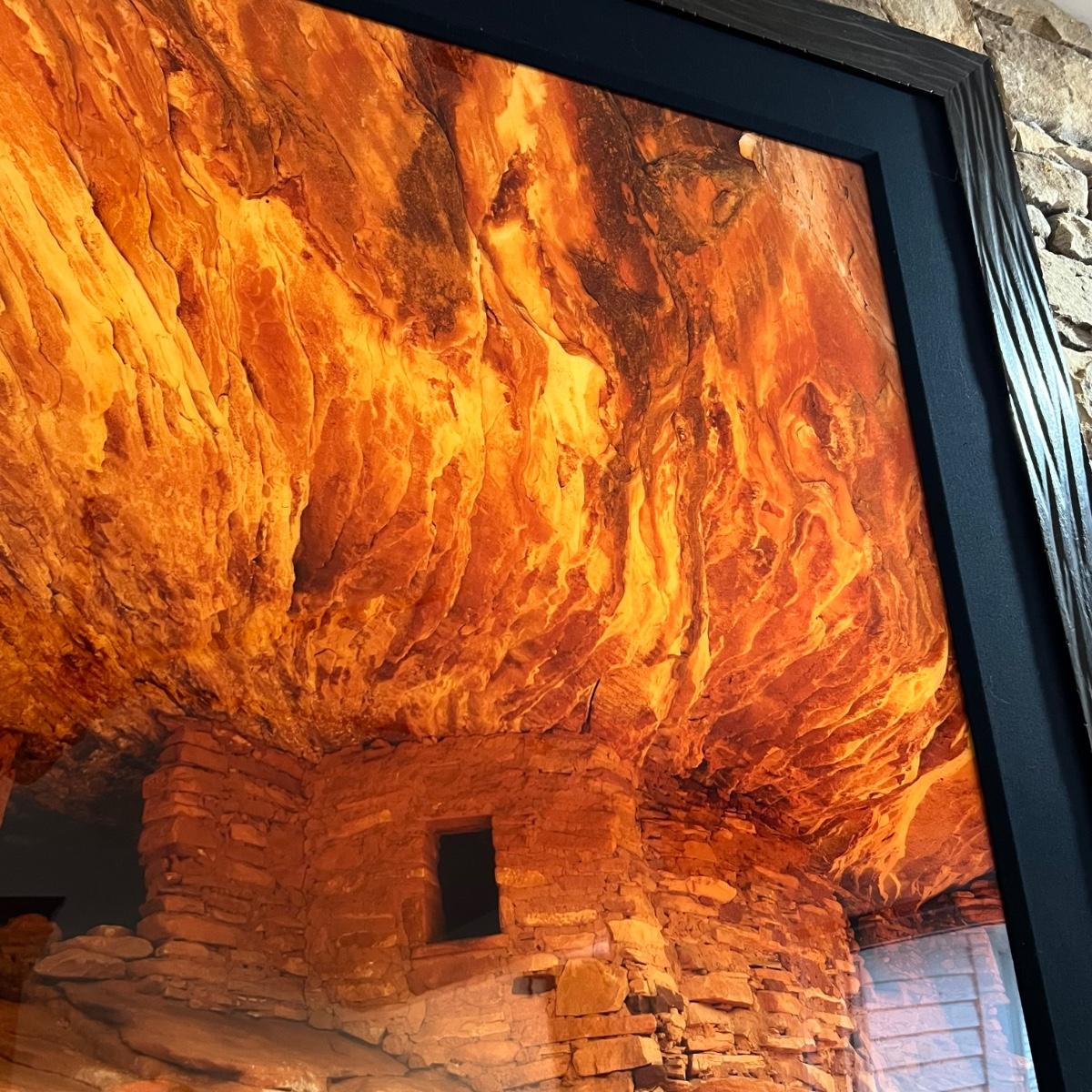 This large photograph is signed Rodney Lough Jr and numbered 94/500. The title of this piece is “˜Burning Down The House’. Housed under glass with a black material matte and a wood like dark brown frame that measures 65” x 56”H.