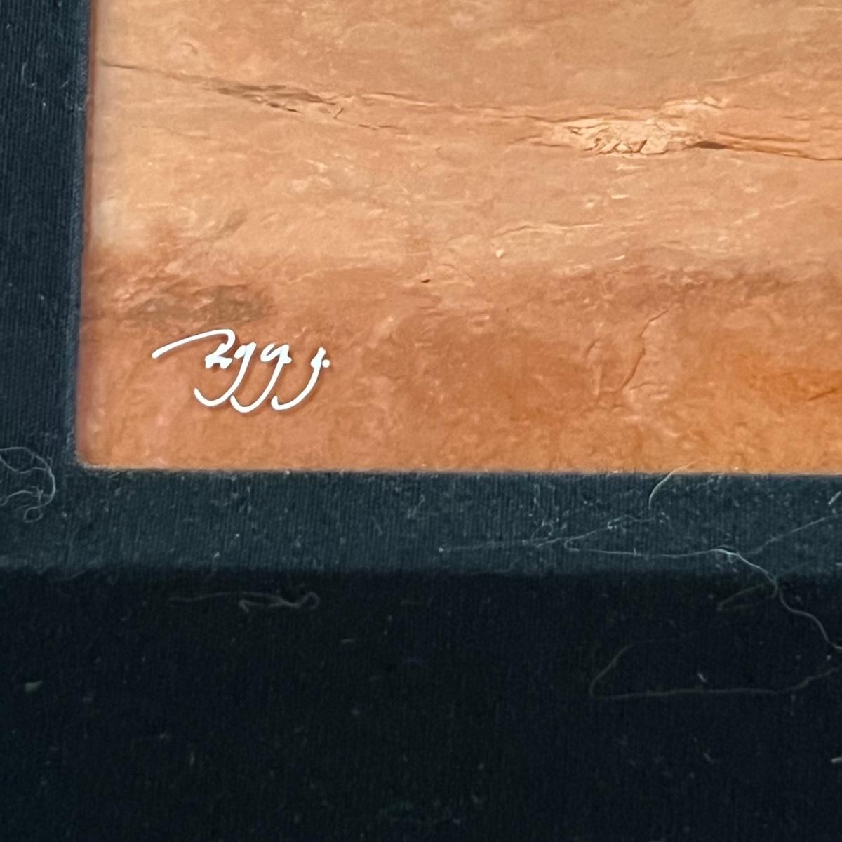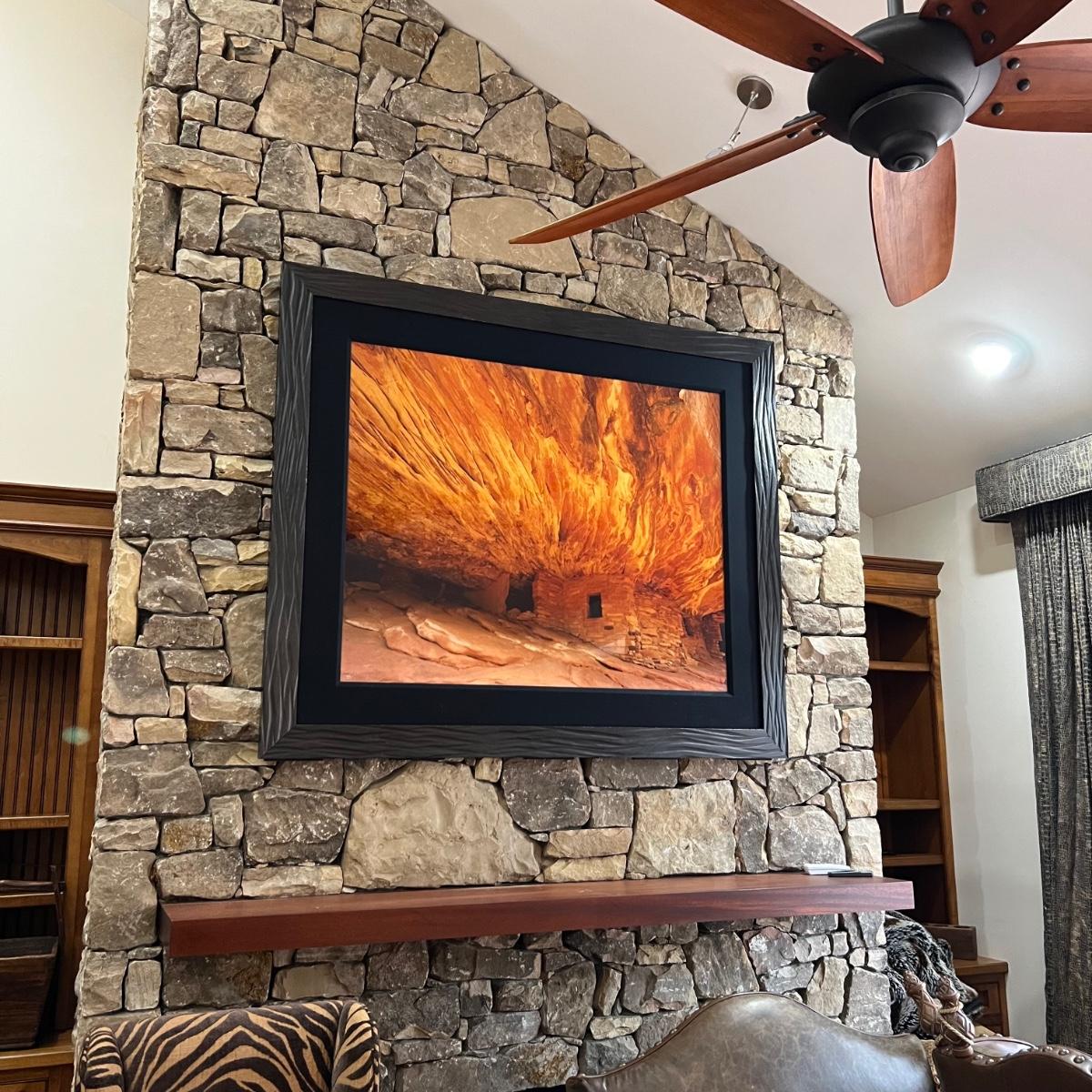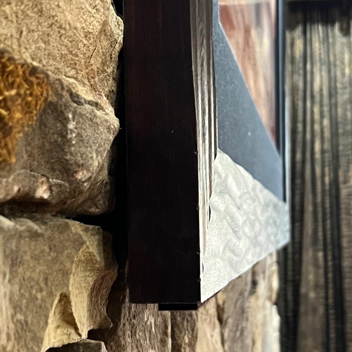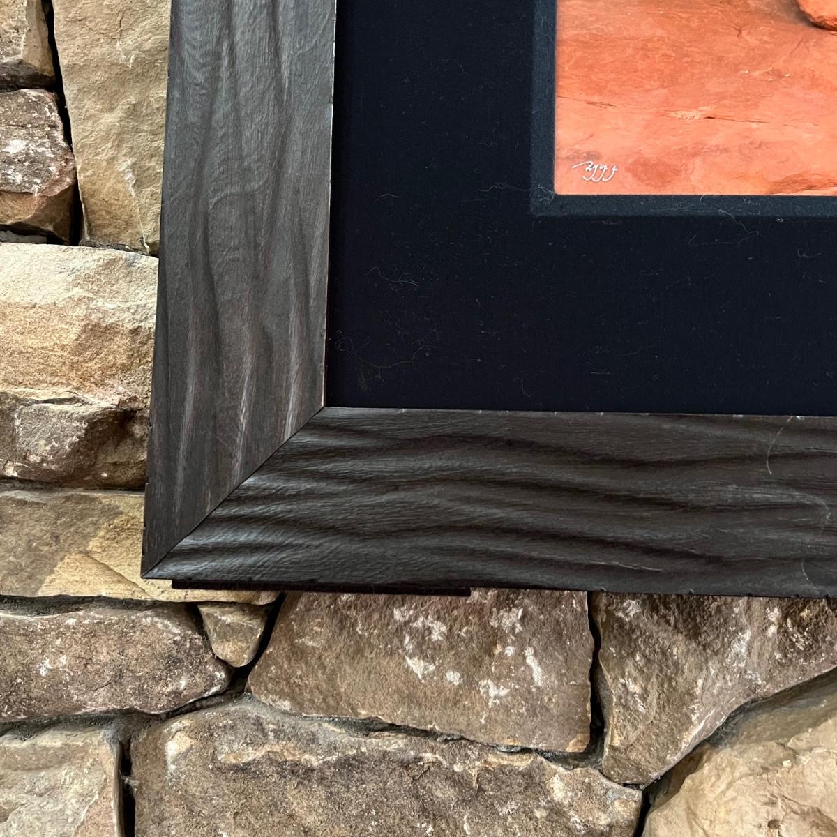 This large photograph is signed Rodney Lough Jr and numbered 94/500. The title of this piece is “˜Burning Down The House’. Housed under glass with a black material matte and a wood like dark brown frame that measures 65” x 56”H.