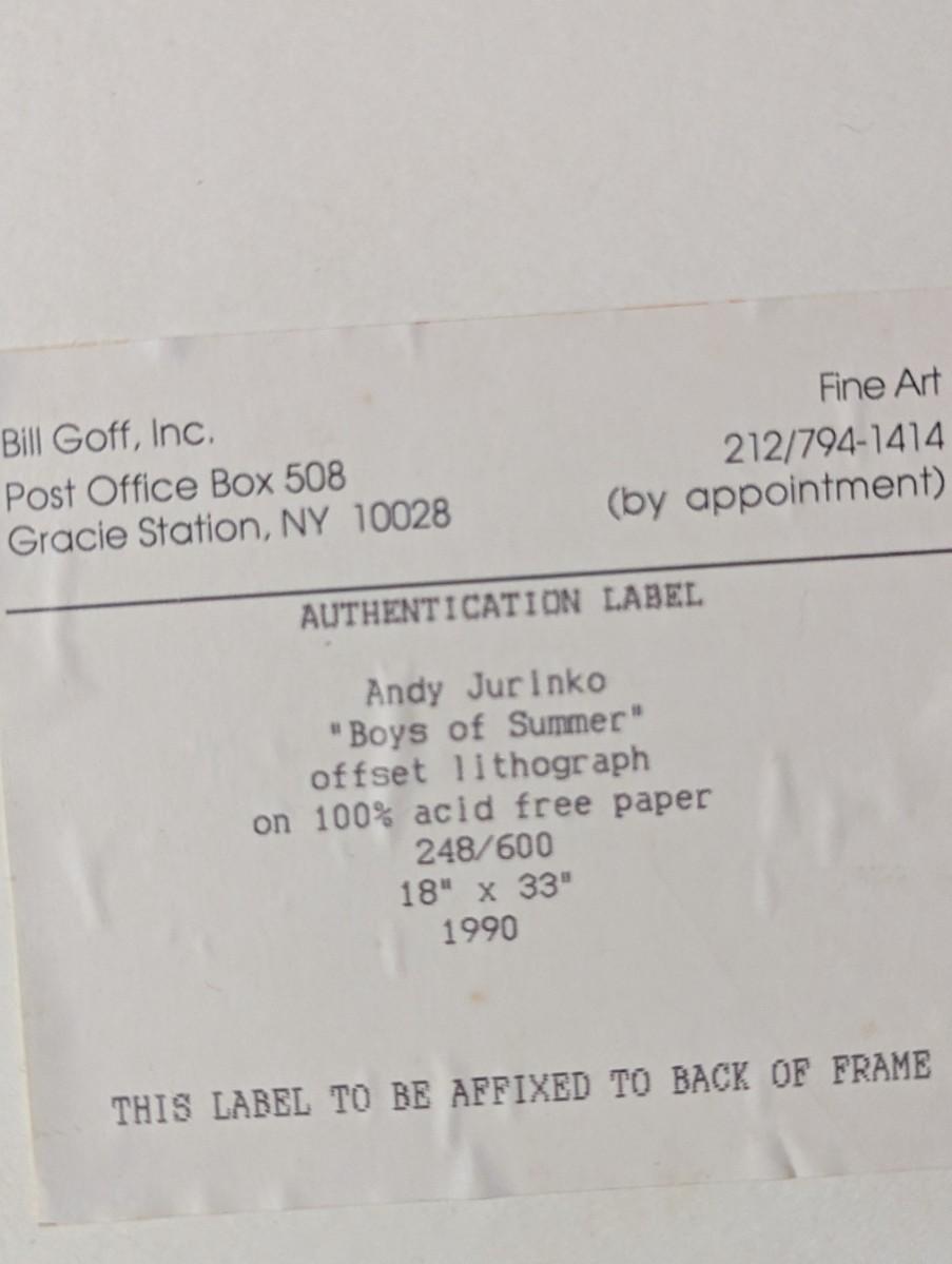 Signed & Numbered Litho With Authentication Label Andy Jurinko "Boys Of Summer" Offset Lithograph 1990