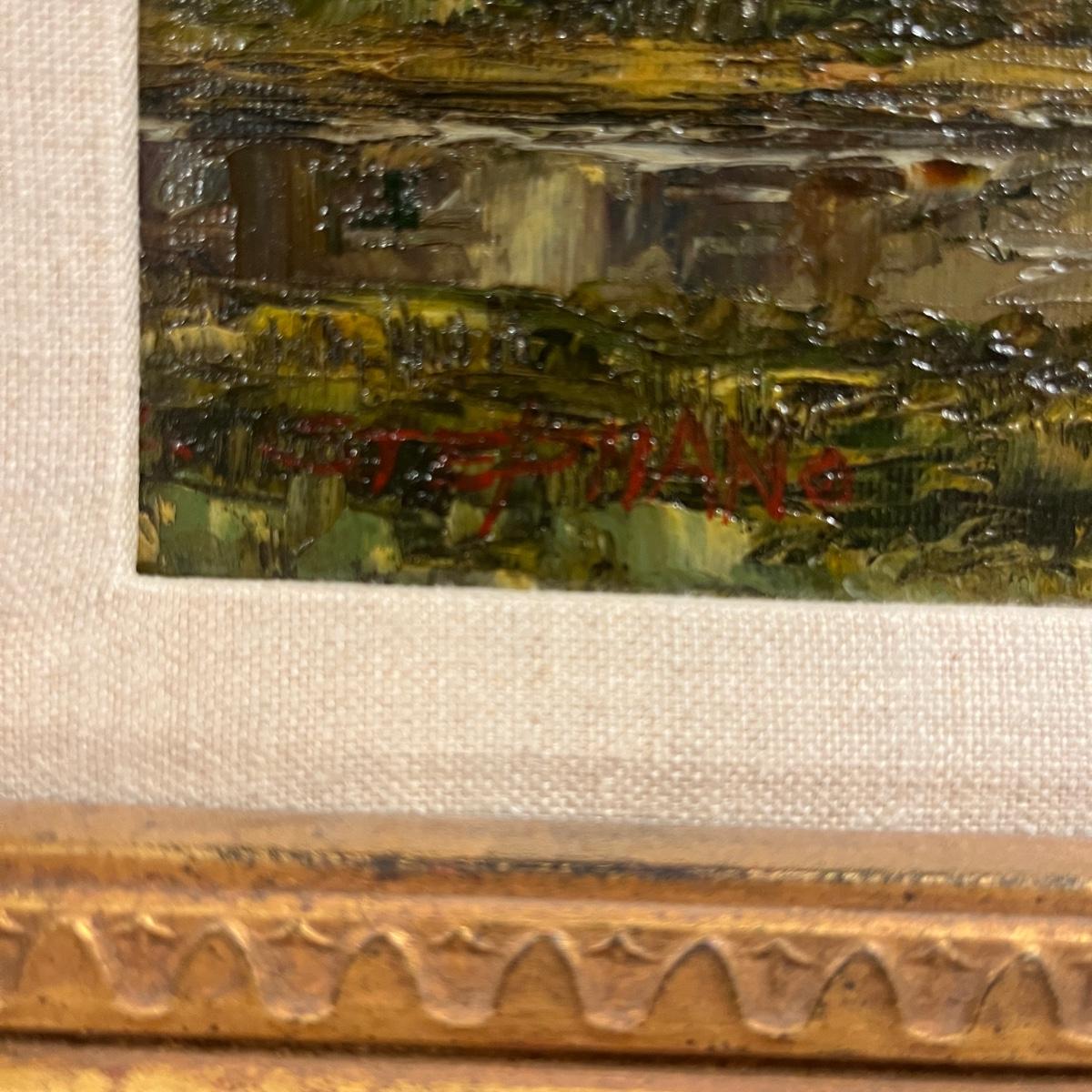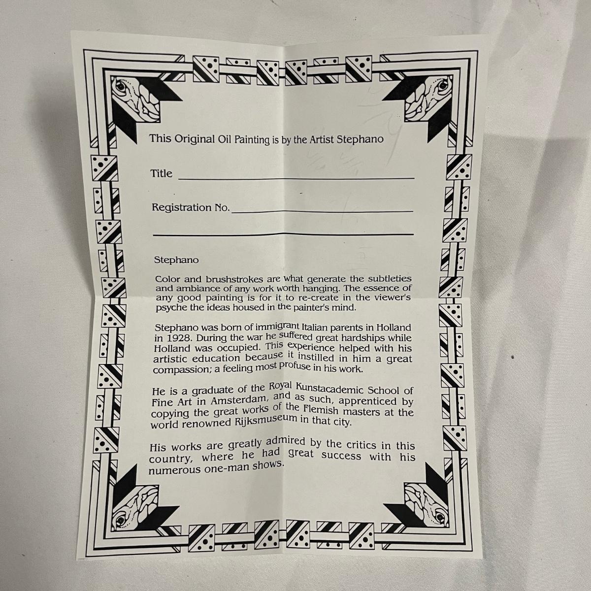This wood framed oil painting is signed by artist Stephano. Signature is difficult to read, but accompanying paperwork offers information about the artist, see image.