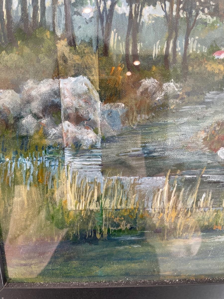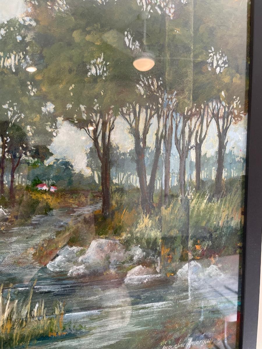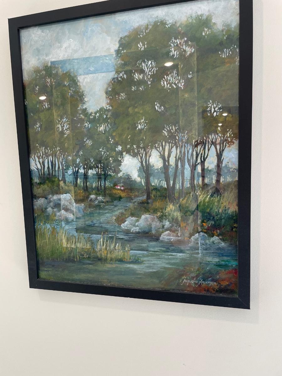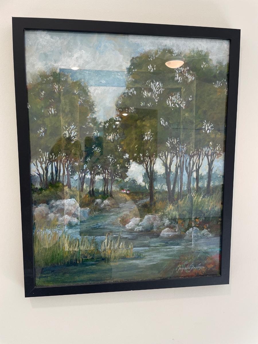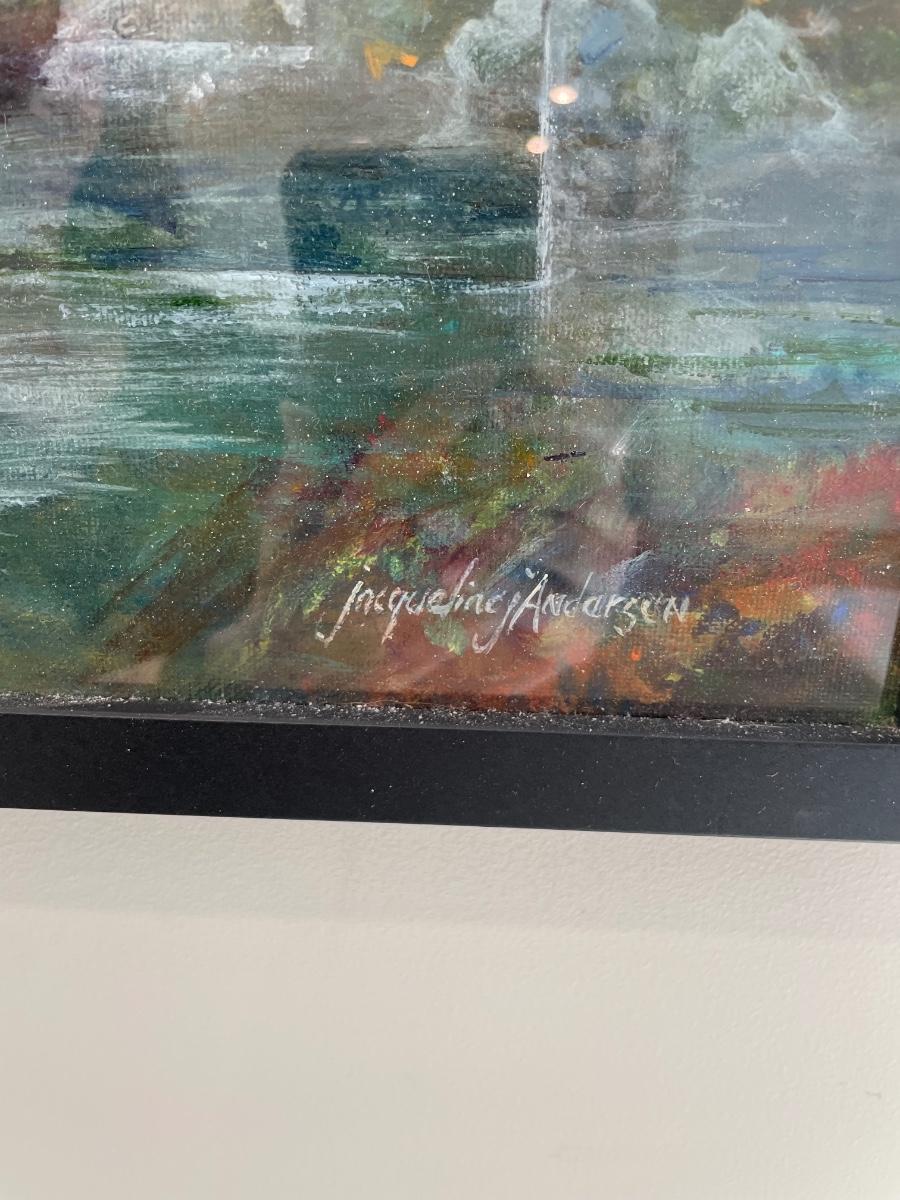 16 by 20 inches in simple black frame with glass. Jackie Anderson is a local artist who taught Art in FPS.