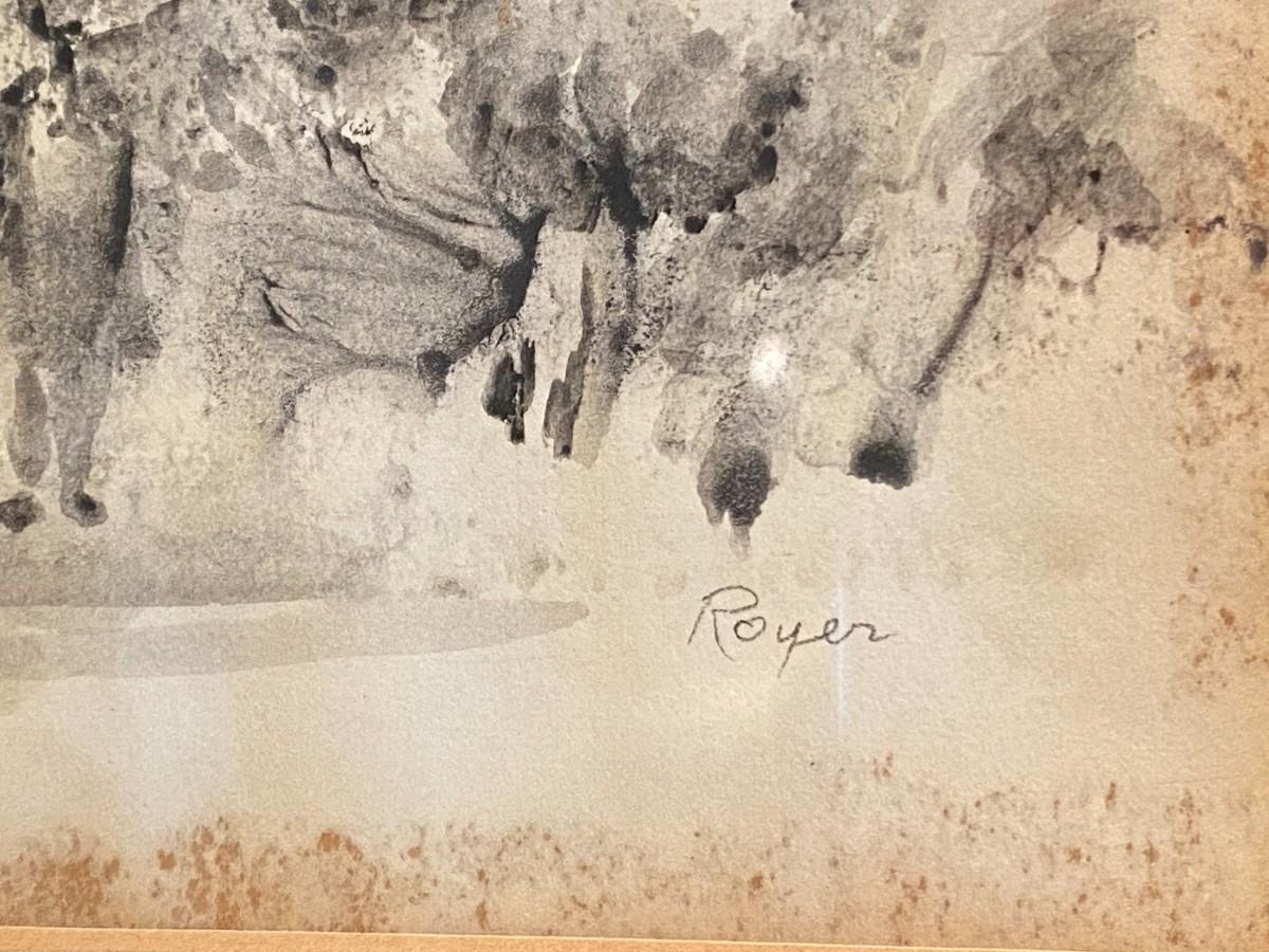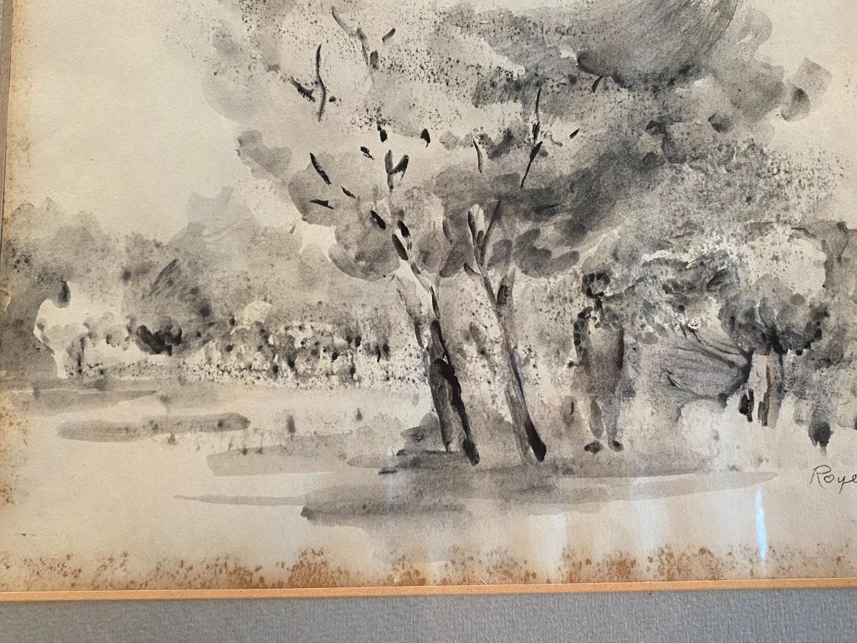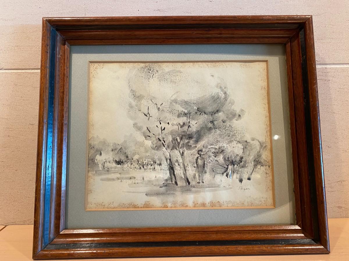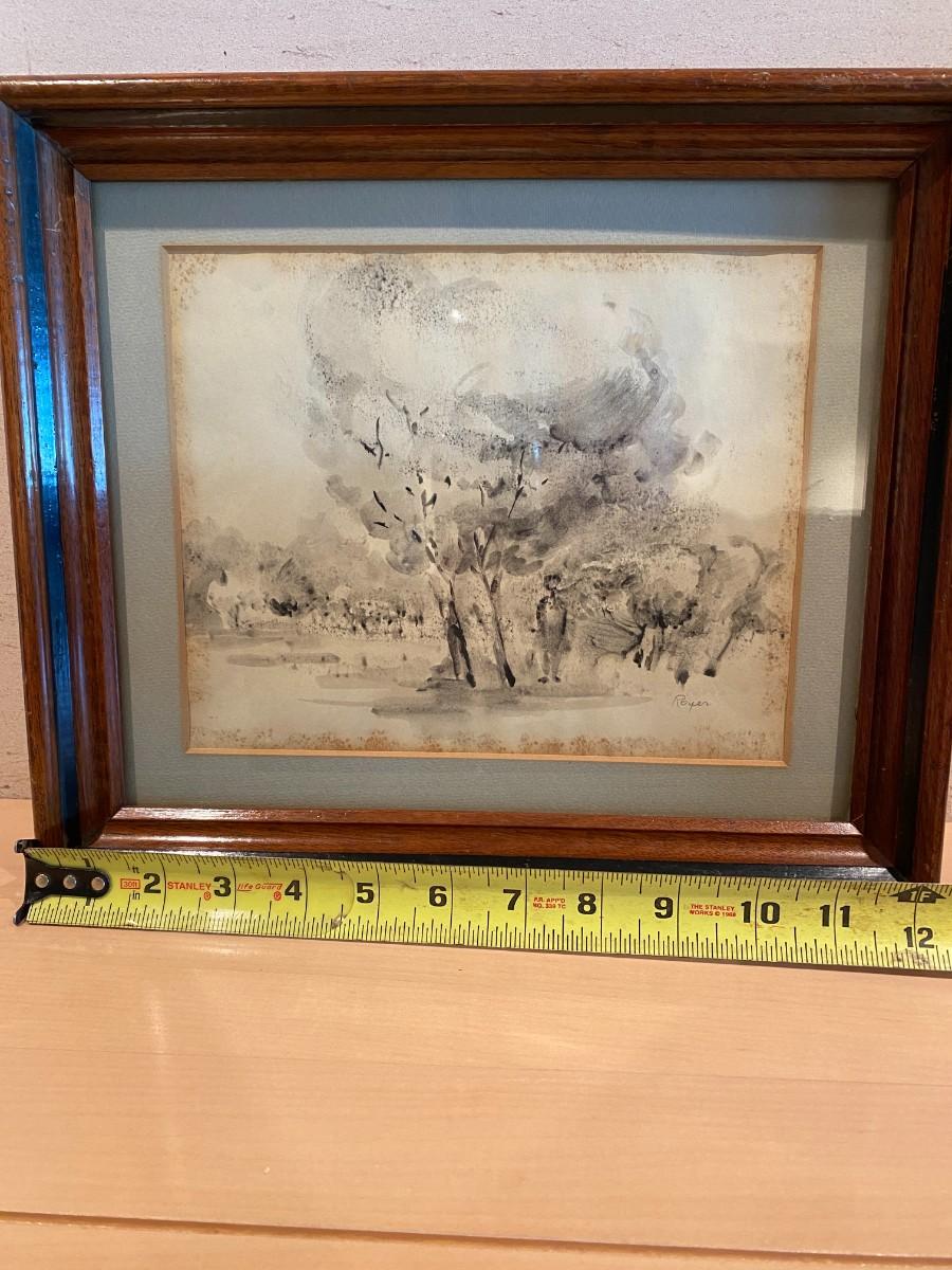 Signed Original Black and White Watercolor of Boy Under Trees by Royer