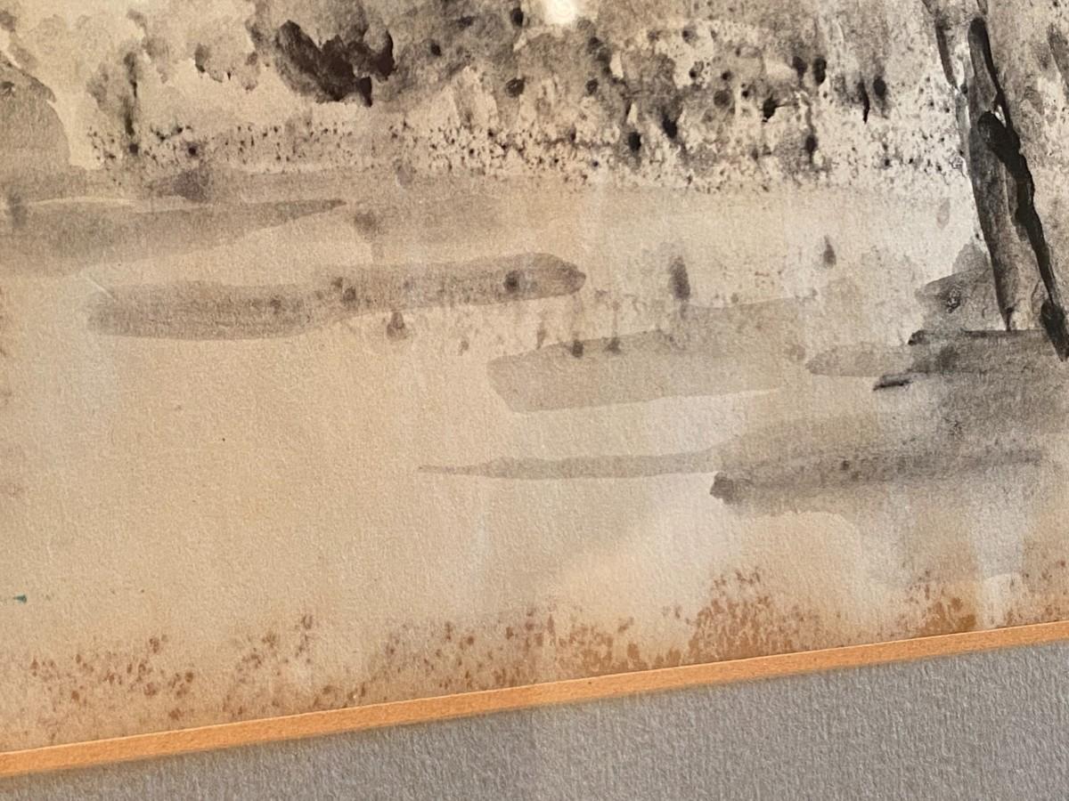 Signed original black and white watercolor painting of a boy standing under a tree in a field of trees. Signed by Royer. Central painting is in good condition, though the edges show signs of discoloration (as seen in photos).