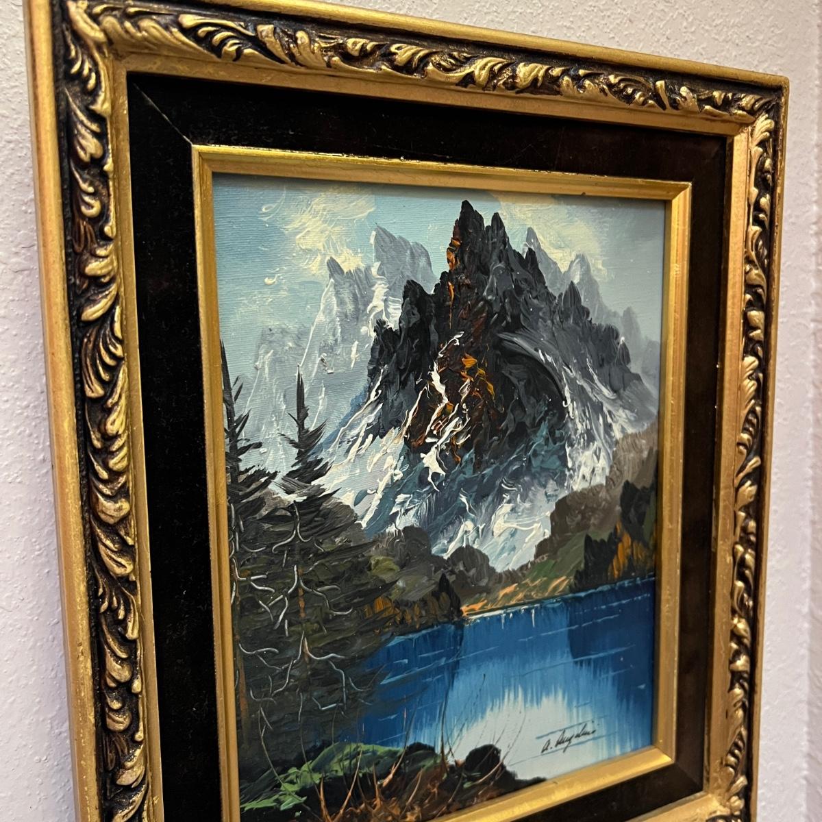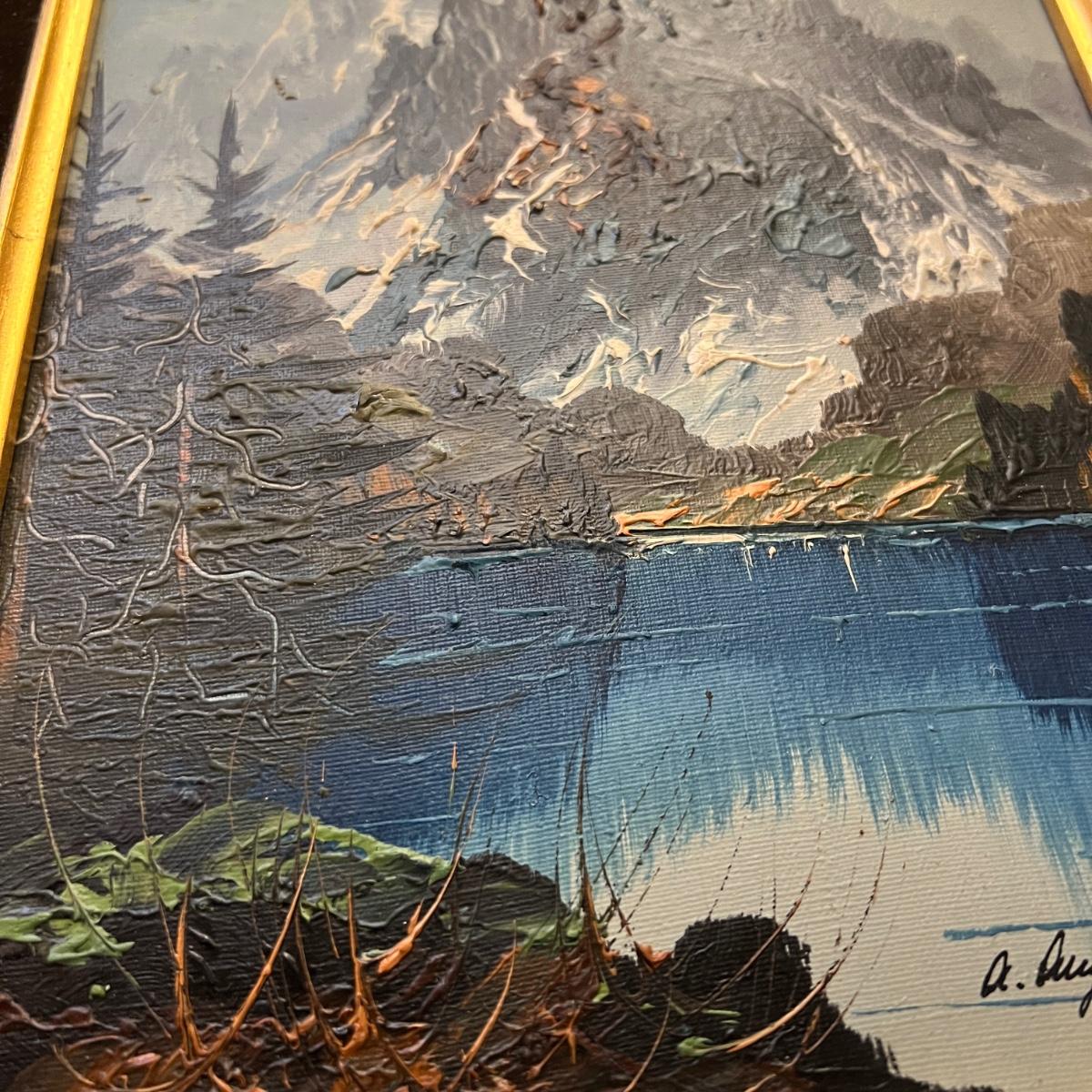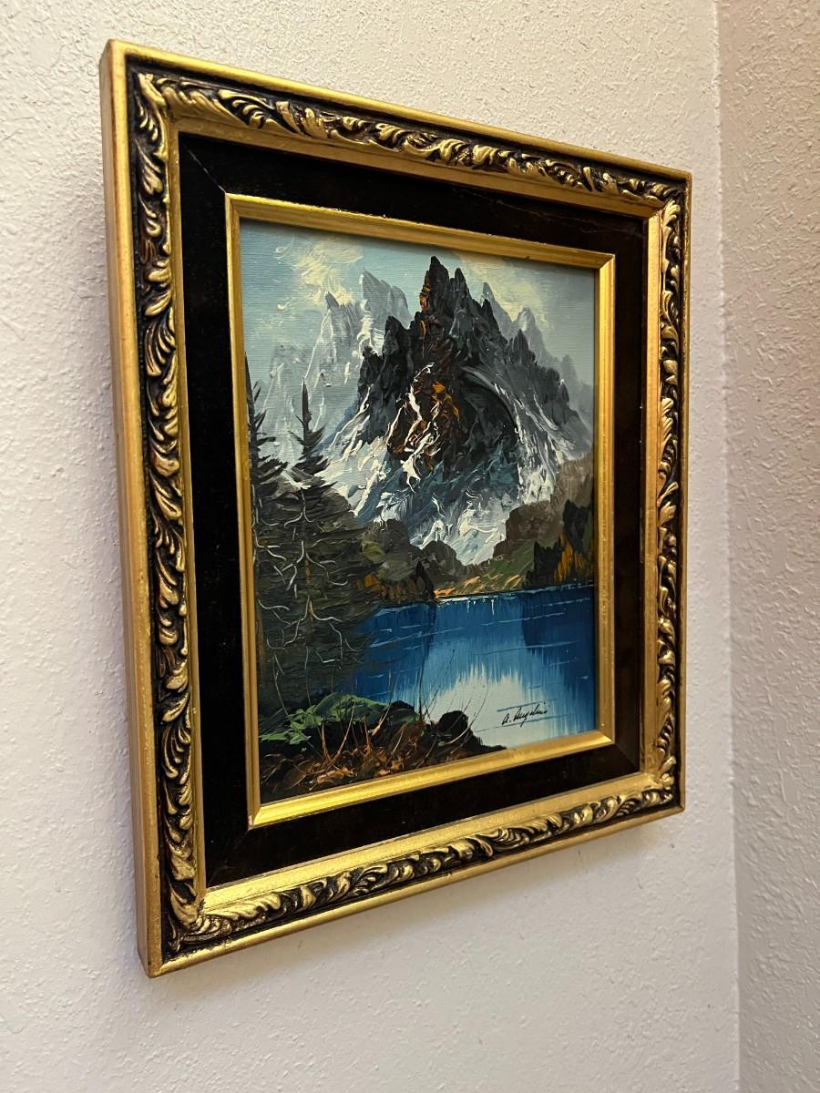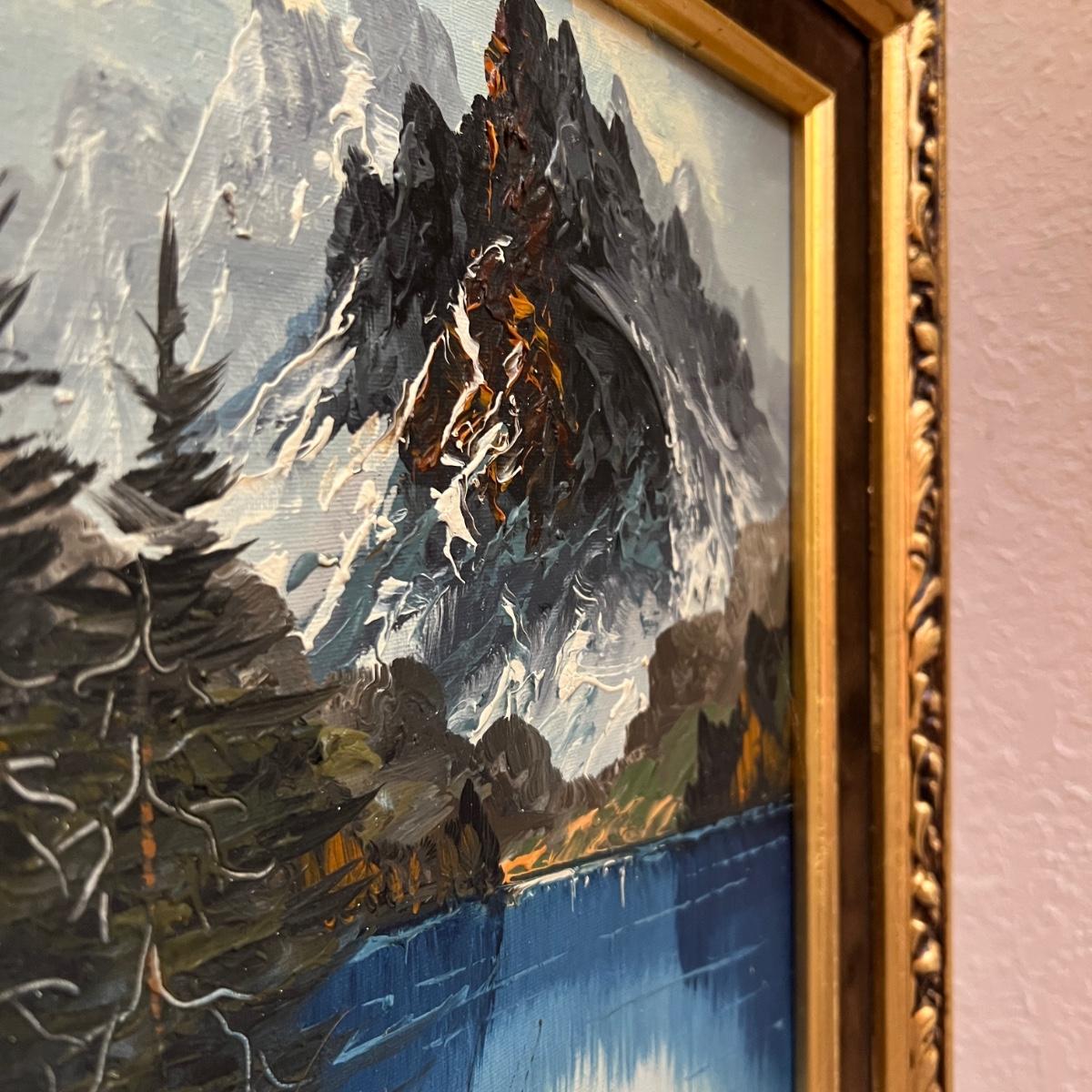 Signed Original Landscape Painting of Mountain and Lake with Partial Snow