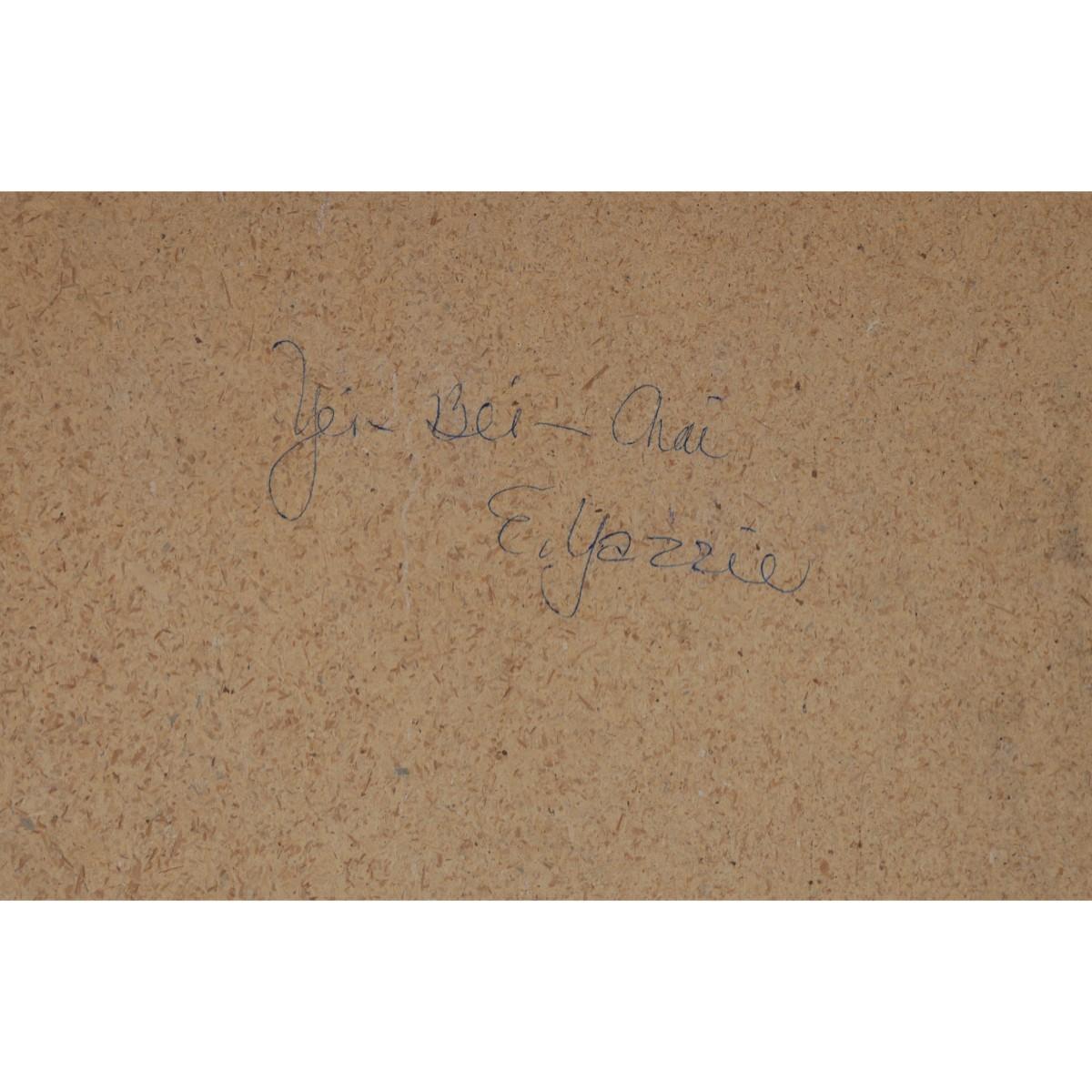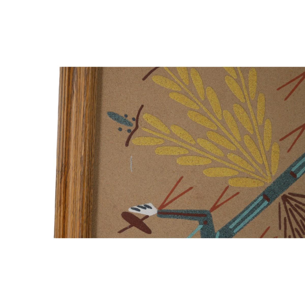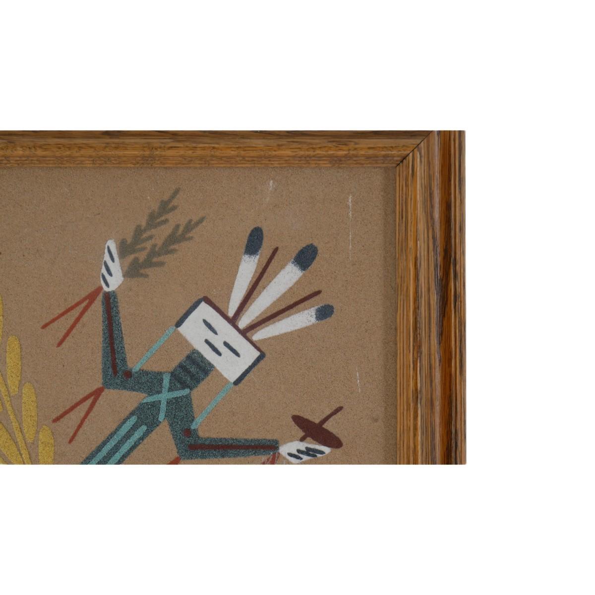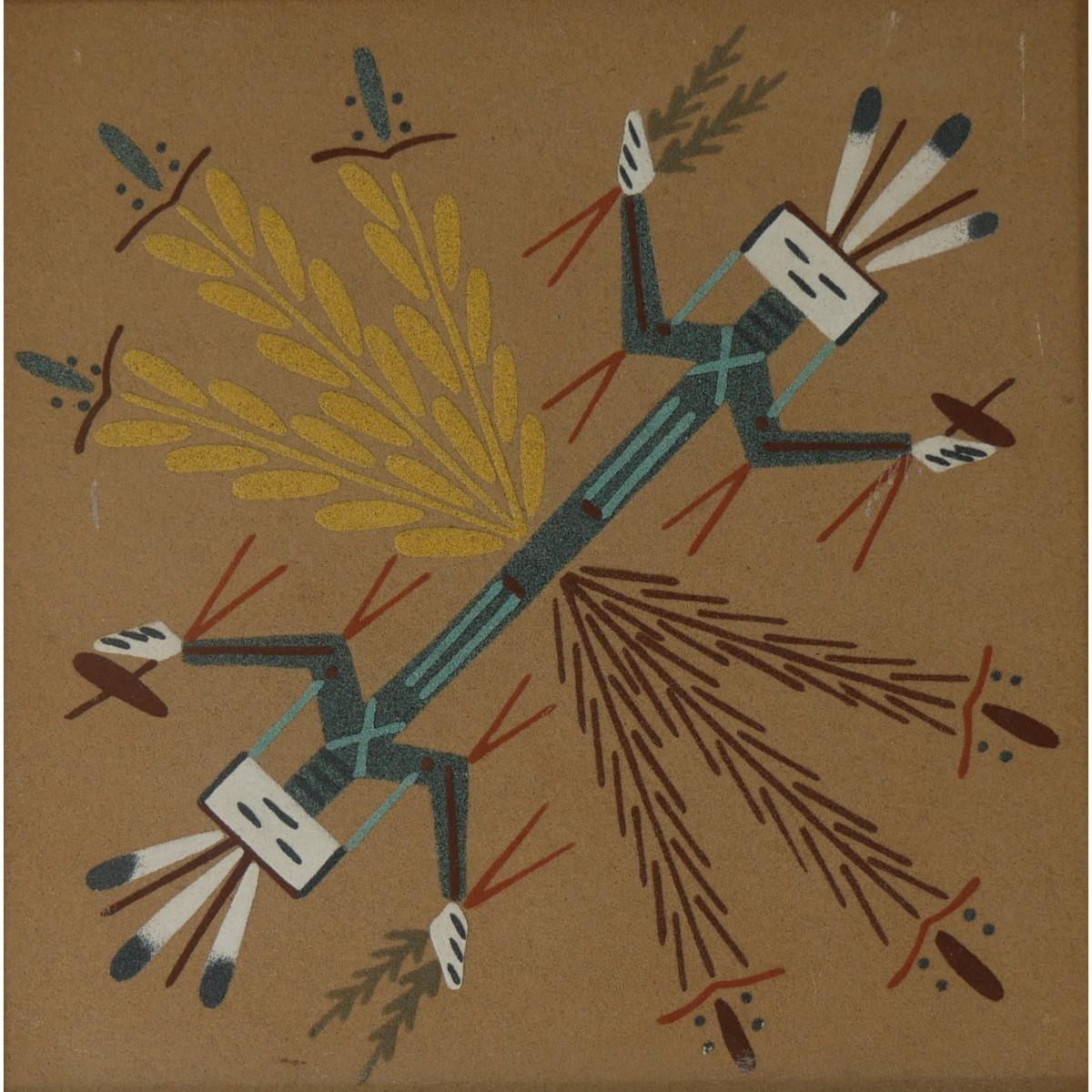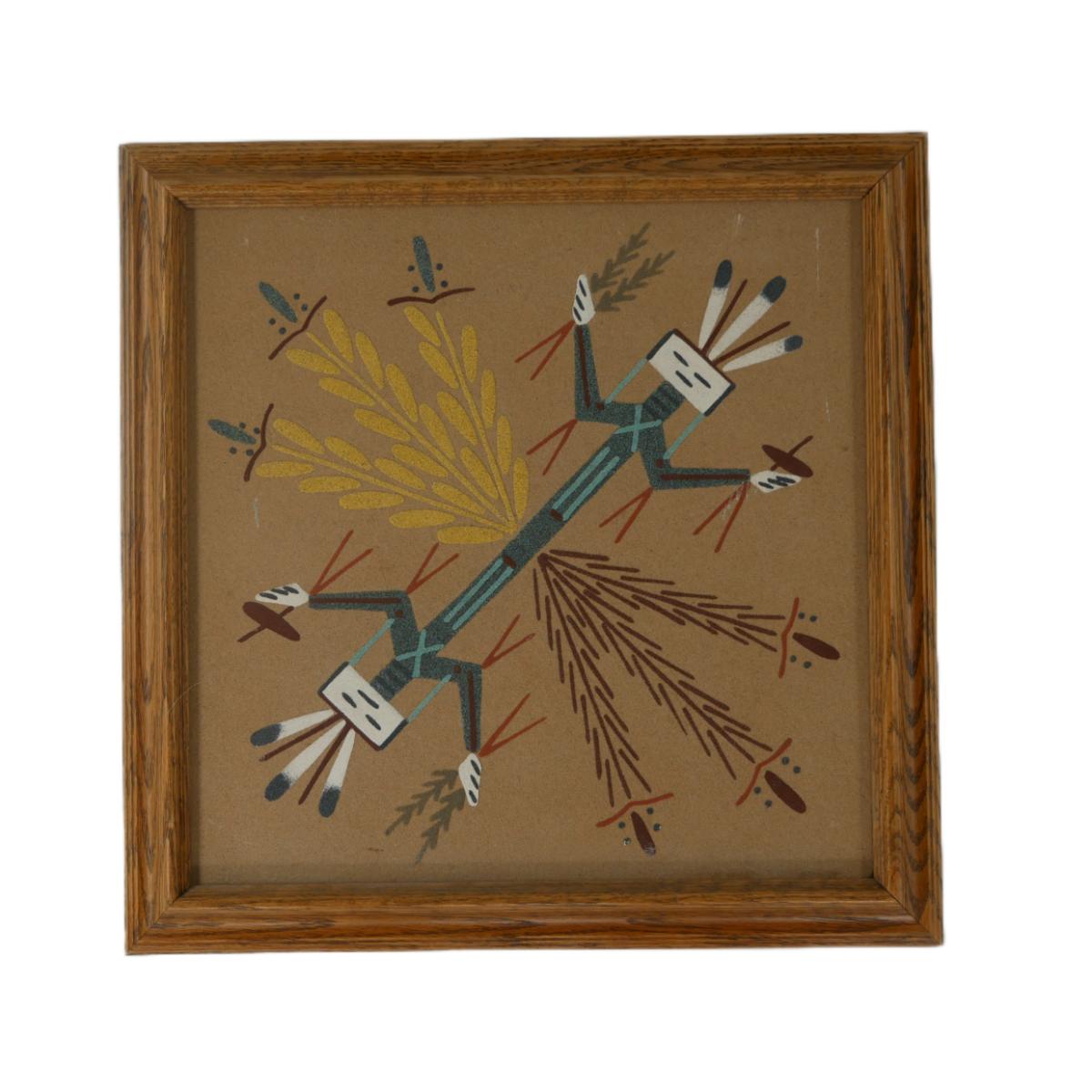 Original Native American sand painting "Yei-Bei-Chai" by E. Yazzie. Art is L 11.75" x H 11.75". Frame is L 14.25" x H 14.25 x D 1.25". Great condition, slight scratching to painting (see photos) Weight is 2 lb 10 oz. (A26)