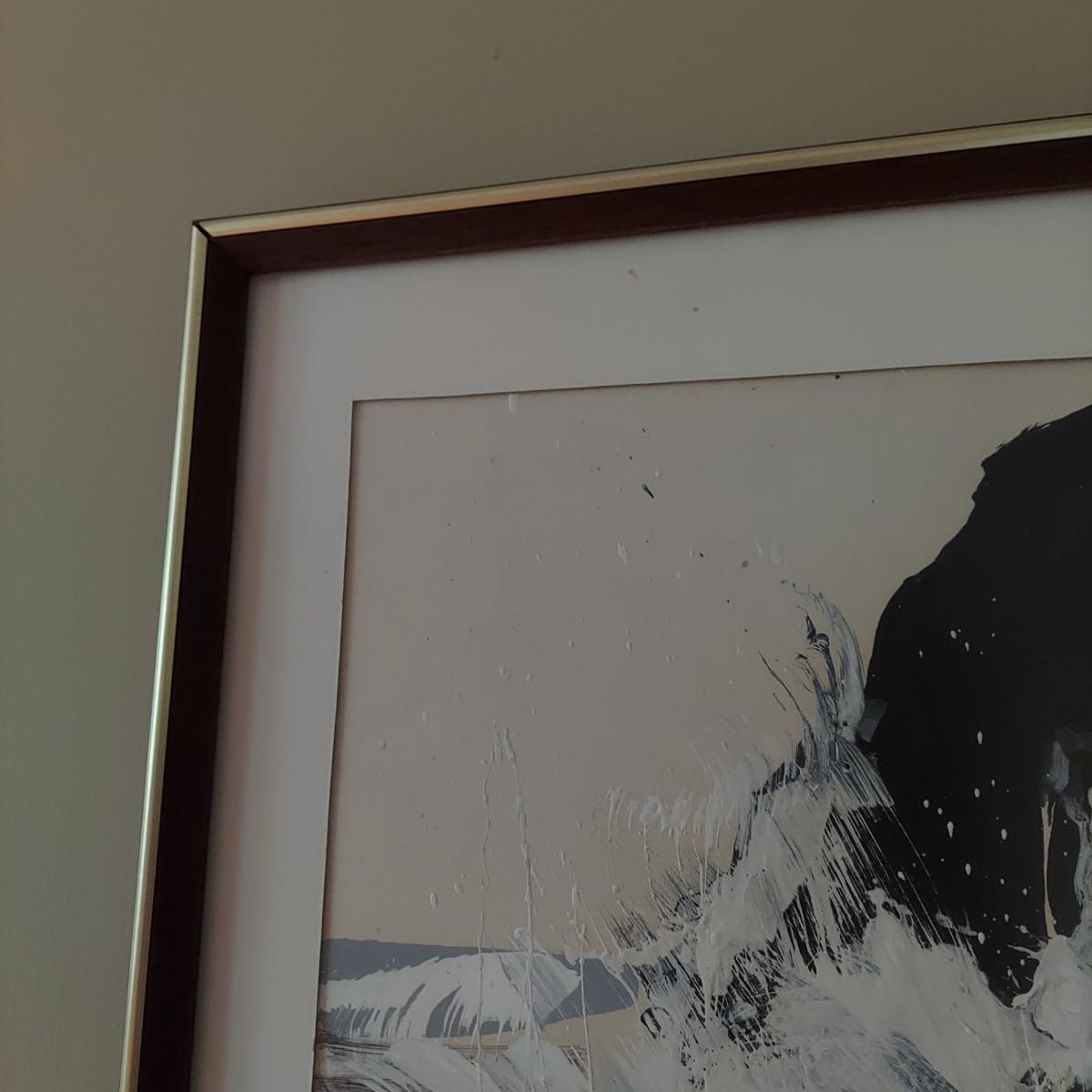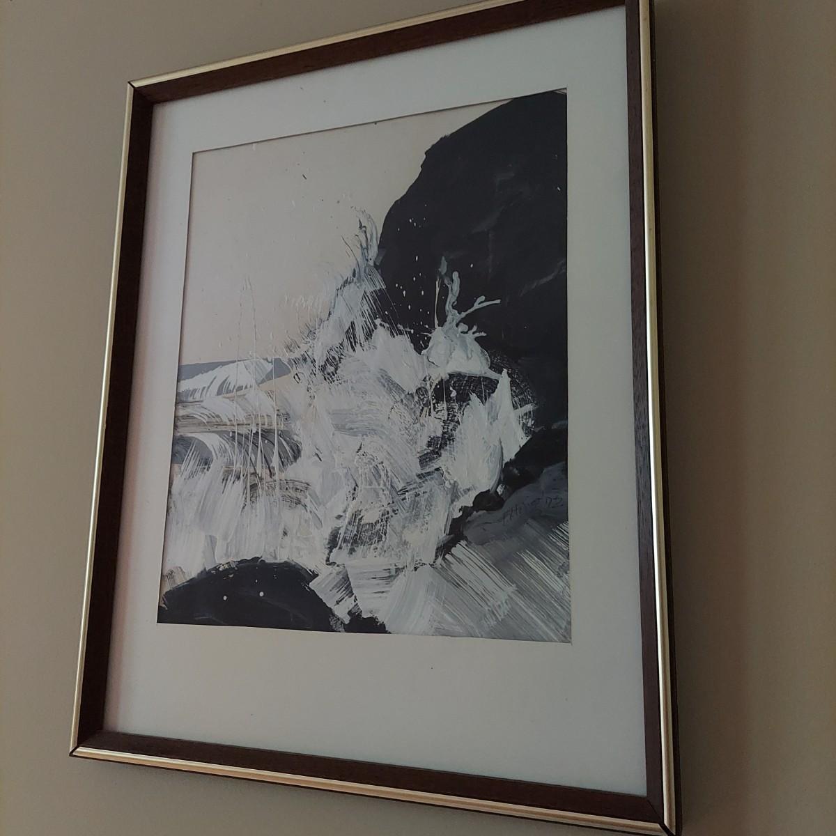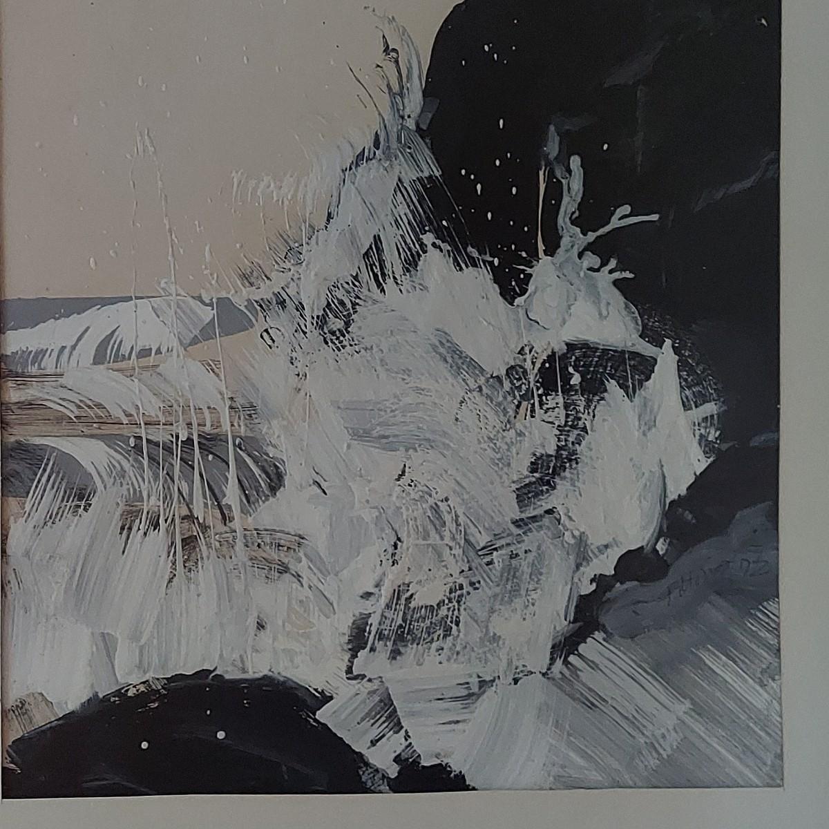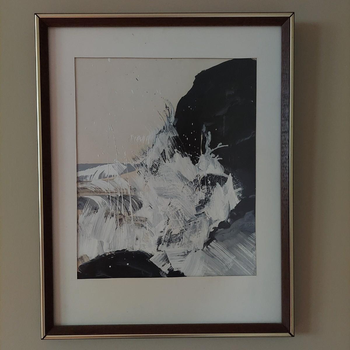 Signed original abstract landscape of ocean waves crashing into rocky shore. Single mat. Wood frame with gold detail. Frame measures approximately 15 x 19"H. Shipping available. Shipping art can be costly. We suggest contacting our preferred local shipping provider, Postage Express, with dimensions and getting an estimate before bidding: (828) 670-5501 or postageexpress@yahoo.com.