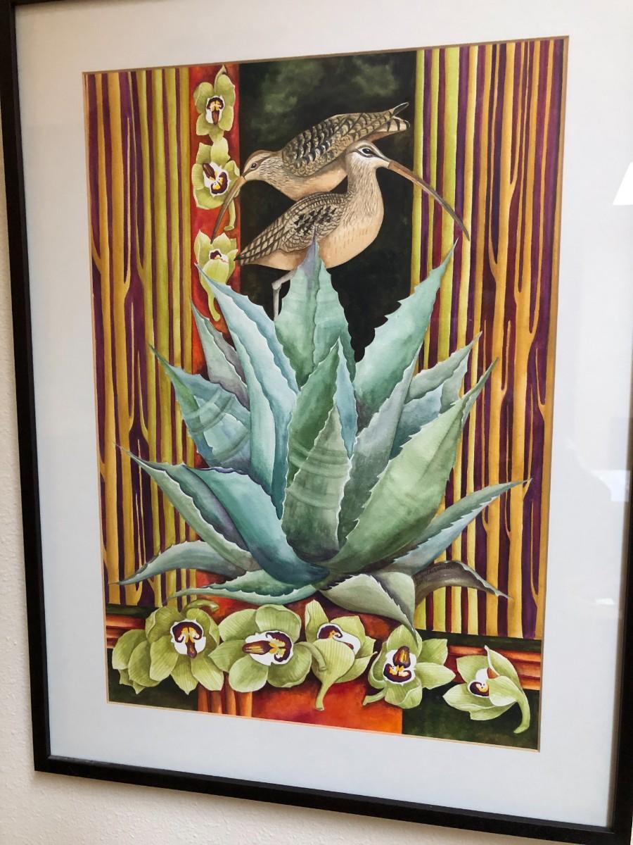 Signed Original Watercolor Art Depicting Birds and Cacti. Beautiful vibrant colors. In very good condition.