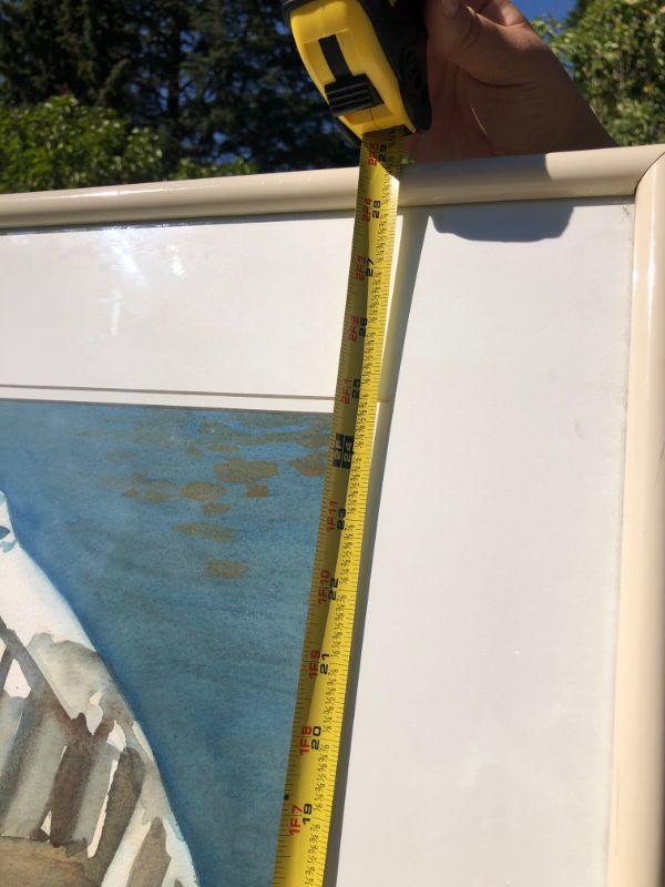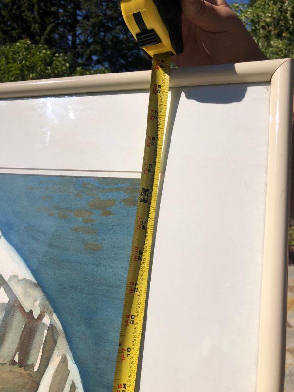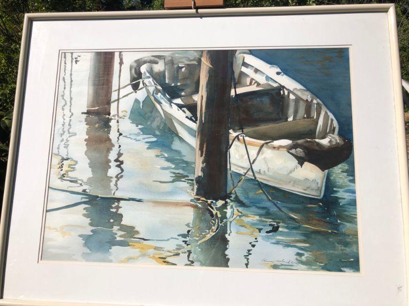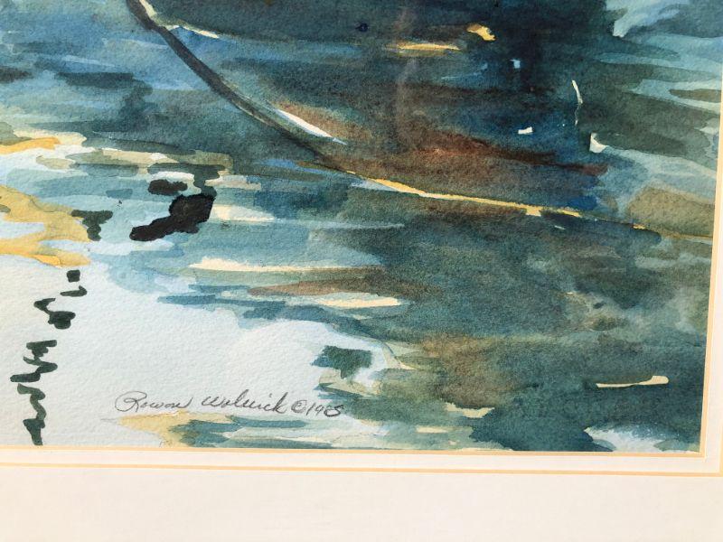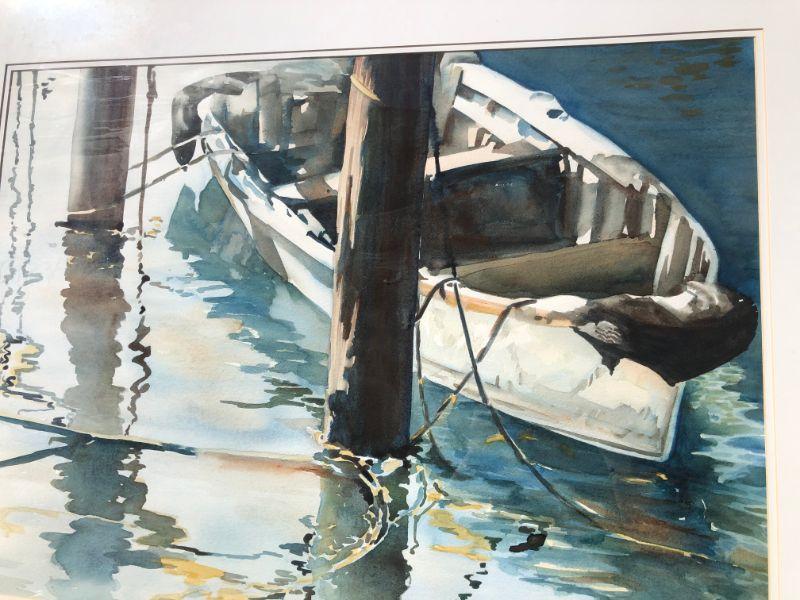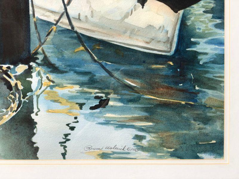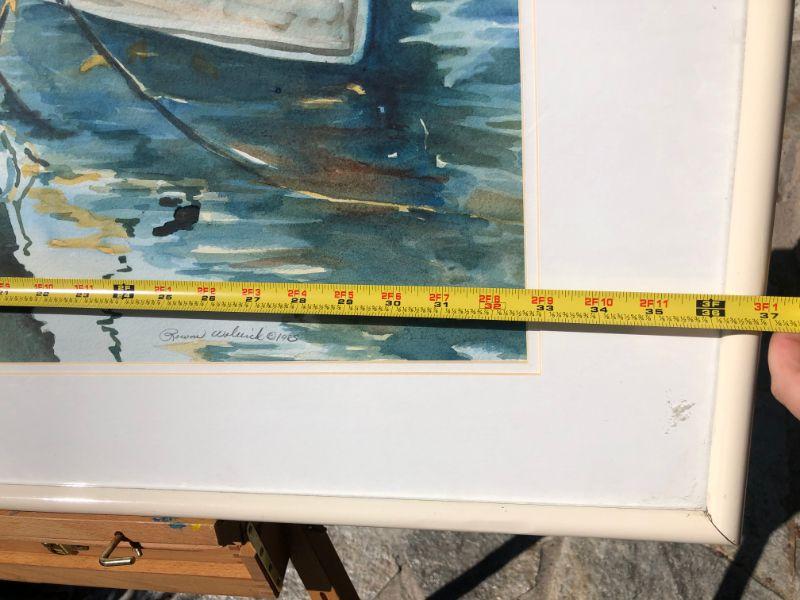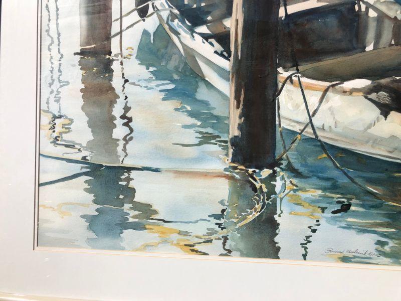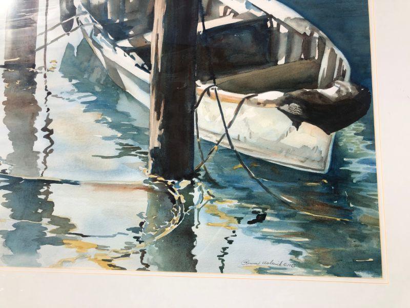 Beautiful watercolor painting of a boat docked in the harbor, with reflective water. Signed by the artist (shown in photo), looks like Rowon Walerick. In very good condition (some water mark on the back paper, but not on the painting or front).