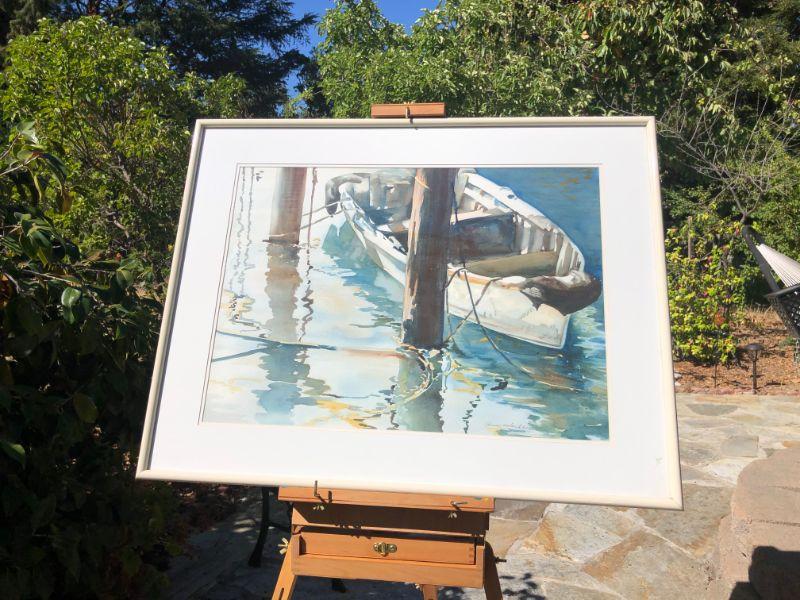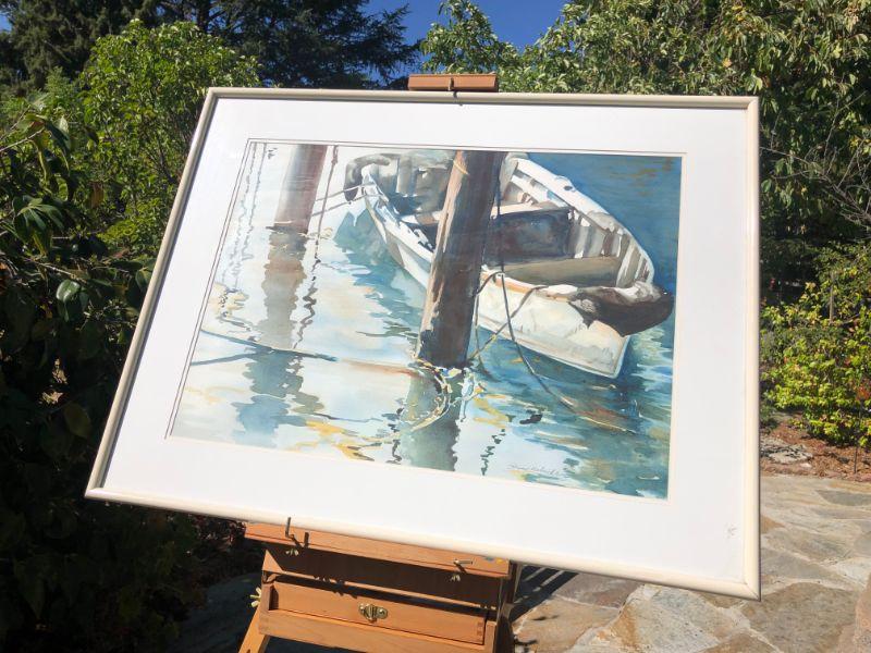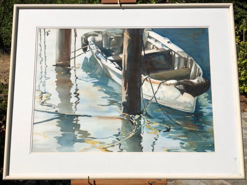 Signed Original Watercolor Boat Docked in Harbor with Reflective Water