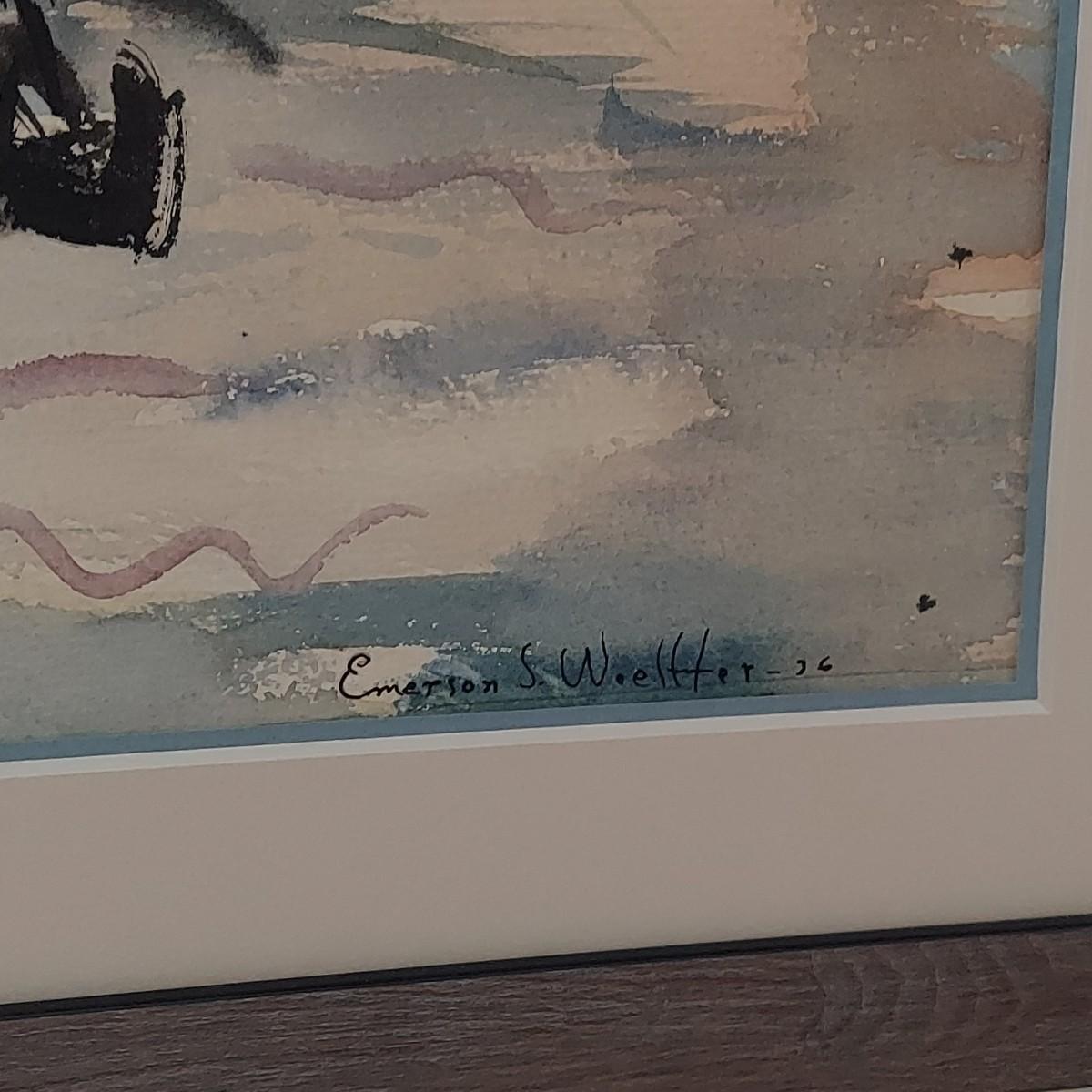 Signed original watercolor by American abstract expressionist artist Emerson Seville Woelffer. Date with signature appears to read '36. Doubled matted and custom framed with a wooden frame. Frame measures approximately 24" x 1" x 20"H. Shipping available. Shipping can be costly. We suggest contacting our preferred local shipping provider, Postage Express, with dimensions and getting an estimate before bidding: (828) 670-5501 or postageexpress@yahoo.com.