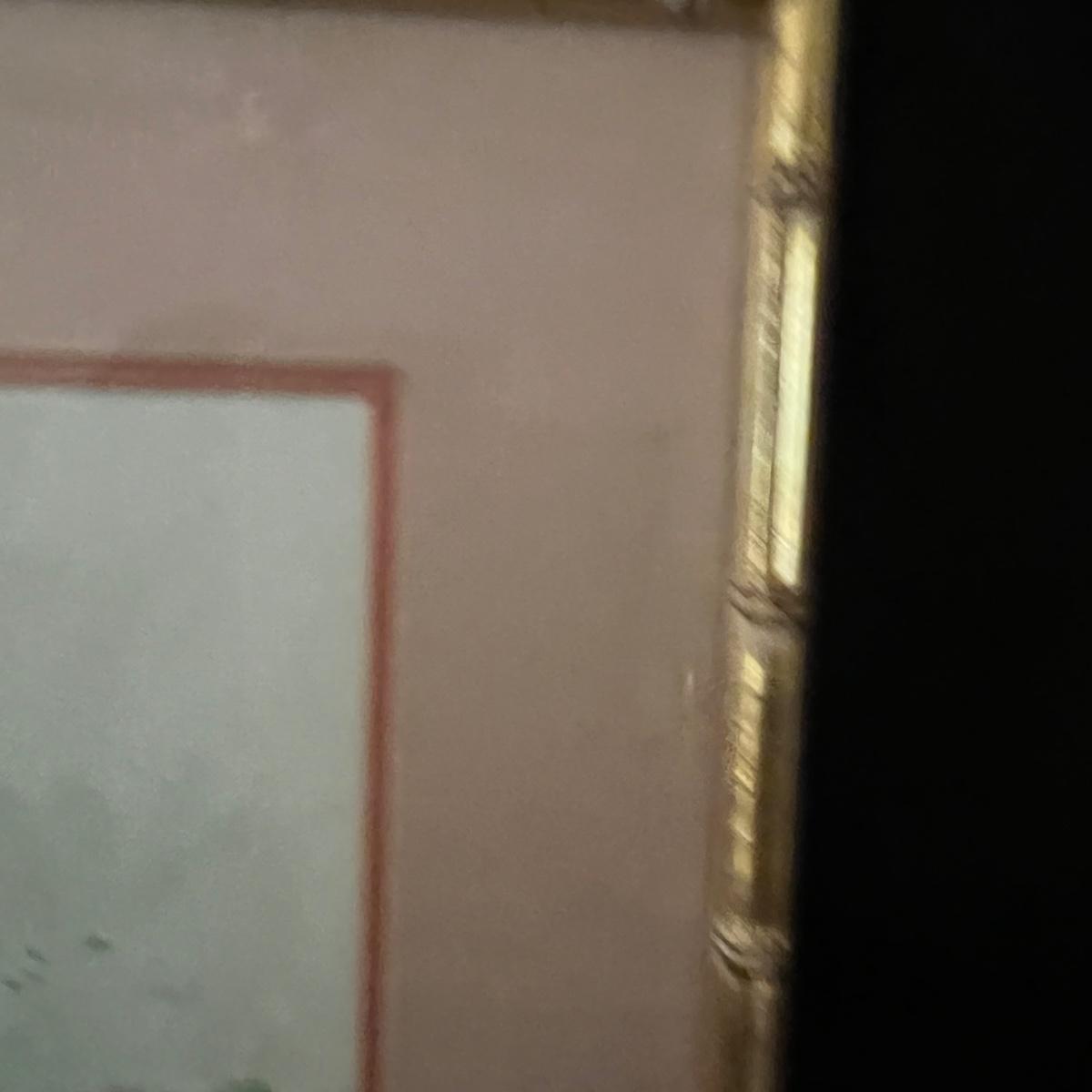 Framed floral water color, signed by the artist Painting framed in two shades of pink matting and a gold bamboo-style wooden frame. Measures 24.5” x 1” x 18.75”H.