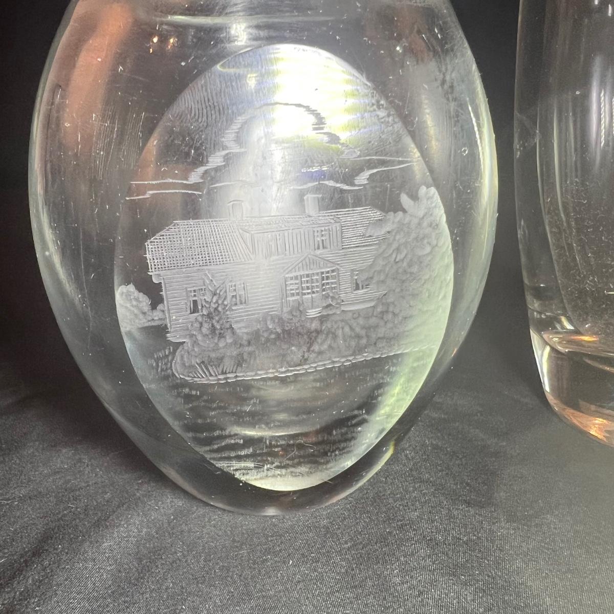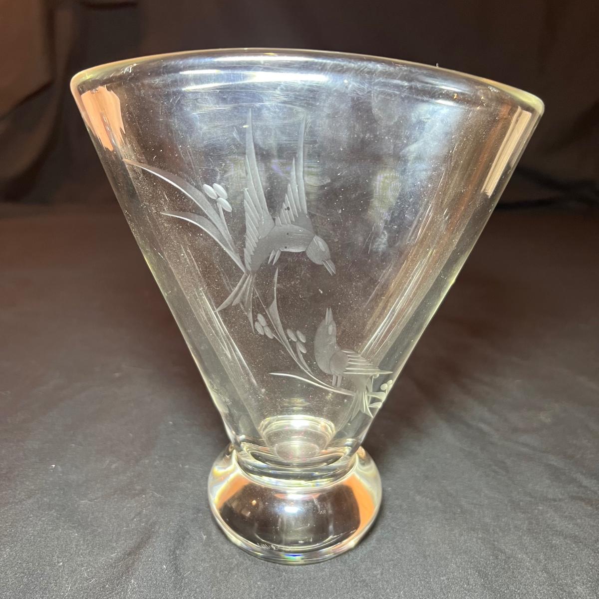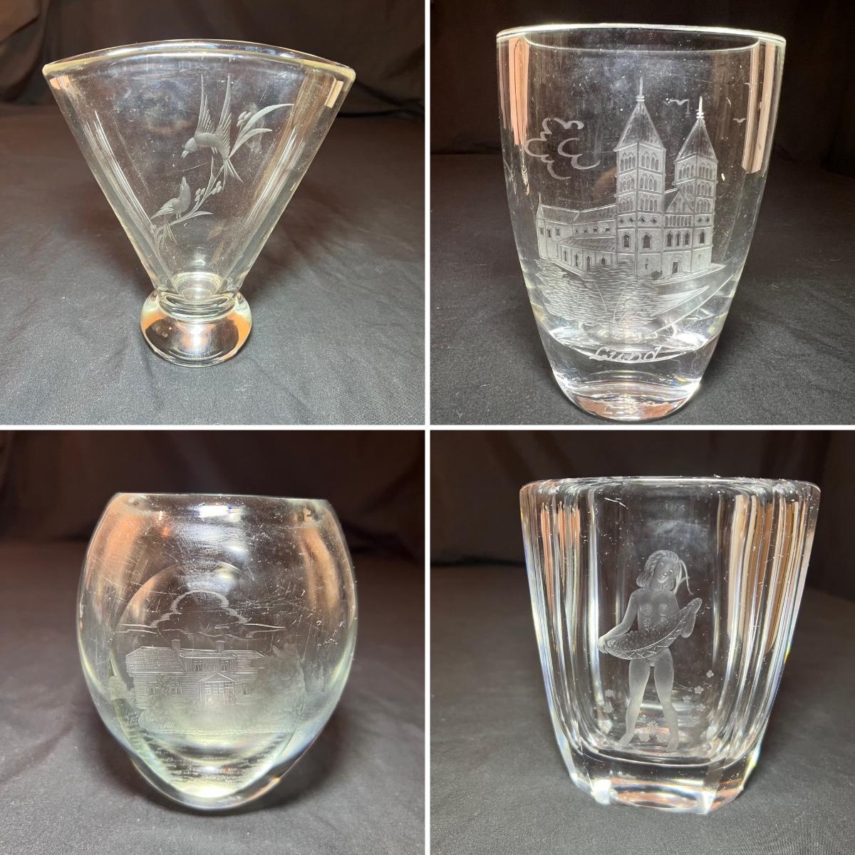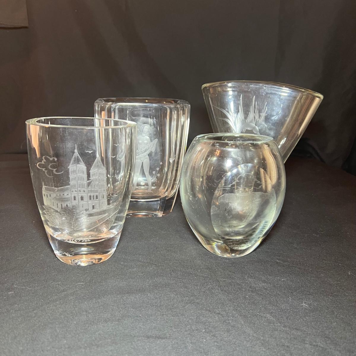 Four glass vases includes a vase with an etched woman has the artists signature and Orrefors. The two vases with etched buildings are possibly also Orrefors but only a signature was found on one, see image. The tallest vase with birds has no marking, it measures 6” x 2.5” x 7”H.